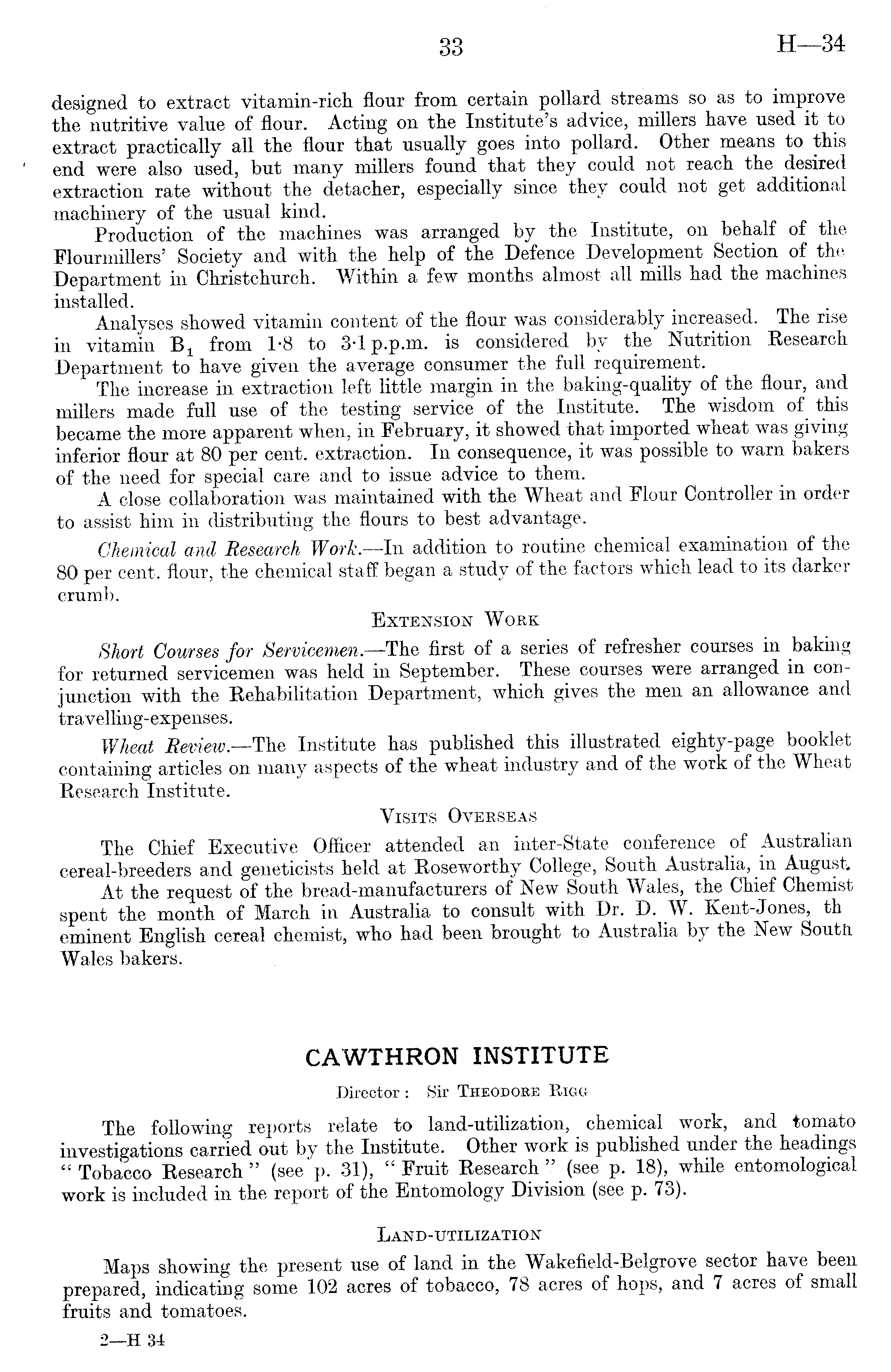 designed to extract vitamin-rich, flour from certain pollard streams so as to improve the nutritive value of flour. Acting on tlie Institute's advice, millers have used it to extract practically all the flour that usually goes into pollard. Other means to this end were also used, but many millers found that they could not reach the desired extraction rate without the detacher, especially since they could not get additional machinery of the usual kind. Production of the machines was arranged by the Institute, on behalf of the Flourmillers' Society and with the help of the Defence Development Section of'the Department in Christchurch. Within a few months almost all mills had the machines installed. Analyses showed vitamin content of the flour was considerably increased. The rise in vitamin B t from 1-8 to 3-lp.p.m. is considered by the Nutrition Research Department to have given the average consumer the full requirement. The increase in extraction left little margin in the baking-quality of the flour, and millers made full use of the testing service of the Institute. The wisdom of this became the more apparent when, in February, it showed that imported wheat was giving inferior flour at 80 per cent, extraction. In consequence, it was possible to warn bakers of the need for special care and to issue advice to them. A close collaboration was maintained with the Wheat and Flour Controller in order to assist him in distributing the flours to best advantage. Chemical and ReseaTch Work. —In addition to routine chemical examination of the 80 per cent, flour, the chemical staff began a study of the factors which lead to its darker crumb. Extension Work Short Courses for Servicemen. —The first of a series of refresher courses in baking for returned servicemen was held in September. These courses were arranged in conjunction with the Rehabilitation Department, which gives the men an allowance and travelling-expenses. Wheat Review.—The Institute has published this illustrated eighty-page booklet containing articles on many aspects of the wheat industry and of the work of the Wheat Research Institute. Visits Overseas The Chief Executive Officer attended an inter-State conference of Australian cereal-breeders and geneticists held at Roseworthy College, South Australia, in August. At the request of the bread-manufacturers of New South Wales, the Chief Chemist spent the month of March in Australia to consult with Dr. D. W. Kent-Jones, th eminent English cereal chemist, who had been brought to Australia by the New South Wales bakers. CAWTHRON INSTITUTE Director : Sir Theodore Rigg The following reports relate to land-utilization, chemical work, and tomato investigations carried out by the Institute. Other work is published under the headings " Tobacco Research " (see p. 31), " Fruit Research " (see p. 18), while entomological work is included in the report of the Entomology Division (see p. 73). Land-utilization Maps showing the present use of land in the Wakefield-Belgrove sector have been prepared, indicating some 102 acres of tobacco, 78 acres of hops, and 7 acres of small fruits and tomatoes.