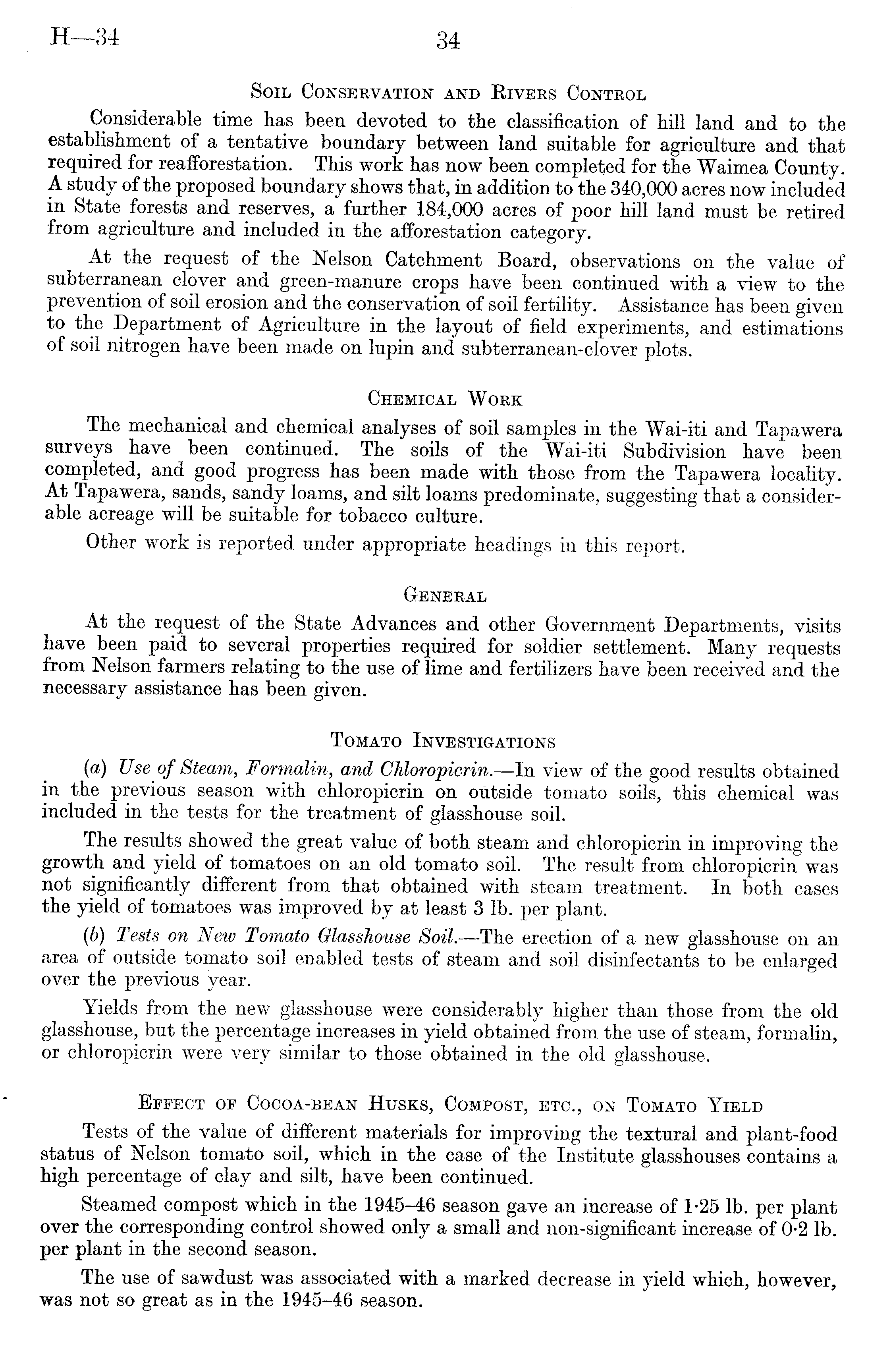 Soil Conservation and Rivers Control Considerable time has been devoted to the classification of hill land and to the establishment of a tentative boundary between land suitable for agriculture and that required for reafforestation. This work has now been completed for the Waimea County. A study of the proposed boundary shows that, in addition to the 340,000 acres now included in State forests and reserves, a further 184,000 acres of poor hill land must be retired from agriculture and included in the afforestation category. At the request of the Nelson Catchment Board, observations on the value of subterranean clover and green-manure crops have been continued with a view to the prevention of soil erosion and the conservation of soil fertility. Assistance has been given to the Department of Agriculture in the layout of field experiments, and estimations of soil nitrogen have been made on lupin and subterranean-clover plots. Chemical Work The mechanical and chemical analyses of soil samples in the Wai-iti and Tapawera surveys have been continued. The soils of the Wai-iti Subdivision have been completed, and good progress has been made with those from the Tapawera locality. At Tapawera, sands, sandy loams, and silt loams predominate, suggesting that a considerable acreage will be suitable for tobacco culture. Other work is reported under appropriate headings in this report. General At the request of the State Advances and other Government Departments, visits have been paid to several properties required for soldier settlement. Many requests from Nelson farmers relating to the use of lime and fertilizers have been received and the necessary assistance has been given. Tomato Investigations (a) Use of Steam, Formalin, and Chloropicrin.—ln view of the good results obtained in the previous season with chloropicrin on outside tomato soils, this chemical was included in the tests for the treatment of glasshouse soil. The results showed the great value of both steam and chloropicrin in improving the growth and yield of tomatoes on an old tomato soil. The result from chloropicrin was not significantly different from that obtained with steam treatment. In both cases the yield of tomatoes was improved by at least 3 lb. per plant. (b) Tests on New Tomato Glasshouse Soil.—The erection of a new glasshouse on an area of outside tomato soil enabled tests of steam and soil disinfectants to be enlarged over the previous year. Yields from the new glasshouse were considerably higher than those from the old glasshouse, but the percentage increases in yield obtained from the use of steam, formalin, or chloropicrin were very similar to those obtained in the old glasshouse. Effect of Cocoa-bean Husks, Compost, etc., on Tomato Yield Tests of the value of different materials for improving the textural and plant-food status of Nelson tomato soil, which in the case of the Institute glasshouses contains a high percentage of clay and silt, have been continued. Steamed compost which in the 1945-46 season gave an increase of 1-25 lb. per plant over the corresponding control showed only a small and non-significant increase of 0-2 lb. per plant in the second season. The use of sawdust was associated with a marked decrease in yield which, however, was not so great as in the 1945-46 season.