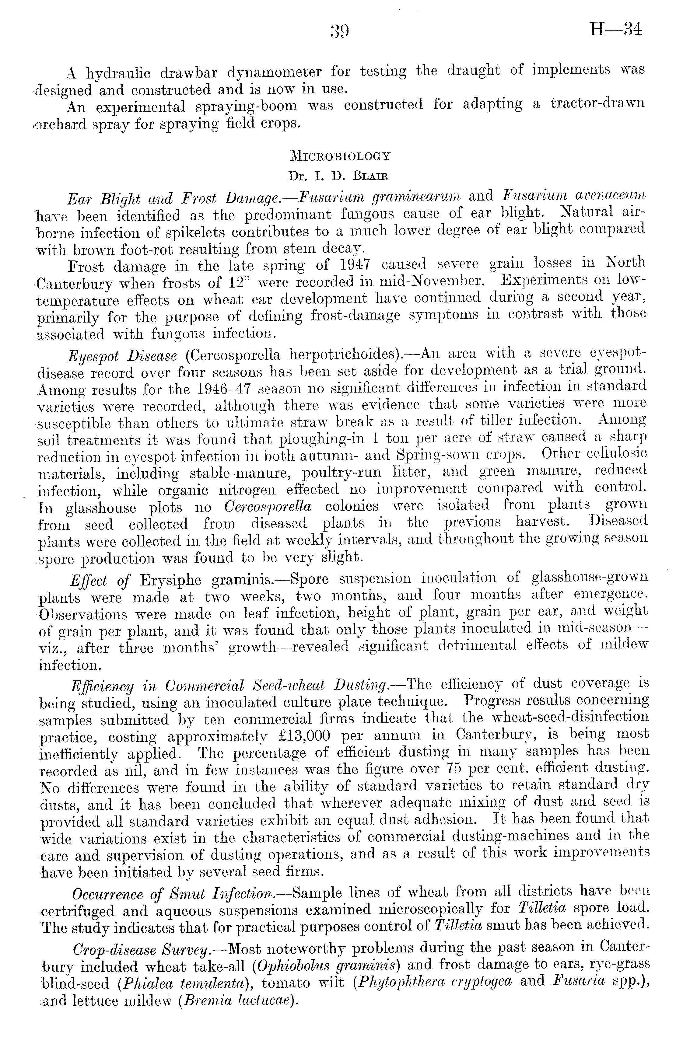 A hydraulic drawbar dynamometer for testing the draught of implements was •designed and constructed and is now in use. An experimental spraying-boom was constructed for adapting a tractor-drawn orchard spray for spraying field crops. Microbiology Dr. I. D. Blair Ear Blight and Frost Damage.—Fusarium graminearum and Fusarium avenaceum Tiave been identified as the predominant fungous cause of ear blight. Natural air'borne infection of spikelets contributes to a much lower degree of ear blight compared with brown foot-rot resulting from stem decay. Frost damage in the late spring of 1947 caused severe grain losses m North -Canterbury when frosts of 12° were recorded in mid-November. Experiments on lowtemperature effects on wheat ear development have continued during a second year, primarily for the purpose of defining frost-damage symptoms in contrast with those .associated with fungous infection. Eyespot Disease (Cercosporella herpotrichoides). —An area with a severe eyespotdisease record over four seasons has been set aside for development as a trial ground. Among results for the 1946—47 season no significant differences in infection in standard varieties were recorded, although there was evidence that some varieties were more susceptible than others to ultimate straw break as a result of tiller infection. Among .soil treatments it was found that ploughing-in 1 ton per acre of straw caused a sharp reduction in eyespot infection in both autumn- and Spring-sown crops. Other cellulosic materials, including stable-manure, poultry-run litter, and green manure, reduced infection, while organic nitrogen effected no improvement compared with control. In glasshouse plots no Cercosporella colonies were isolated from plants grown from seed collected from diseased plants in the previous harvest. Diseased plants were collected in the field at weekly intervals, and throughout the growing season spore production was found to be very slight. Effect of Erysiphe graminis.—Spore suspension inoculation of glasshouse-grown plants were made at two weeks, two months, and four months after emergence. Observations were made on leaf infection, height of plant, grain per ear, and weight of grain per plant, and it was found that only those plants inoculated in mid-season—-viz., after three months' growth —revealed significant detrimental effects of mildew infection. Efficiency in Commercial Seed-wheat Dusting.—The efficiency of dust coverage is being studied, using an inoculated culture plate technique. Progress results concerning .samples submitted by ten commercial firms indicate that the wheat-seed-disinfection practice, costing approximately £13,000 per annum in Canterbury, is being most inefficiently applied. The percentage of efficient dusting in many samples has been recorded as nil, and in few instances was the figure over 75 per cent, efficient dusting. No differences were found in the ability of standard varieties to retain standard dry -dusts, and it has been concluded that wherever adequate mixing of dust and seed is provided all standard varieties exhibit an equal dust adhesion. It has been found that wide variations exist in the characteristics of commercial dusting-machines and in the care and supervision of dusting operations, and as a result of this work improvements have been initiated by several seed firms. Occurrence of Smut Infection. —Sample lines of wheat from all districts have been •certrifuged and aqueous suspensions examined microscopically for Tilletia spore load. The study indicates that for practical purposes control of Tilletia smut has been achieved. Crop-disease Survey. —Most noteworthy problems during the past season in Canterbury included wheat take-all (Ophiobolus graminis) and frost damage to ears, rye-grass Mind-seed (Phialea temulenta), tomato wilt (Phytophthera cryptogea and Fusaria spp.), .-and lettuce mildew (Bremia lactucae).