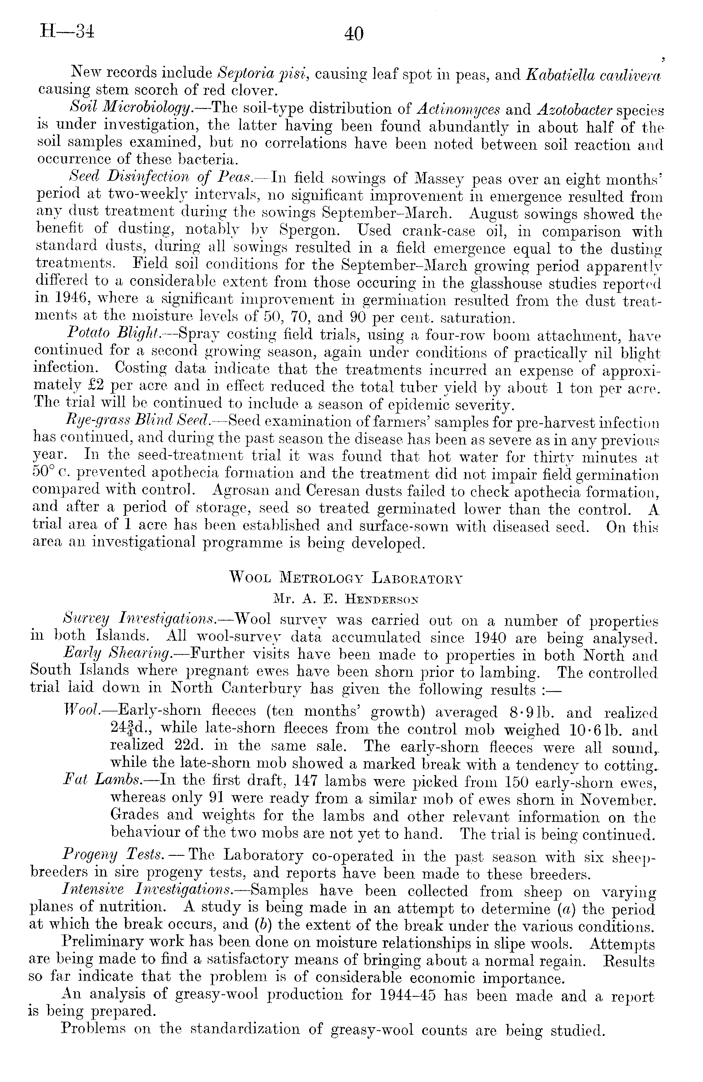 > New records include Septoria pisi, causing leaf spot in peas, and Kabatiella caulivera causing stem scorch of red clover. Soil Microbiology.—The soil-type distribution of Actinomyces and Azotobacter species is under investigation, the latter having been found abundantly in about half of the soil samples examined, but no correlations have been noted between soil reaction and occurrence of these bacteria. Seed Disinfection of Peas.—ln field sowings of Massey peas over an eight months' period at two-weekly intervals, no significant improvement in emergence resulted from any dust treatment during the sowings September-March. August sowings showed the benefit of dusting, notably by Spergon. Used crank-case oil, in comparison with standard dusts, during all sowings resulted in a field emergence equal to the dusting treatments. Field soil conditions for the September-March growing period apparently differed to a considerable extent from those occuring in the glasshouse studies reported in 1946, where a significant improvement in germination resulted from the dust treatments at the moisture levels of 50, 70, and 90 per cent, saturation. Potato Blight.—Spray costing field trials, using a four-row boom attachment, havecontinued for a second growing season, again under conditions of practically nil blight infection. Costing data indicate that the treatments incurred an expense of approximately £2 per acre and in effect reduced the total tuber yield by about 1 ton per acre. The trial will be continued to include a season of epidemic severity. Rye-grass Blind Seed.—Seed examination of farmers' samples for pre-harvest infection has continued, and during the past season the disease has been as severe as in any previous year. In the seed-treatment trial it was found that hot water for thirty minutes at 50° c. prevented apothecia formation and the treatment did not impair field germination compared with control. Agrosan and Ceresan dusts failed to check apothecia formation, and after a period of storage, seed so treated germinated lower than the control. A trial area of 1 acre has been established and surface-sown with diseased seed. On this area an investigational programme is being developed. Wool Metrology Laboratory Mr. A. E. Henderson Survey Investigations.—Wool survey was carried out on a number of properties in both Islands. All wool-survey data accumulated since 1940 are being analysed. Early Shearing.—Further visits have been made to properties in both North and South Islands where pregnant ewes have been shorn prior to lambing. The controlled trial laid down in North Canterbury has given the following results : Wool.—Early-shorn fleeces (ten months' growth) averaged 8- 9 lb. and realized 24£-d., while late-shorn fleeces from the control mob weighed 10-6 lb. and realized 22d. in the same sale. The early-shorn fleeces were all sound,, while the late-shorn mob showed a marked break with a tendency to cotting.. Fat Lambs.—ln the first draft, 147 lambs were picked from 150 early-shorn ewes, whereas only 91 were ready from a similar mob of ewes shorn in November. Grades and weights for the lambs and other relevant information on the behaviour of the two mobs are not yet to hand. The trial is being continued. Progeny Tests. The Laboratory co-operated in the past season with six sheepbreeders in sire progeny tests, and reports have been made to these breeders. Intensive Investigations.—Samples have been collected from sheep on varying planes of nutrition. A study is being made in an attempt to determine (a) the period at which the break occurs, and (6) the extent of the break under the various conditions. Preliminary work has been done on moisture relationships in slipe wools. Attempts are being made to find a satisfactory means of bringing about a normal regain. Results so far indicate that the problem is of considerable economic importance. An analysis of greasy-wool production for 1944-45 has been made and a report is being prepared. Problems on the standardization of greasy-wool counts are being studied.