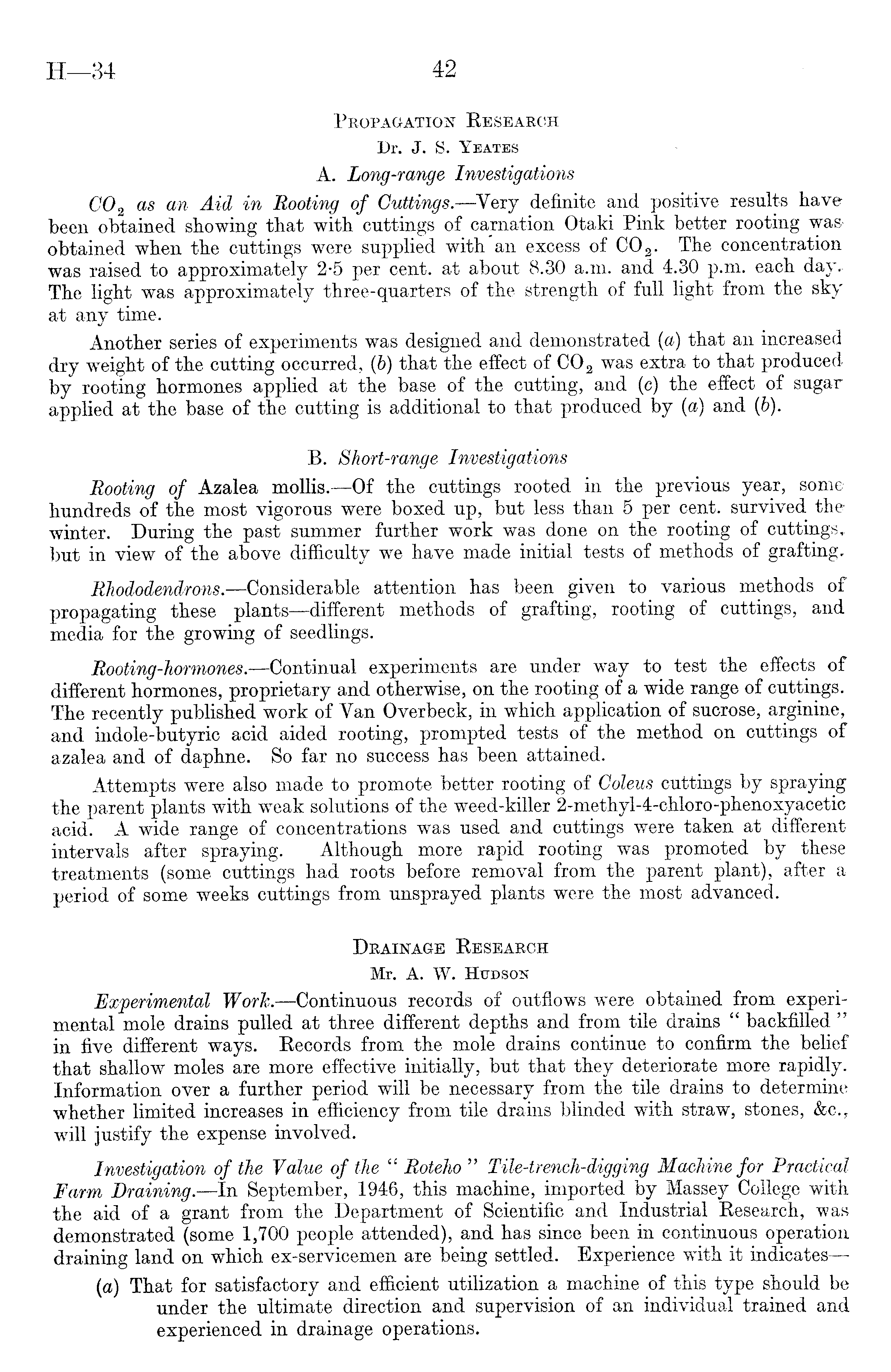 Propagation Research Dr. J. S. Yeates A. Long-range Investigations C0 2 as an Aid in Rooting of Cuttings.—Very definite and positive results have been obtained showing that with cuttings of carnation Otaki Pink better rooting wasobtained when the cuttings were supplied with an excess of C0 2 . The concentration was raised to approximately 2-5 per cent, at about 8.30 a.m. and 4.30 p.m. each day. The light was approximately three-quarters of the strength of full light from the sky at any time. Another series of experiments was designed and demonstrated (a) that an increased dry weight of the cutting occurred, (b) that the effect of C0 2 was extra to that produced by rooting hormones applied at the base of the cutting, and (c) the effect of sugar applied at the base of the cutting is additional to that produced by (a) and (6). B. Short-range Investigations Rooting of Azalea mollis.—Of the cuttings rooted in the previous year, some hundreds of the most vigorous were boxed up, but less than 5 per cent, survived the winter. During the past summer further work was done on the rooting of cuttings, but in view of the above difficulty we have made initial tests of methods of grafting. Rhododendrons. —Considerable attention has been given to various methods of propagating these plants —different methods of grafting, rooting of cuttings, and media for the growing of seedlings. Rooting-hormones.—Continual experiments are under way to test the effects of different hormones, proprietary and otherwise, on the rooting of a wide range of cuttings. The recently published work of Yan Overbeck, in which application of sucrose, arginine, and indole-butyric acid aided rooting, prompted tests of the method on cuttings of azalea and of daphne. So far no success has been attained. Attempts were also made to promote better rooting of Coleus cuttings by spraying the parent plants with weak solutions of the weed-killer 2-methyl-4-chloro-phenoxyacetic acid. A wide range of concentrations was used and cuttings were taken at different intervals after spraying. Although more rapid rooting was promoted by these treatments (some cuttings had roots before removal from the parent plant), after a period of some weeks cuttings from unsprayed plants were the most advanced. Drainage Research Mr. A. W. Hudson jExperimental Ifork. —Continuous records of outflows were obtained from experimental mole drains pulled at three different depths and from tile drains " backfilled " in five different ways. Records from the mole drains continue to confirm the belief that shallow moles are more effective initially, but that they deteriorate more rapidly. Information over a further period will be necessary from the tile drains to determine whether limited increases in efficiency from tile drains blinded with straw, stones, &c., will justify the expense involved. Investigation of the Value of the " Roteho " Tile-trench-digging Machine for Practical Farm Draining.—ln September, 1946, this machine, imported by Massey College with the aid of a grant from the Department of Scientific and Industrial Research, was demonstrated (some 1,700 people attended), and has since been in continuous operation draining land on which ex-servicemen are being settled. Experience with it indicates—(a) That for satisfactory and efficient utilization a machine of this type should be under the ultimate direction and supervision of an individual trained and experienced in drainage operations.