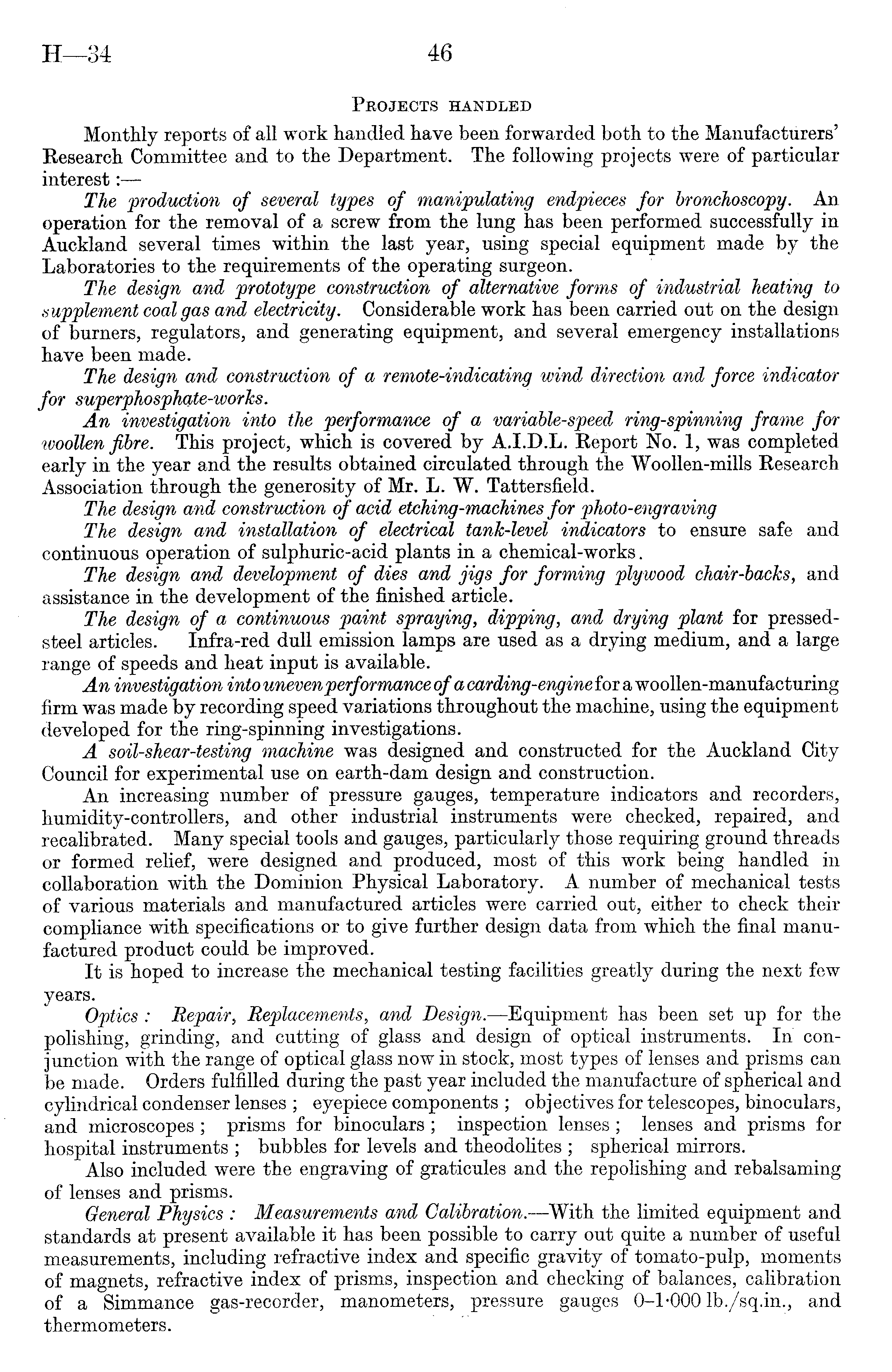 Projects handled Monthly reports of all work handled have been forwarded both to the Manufacturers' Research Committee and to the Department. The following projects were of particular interest: — The production of several types of manipulating endpieces for bronchoscopy. An operation for the removal of a screw from the lung has been performed successfully in Auckland several times within the last year, using special equipment made by the Laboratories to the requirements of the operating surgeon. The design and prototype construction of alternative forms of industrial heating to supplement coal gas arid electricity. Considerable work has been carried out on the design of burners, regulators, and generating equipment, and several emergency installations have been made. The design and construction of a remote-indicating wind direction and force indicator for superphosphate-worlcs. An investigation into the performance of a variable-speed ring-spinning frame for woollen fibre. This project, which is covered by A.I.D.L. Report No. 1, was completed early in the year and the results obtained circulated through the Woollen-mills Research Association through the generosity of Mr. L. W. Tattersfield. The design and construction of acid etching-machines for photo-engraving The design and installation of electrical tank-level indicators to ensure safe and continuous operation of sulphuric-acid plants in a chemical-works. The design and development of dies and jigs for forming plywood chair-backs, and assistance in the development of the finished article. The design of a continuous paint spraying, dipping, and drying plant for pressedsteel articles. Infra-red dull emission lamps are used as a drying medium, and a large range of speeds and heat input is available. An investigation into uneven performance of acarding-engine for a woollen-manufacturing firm was made by recording speed variations throughout the machine, using the equipment developed for the ring-spinning investigations. A soil-shear-testing machine was designed and constructed for the Auckland City Council for experimental use on earth-dam design and construction. An increasing number of pressure gauges, temperature indicators and recorders, humidity-controllers, and other industrial instruments were checked, repaired, and recalibrated. Many special tools and gauges, particularly those requiring ground threads or formed relief, were designed and produced, most of this work being handled in collaboration with the Dominion Physical Laboratory. A number of mechanical tests of various materials and manufactured articles were carried out, either to check their compliance with specifications or to give further design data from which the final manufactured product could be improved. It is hoped to increase the mechanical testing facilities greatly during the next few years. Optics: Repair, Replacements, and Design. —Equipment has been set up for the polishing, grinding, and cutting of glass and design of optical instruments. In conjunction with the range of optical glass now in stock, most types of lenses and prisms can be made. Orders fulfilled during the past year included the manufacture of spherical and cylindrical condenser lenses ; eyepiece components ; objectives for telescopes, binoculars, and microscopes ; prisms for binoculars ; inspection lenses ; lenses and prisms for hospital instruments ; bubbles for levels and theodolites ; spherical mirrors. Also included were the engraving of graticules and the repolishing and rebalsaming of lenses and prisms. General Physics : Measurements and Calibration.—With the limited equipment and standards at present available it has been possible to carry out quite a number of useful measurements, including refractive index and specific gravity of tomato-pulp, moments of magnets, refractive index of prisms, inspection and checking of balances, calibration of a Simmance gas-recorder, manometers, pressure gauges 0-1-000 lb./sq.in., and thermometers.