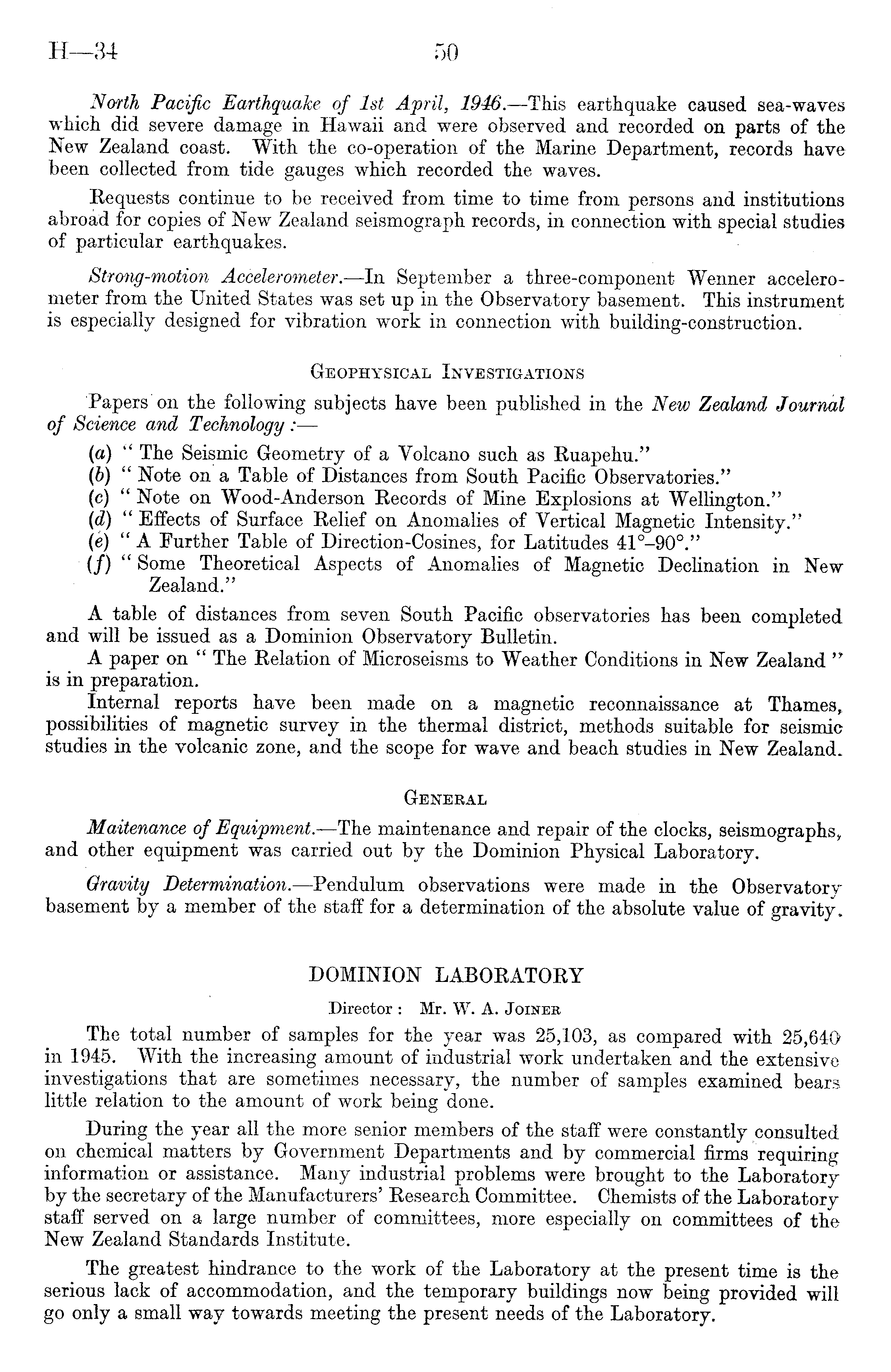 North Pacific Earthquake of Ist Aprils 1946.—This earthquake caused sea-waves which did severe damage in Hawaii and were observed and recorded on parts of the New Zealand coast. With the co-operation of the Marine Department, records have been collected from tide gauges which recorded the waves. Requests continue to be received from time to time from persons and institutions abroad for copies of New Zealand seismograph records, in connection with special studies of particular earthquakes. Strong-motion Accelerometer.—ln September a three-component Wenner accelerometer from the United States was set up in the Observatory basement. This instrument is especially designed for vibration work in connection with building-construction. Geophysical Investigations Papers on the following subjects have been published in the New Zealand Journal of Science and Technology : (a) " The Seismic Geometry of a Volcano such as Ruapehu." (b) " Note on a Table of Distances from South Pacific Observatories." (c) " Note on Wood-Anderson Records of Mine Explosions at Wellington." (d) " Effects of Surface Relief on Anomalies of Vertical Magnetic Intensity." (e) " A Further Table of Direction-Cosines, for Latitudes 41°-90°." (/) " Some Theoretical Aspects of Anomalies of Magnetic Declination in New Zealand." A table of distances from seven South Pacific observatories has been completed and will be issued as a Dominion Observatory Bulletin. A paper on " The Relation of Microseisms to Weather Conditions in New Zealand " is in preparation. Internal reports have been made on a magnetic reconnaissance at Thames, possibilities of magnetic survey in the thermal district, methods suitable for seismic studies in the volcanic zone, and the scope for wave and beach studies in New Zealand. General Maitenance of Equipment.—The maintenance and repair of the clocks, seismographs, and other equipment was carried out by the Dominion Physical Laboratory. Gravity Determination.—Pendulum observations were made in the Observatory basement by a member of the staff for a determination of the absolute value of gravity. DOMINION LABORATORY Director : Mr. W. A. Joiner The total number of samples for the year was 25,103, as compared with 25,640 in 1945. With the increasing amount of industrial work undertaken and the extensive investigations that are sometimes necessary, the number of samples examined bears little relation to the amount of work being done. During the year all the more senior members of the staff were constantly consulted on chemical matters by Government Departments and by commercial firms requiring information or assistance. Many industrial problems were brought to the Laboratory by the secretary of the Manufacturers' Research Committee. Chemists of the Laboratory staff served on a large number of committees, more especially on committees of the New Zealand Standards Institute. The greatest hindrance to the work of the Laboratory at the present time is the serious lack of accommodation, and the temporary buildings now being provided will go only a small way towards meeting the present needs of the Laboratory.