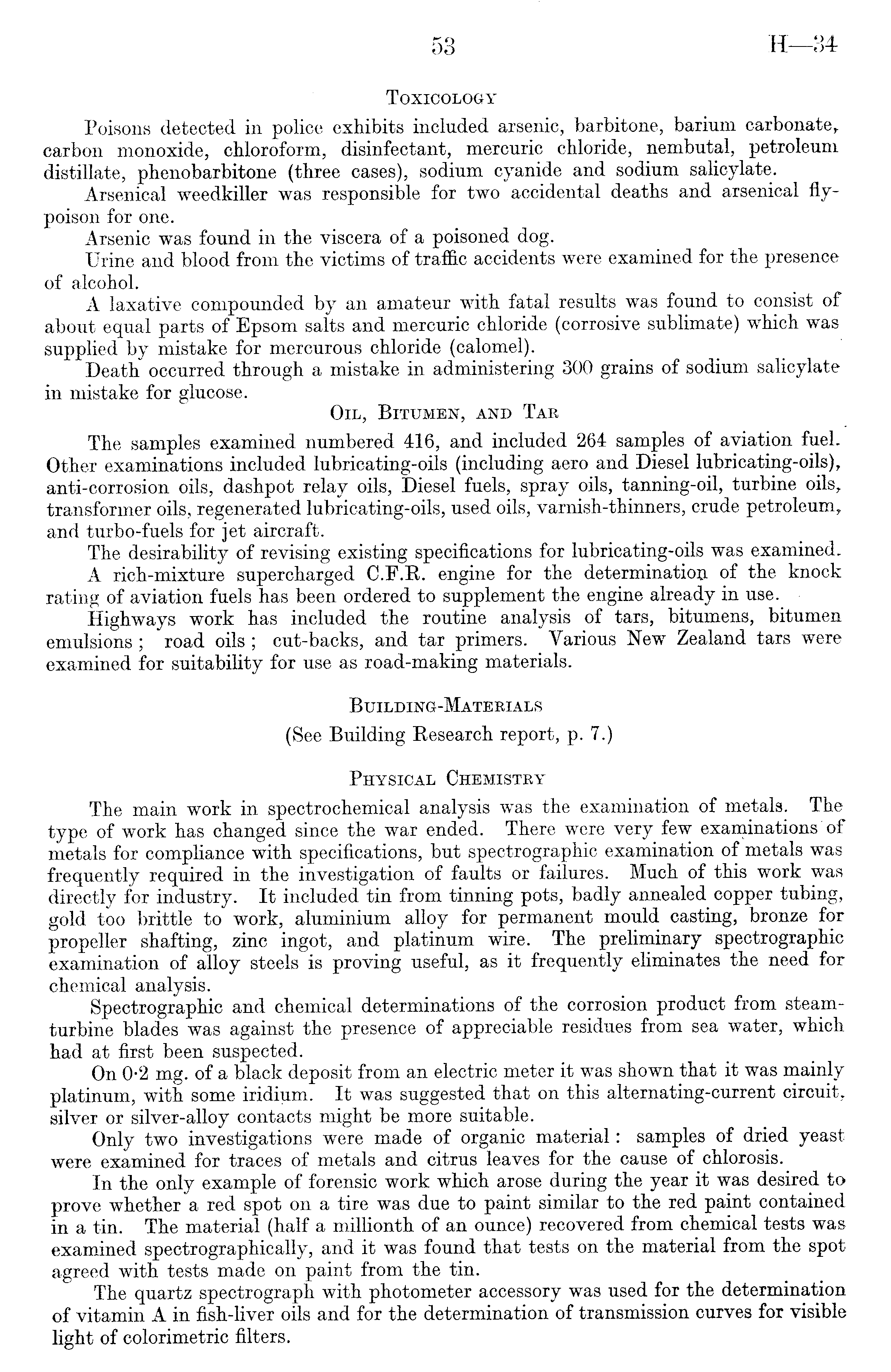 Toxicology Poisons detected in police exhibits included arsenic, barbitone, barium carbonate, carbon monoxide, chloroform, disinfectant, mercuric chloride, nembutal, petroleum distillate, phenobarbitone (three cases), sodium cyanide and sodium salicylate. Arsenical weedkiller was responsible for two accidental deaths and arsenical flypoison for one. Arsenic was found in the viscera of a poisoned dog. Urine and blood from the victims of traffic accidents were examined for the presence of alcohol. A laxative compounded by an amateur with fatal results was found to consist of about equal parts of Epsom salts and mercuric chloride (corrosive sublimate) which was supplied by mistake for mercurous chloride (calomel). Death occurred through a mistake in administering 300 grains of sodium salicylate in mistake for glucose. Oil, Bitumen, and Tar The samples examined numbered 416, and included 264 samples of aviation fuel. Other examinations included lubricating-oils (including aero and Diesel lubricating-oils), anti-corrosion oils, dashpot relay oils, Diesel fuels, spray oils, tanning-oil, turbine oils, transformer oils, regenerated lubricating-oils, used oils, varnish-thinners, crude petroleum, and turbo-fuels for jet aircraft. The desirability of revising existing specifications for lubricating-oils was examined. A rich-mixture supercharged C.F.R. engine for the determination of the knock rating of aviation fuels has been ordered to supplement the engine already in use. Highways work has included the routine analysis of tars, bitumens, bitumen emulsions; road oils ; cut-backs, and tar primers. Various New Zealand tars were examined for suitability for use as road-making materials. Building-Materials (See Building Research report, p. 7.) Physical Chemistry The main work in spectrochemical analysis was the examination of metals. The type of work has changed since the war ended. There were very few examinations of metals for compliance with specifications, but spectrographic examination of metals was frequently required in the investigation of faults or failures. Much of this work was directly for industry. It included tin from tinning pots, badly annealed copper tubing, gold too brittle to work, aluminium alloy for permanent mould casting, bronze for propeller shafting, zinc ingot, and platinum wire. The preliminary spectrographic examination of alloy steels is proving useful, as it frequently eliminates the need for chemical analysis. Spectrographic and chemical determinations of the corrosion product from steamturbine blades was against the presence of appreciable residues from sea water, which had at first been suspected. On 0-2 mg. of a black deposit from an electric meter it was shown that it was mainly platinum, with some iridium. It was suggested that on this alternating-current circuit, silver or silver-alloy contacts might be more suitable. Only two investigations were made of organic material: samples of dried yeast were examined for traces of metals and citrus leaves for the cause of chlorosis. In the only example of forensic work which arose during the year it was desired to prove whether a red spot on a tire was due to paint similar to the red paint contained in a tin. The material (half a millionth of an ounce) recovered from chemical tests was examined spectrographically, and it was found that tests on the material from the spot agreed with tests made on paint from the tin. The quartz spectrograph with photometer accessory was used for the determination of vitamin A in fish-liver oils and for the determination of transmission curves for visible light of colorimetric filters.