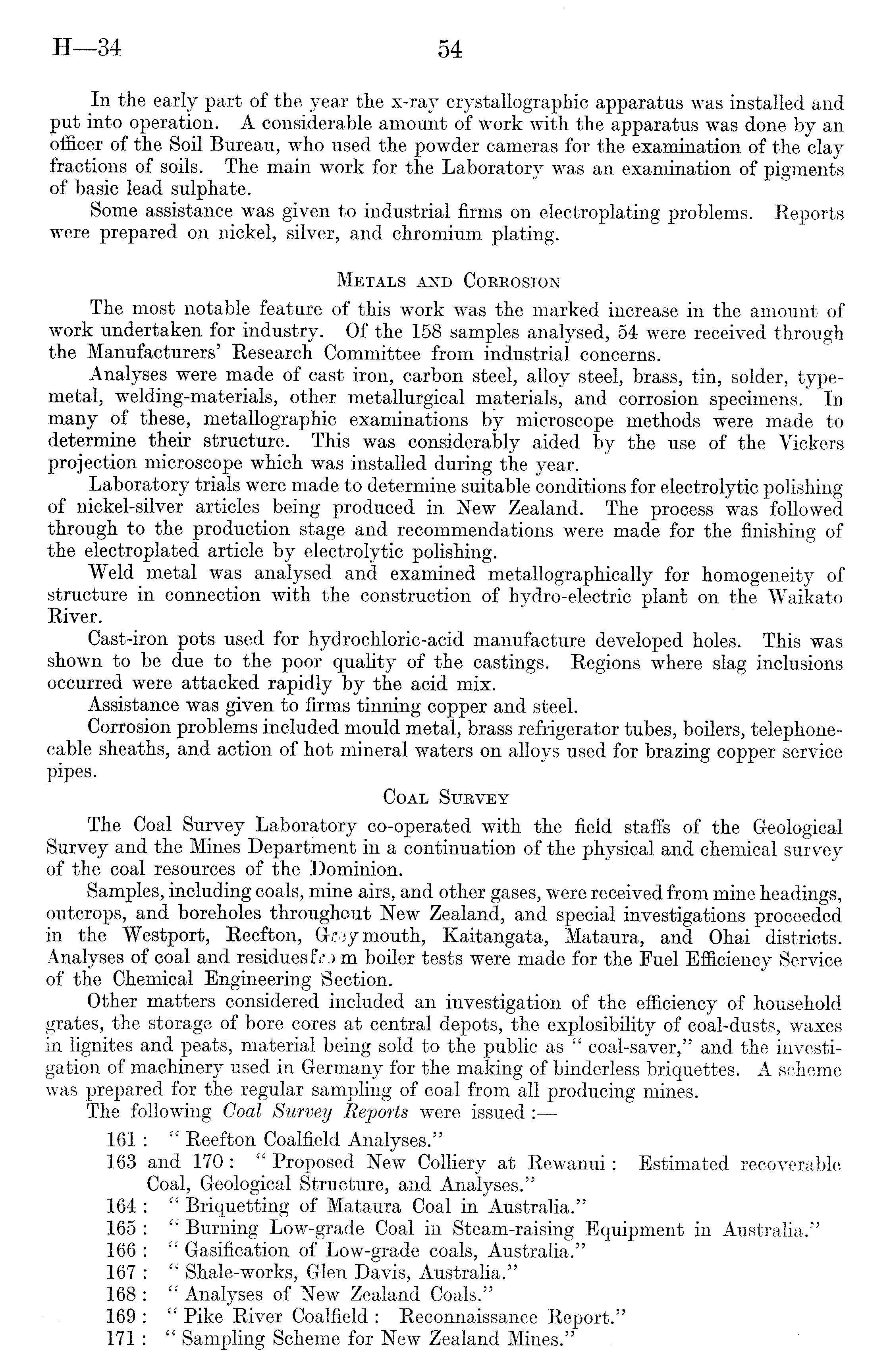 In the early part of the year the x-ray crystallographic apparatus was installed and put into operation. A considerable amount of work with the apparatus was done by an officer of the Soil Bureau, who used the powder cameras for the examination of the clay fractions of soils. The main work for the Laboratory was an examination of pigments of basic lead sulphate. Some assistance was given to industrial firms on electroplating problems. Reports were prepared on nickel, silver, and chromium plating. Metals and Corrosion The most notable feature of this work was the marked increase in the amount of work undertaken for industry. Of the 158 samples analysed, 54 were received through the Manufacturers' Research Committee from industrial concerns. Analyses were made of cast iron, carbon steel, alloy steel, brass, tin, solder, typemetal, welding-materials, other metallurgical materials, and corrosion specimens. In many of these, metallographic examinations by microscope methods were made to determine their structure. This was considerably aided by the use of the Vickers projection microscope which was installed during the year. Laboratory trials were made to determine suitable conditions for electrolytic polishing of nickel-silver articles being produced in New Zealand. The process was followed through to the production stage and recommendations were made for the finishing of the electroplated article by electrolytic polishing. Weld metal was analysed and examined metallographically for homogeneity of structure in connection with the construction of hydro-electric plant on the Waikato River. Cast-iron pots used for hydrochloric-acid manufacture developed holes. This was shown to be due to the poor quality of the castings. Regions where slag inclusions occurred were attacked rapidly by the acid mix. Assistance was given to firms tinning copper and steel. Corrosion problems included mould metal, brass refrigerator tubes, boilers, telephonecable sheaths, and action of hot mineral waters on alloys used for brazing copper service pipes. Coal Survey The Coal Survey Laboratory co-operated with the field staffs of the Geological Survey and the Mines Department in a continuation of the physical and chemical survey of the coal resources of the Dominion. Samples, including coals, mine airs, and other gases, were received from mine headings, outcrops, and boreholes throughout New Zealand, and special investigations proceeded in the Westport, Reefton, Gwy mouth, Kaitangata, Mataura, and Ohai districts. Analyses of coal and residuesfom boiler tests were made for the Fuel Efficiency Service of the Chemical Engineering Section. Other matters considered included an investigation of the efficiency of household grates, the storage of bore cores at central depots, the explosibility of coal-dusts, waxes in lignites and peats, material being sold to the public as " coal-saver," and the investigation of machinery used in Germany for the making of binderless briquettes. A scheme was prepared for the regular sampling of coal from all producing mines. The following Coal Survey Reports were issued : 161 : " Reefton Coalfield Analyses." 163 and 170 : " Proposed New Colliery at Rewanui: Estimated recoverable Coal, Geological Structure, and Analyses." 164: " Briquetting of Mataura Coal in Australia." 165 : " Burning Low-grade Coal in Steam-raising Equipment in Australia." 166 : " Gasification of Low-grade coals, Australia." 167 : " Shale-works, Glen Davis, Australia." 168 : " Analyses of New Zealand Coals." 169 : " Pike River Coalfield : Reconnaissance Report." 171 : " Sampling Scheme for New Zealand Mines."
