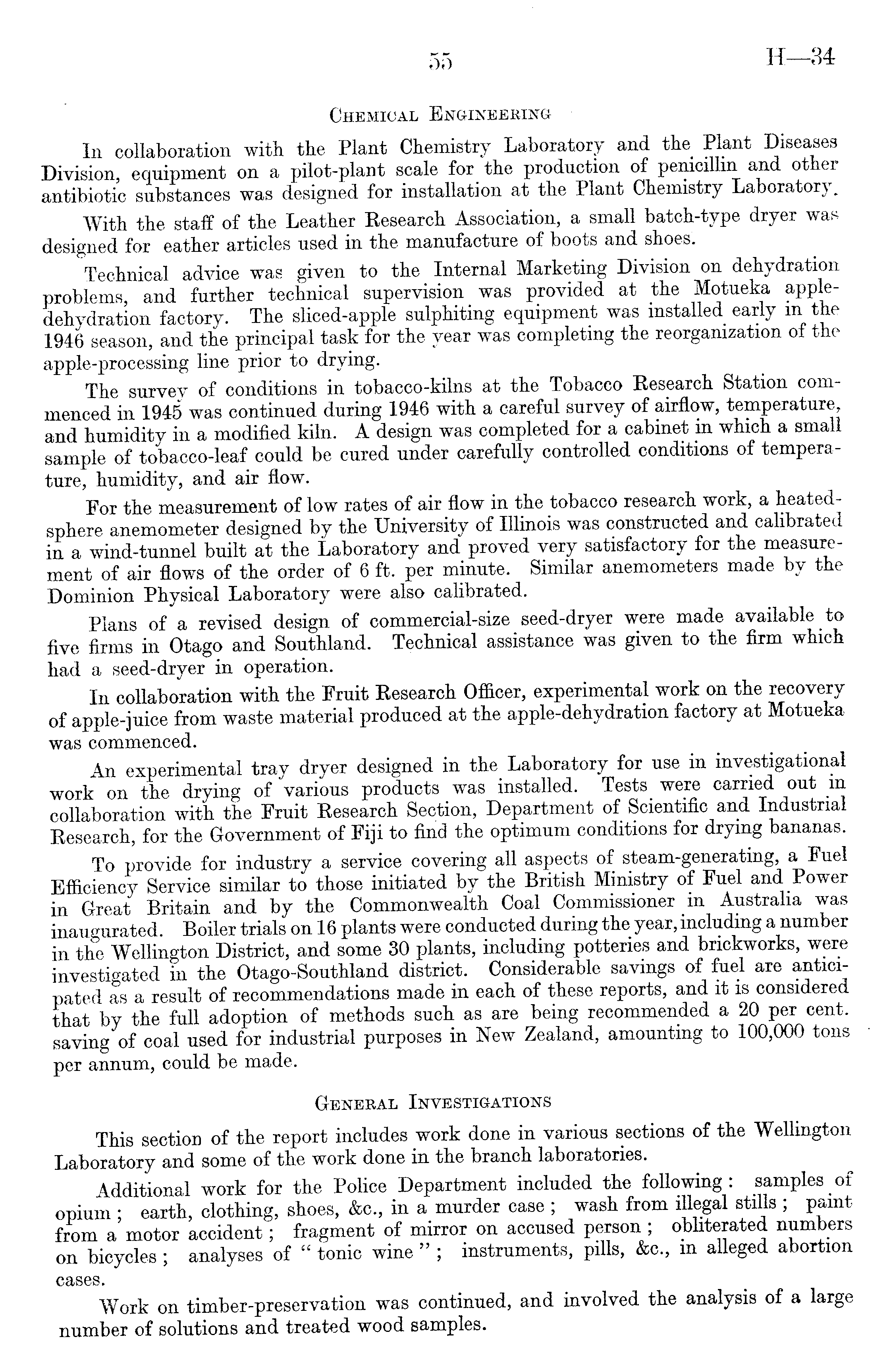 Chemical Engineering In collaboration with the Plant Chemistry Laboratory and the Plant Diseases Division, equipment on a pilot-plant scale for the production of penicillin and other antibiotic substances was designed for installation at the Plant Chemistry Laboratory. With the staff of the Leather Research Association, a small batch-type dryer was designed for eather articles used in the manufacture of boots and shoes. Technical advice was given to the Internal Marketing Division on dehydration problems and further technical supervision was provided at the Motueka appledehydration factory. The sliced-apple sulphiting equipment was installed early in the 1946 season, and the principal task for the year was completing the reorganization of the apple-processing line prior to drying. The survey of conditions in tobacco-kilns at the Tobacco Research Station commenced in 1945 was continued during 1946 with a careful survey of airflow, temperature, and humidity in a modified kiln. A design was completed for a cabinet m which a small sample of tobacco-leaf could be cured under carefully controlled conditions of temperature, humidity, and air flow. For the measurement of low rates of air flow in the tobacco research work, a heatedsphere anemometer designed by the University of Illinois was constructed and calibrated in a wind-tunnel built at the Laboratory and proved very satisfactory for the measurement of air flows of the order of 6 ft. per minute. Similar anemometers made by the Dominion Physical Laboratory were also calibrated. Plans of a revised design of commercial-size seed-dryer were made available to five firms in Otago and Southland. Technical assistance was given to the firm which had a seed-dryer in operation. In collaboration with the Fruit Research Officer, experimental work on the recovery of apple-juice from waste material produced at the apple-dehydration factory at Motueka was commenced. An experimental tray dryer designed in the Laboratory for use in investigational work on the drying of various products was installed. Tests were carried out m collaboration with the Fruit Research Section, Department of Scientific and Industrial Research, for the Government of Fiji to find the optimum conditions for drying bananas. To provide for industry a service covering all aspects of steam-generating, a Fuel Efficiency Service similar to those initiated by the British Ministry of Fuel and Power in Great Britain and by the Commonwealth Coal Commissioner in Australia was inaugurated. Boiler trials on 16 plants were conducted during the year, including a number in the Wellington District, and some 30 plants, including potteries and brickworks, were investigated in the Otago-Southland district. Considerable savings of fuel are anticipated as a result of recommendations made in each of these reports, and it is considered that by the full adoption of methods such as are being recommended a 20 per cent, saving of coal used for industrial purposes in New Zealand, amountmg to 100,000 tons per annum, could be made. General Investigations This section of the report includes work done in various sections of the Wellington Laboratory and some of the work done in the branch laboratories. Additional work for the Police Department included the following: samples of opium ; earth, clothing, shoes, &c., in a murder case ; wash from illegal stills ; paint from a motor accident; fragment of mirror on accused person ; obliterated numbers on bicycles ; analyses of " tonic wine " ; instruments, pills, &c., m alleged abortion cases. Work on timber-preservation was continued, and involved the analysis of a large number of solutions and treated wood samples.