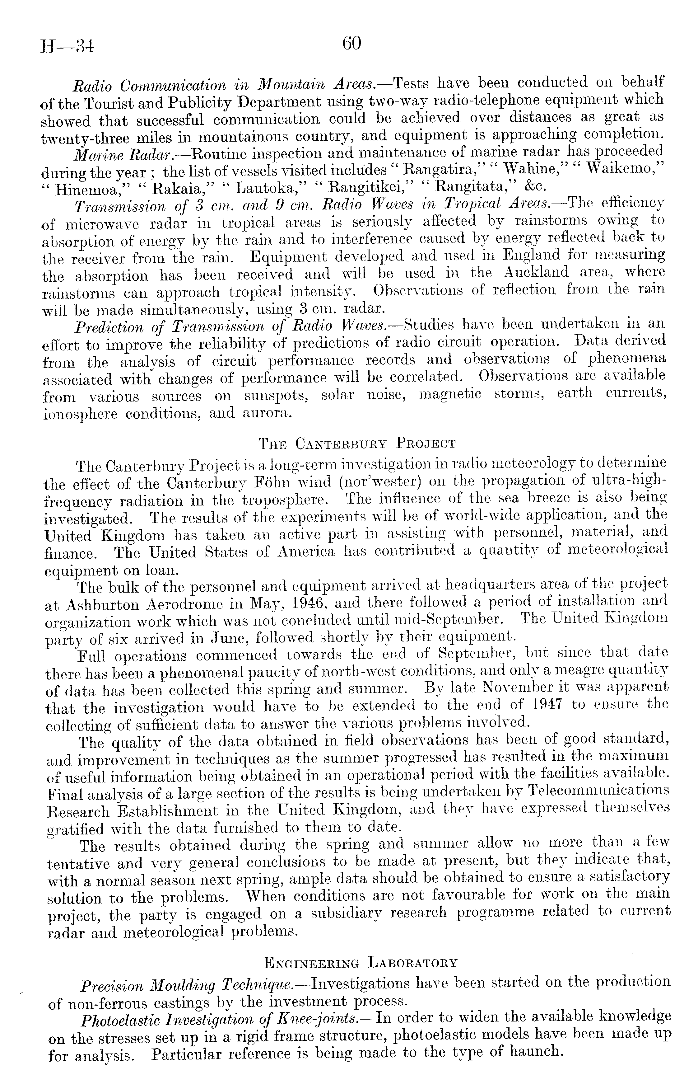 Radio Communication in Mountain Areas.—Tests have been conducted on behalf of the Tourist and Publicity Department using two-way radio-telephone equipment which showed that successful communication could be achieved over distances as great as twenty-three miles in mountainous country, and equipment is approaching completion. Marine Radar. —Routine inspection and maintenance of marine radar has proceeded during the year ; the list of vessels visited includes " Rangatira," " Wahine," " Waikemo," " Hinemoa," " Rakaia," " Lautoka," " Rangitikei," " Rangitata," &c. Transmission of 3 cm. and 9 cm. Radio Waves in Tropical Areas. The efficiency of microwave radar in tropical areas is seriously affected by rainstorms owing to absorption of energy by the rain and to interference caused by energy reflected back to the receiver from the rain. Equipment developed and used in England for measuring the absorption has been received and will be used in the Auckland area, where rainstorms can approach tropical intensity. Observations of reflection from the rain will be made simultaneously, using 3 cm. radar. Prediction of Transmission of Radio Waves— Studies have been undertaken in an effort to improve the reliability of predictions of radio circuit operation. Data derived from the analysis of circuit performance records and observations of phenomena associated with changes of performance will be correlated. Observations are available from various sources on sunspots, solar noise, magnetic storms, earth currents, ionosphere conditions, and aurora. The Canterbury Project The Canterbury Project is a long-term investigation in radio meteorology to determine the effect of the Canterbury Fohn wind (nor'wester) on the propagation of ultra-high-frequency radiation in the troposphere. The influence of the sea breeze is also being investigated. The results of the experiments will be of world-wide application, and the United Kingdom has taken an active part in assisting with personnel, material, and finance. The United States of America has contributed a quantity of meteorological equipment on loan. The bulk of the personnel and equipment arrived at headquarters area of the project at Ashburton Aerodrome in May, 1946, and there followed a period of installation and organization work which was not concluded until mid-September. The United Kingdom party of six arrived in June, followed shortly by their equipment. Full operations commenced towards the end of September, but since that date there has been a phenomenal paucity of north-west conditions, and only a meagre quantity of data has been collected this spring and summer. By late November it was apparent that the investigation would have to be extended to the end of 1947 to ensure the collecting of sufficient data to answer the various problems involved. The quality of the data obtained in field observations has been of good standard, and improvement in techniques as the summer progressed has resulted in the maximum of useful information being obtained in an operational period with the facilities available. Final analysis of a large section of the results is being undertaken by Telecommunications Research Establishment in the United Kingdom, and they have expressed themselves gratified with the data furnished to them to date. The results obtained during the spring and summer allow no more than a few tentative and very general conclusions to be made at present, but they indicate that, with a normal season next spring, ample data should be obtained to ensure a satisfactory solution to the problems. When conditions are not favourable for work on the main project, the party is engaged on a subsidiary research programme related to current radar and meteorological problems. Engineering Laboratory Precision Moulding Technique.—lnvestigations have been started on the production of non-ferrous castings by the investment process. Photoelastic Investigation of Knee-joints. —In order to widen the available knowledge on the stresses set up in a rigid frame.structure, photoelastic models have been made up for analysis. Particular reference is being made to the type of haunch.