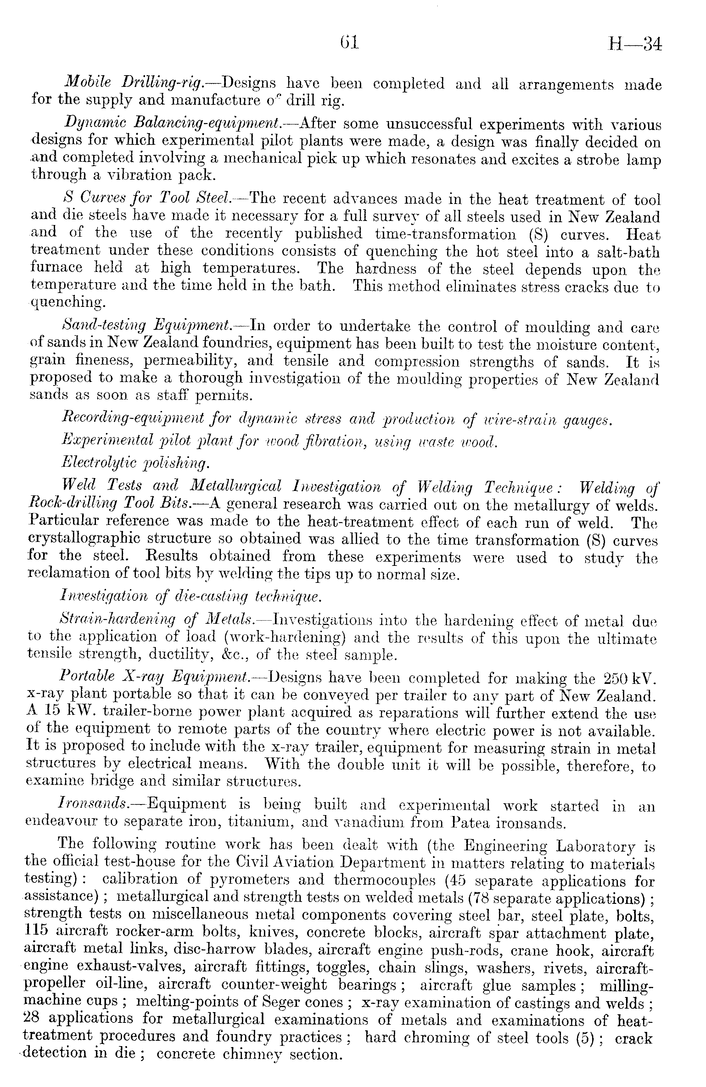 Mobile Drilling-rig. —Designs have been completed and all arrangements made for the supply and manufacture cr drill rig. Dynamic Balancing-equipment.—After some unsuccessful experiments with various ■designs for which experimental pilot plants were made, a design was finally decided on and completed involving a mechanical pick up which resonates and excites a strobe lamp through a vibration pack. S Curves for Tool Steel.—The recent advances made in the heat treatment of tool and die steels have made it necessary for a full survey of all steels used in New Zealand and of the use of the recently published time-transformation (S) curves. Heat treatment under these conditions consists of quenching the hot steel into a salt-bath furnace held at high temperatures. The hardness of the steel depends upon the temperature and the time held in the bath. This method eliminates stress cracks due to •quenching. Sand-testing Equipment.—ln order to undertake the control of moulding and care •of sands in New Zealand foundries, equipment has been built to test the moisture content, grain fineness, permeability, and tensile and compression strengths of sands. It is proposed to make a thorough investigation of the moulding properties of New Zealand sands as soon as staff permits. Recording-equipment for dynamic stress and production of wire-strain gauges. Experimental pilot plant for wood fibration, using waste wood. Electrolytic polishing. Weld Tests and Metallurgical Investigation of Welding Technique: Welding of Rock-drilling Tool Bits.—A general research was carried out on the metallurgy of welds. Particular reference was made to the heat-treatment effect of each run of weld. The crystallographic structure so obtained was allied to the time transformation (S) curves for the steel. Results obtained from these experiments were used to study the reclamation of tool bits by welding the tips up to normal size. Investigation of die-casting technique. Strain-hardening of Metals. —Investigations into the hardening effect of metal due to the application of load (work-hardening) and the results of this upon the ultimate tensile strength, ductility, &c., of the steel sample. Portable X-ray Equipment.—Designs have been completed for making the 250 kV. x-ray plant portable so that it can be conveyed per trailer to any part of New Zealand. A 15 kW. trailer-borne power plant acquired as reparations will further extend the use of the equipment to remote parts of the country where electric power is not available. It is proposed to include with the x-ray trailer, equipment for measuring strain in metal structures by electrical means. With the double unit it will be possible, therefore, to examine bridge and similar structures. Ironsands.—Equipment is being built and experimental work started in an endeavour to separate iron, titanium, and vanadium from Patea ironsands. The following routine work has been dealt with (the Engineering Laboratory is the official test-house for the Civil Aviation Department in matters relating to materials testing): calibration of pyrometers and thermocouples (45 separate applications for assistance); metallurgical and strength tests on welded metals (78 separate applications); strength tests on miscellaneous metal components covering steel bar, steel plate, bolts, 115 aircraft rocker-arm bolts, knives, concrete blocks, aircraft spar attachment plate, aircraft metal links, disc-harrow blades, aircraft engine push-rods, crane hook, aircraft •engine exhaust-valves, aircraft fittings, toggles, chain slings, washers, rivets, aircraftpropeller oil-line, aircraft counter-weight bearings ; aircraft glue samples; millingmachine cups ; melting-points of Seger cones ; x-ray examination of castings and welds ; 28 applications for metallurgical examinations of metals and examinations of heattreatment procedures and foundry practices; hard chroming of steel tools (5); crack -detection in die ; concrete chimney section.