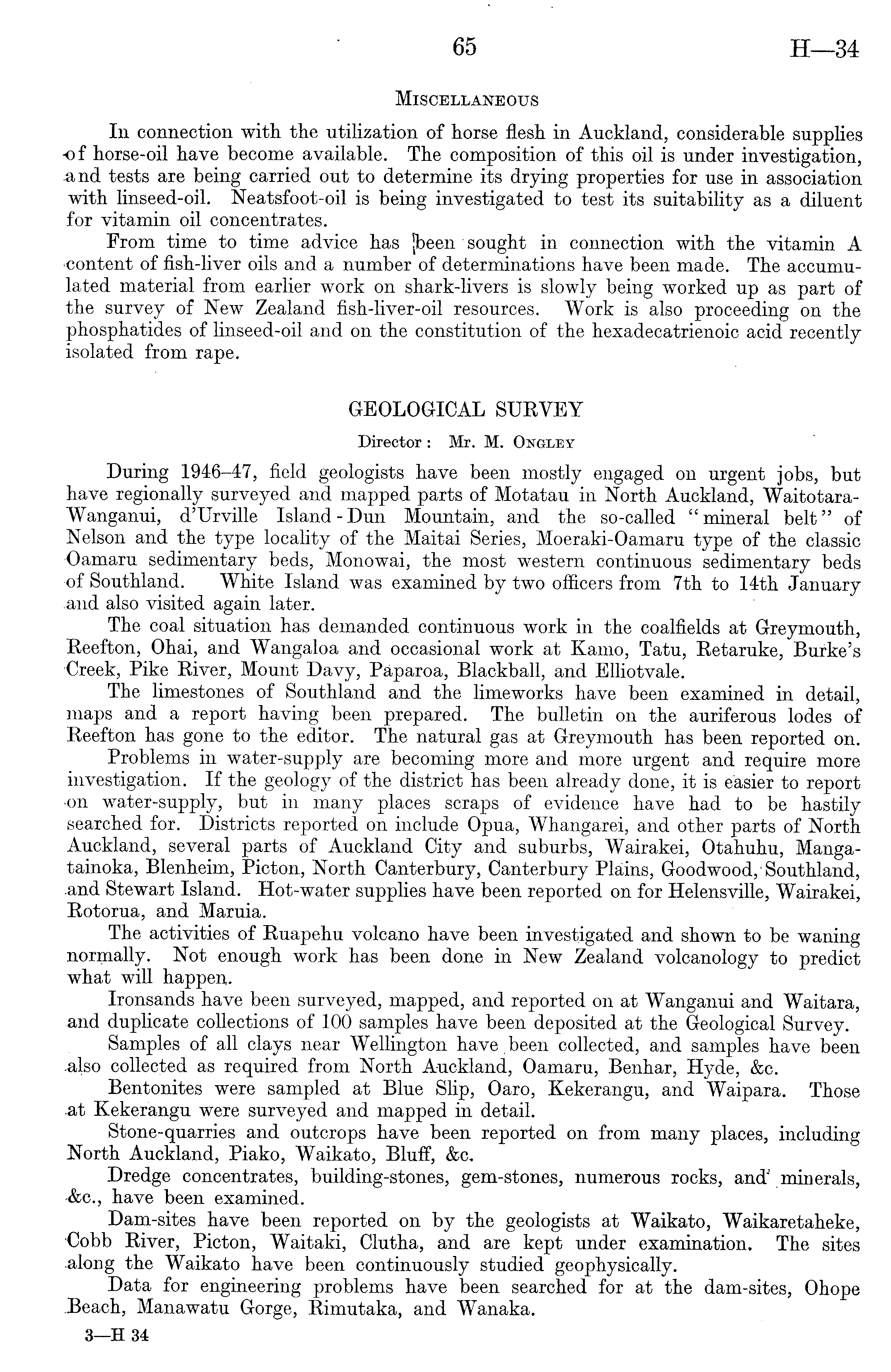 Miscellaneous In connection with the utilization of horse flesh in Auckland, considerable supplies of horse-oil have become available. The composition of this oil is under investigation, and tests are being carried out to determine its drying properties for use in association with linseed-oil. Neatsfoot-oil is being investigated to test its suitability as a diluent for vitamin oil concentrates. From time to time advice has [been sought in connection with the vitamin A ■content of fish-liver oils and a number of determinations have been made. The accumulated material from earlier work on shark-livers is slowly being worked up as part of the survey of New Zealand fish-liver-oil resources. Work is also proceeding on the phosphatides of linseed-oil and on the constitution of the hexadecatrienoic acid recently isolated from rape. GEOLOGICAL SURVEY Director : Mr. M. Ongley During 1946-47, field geologists have been mostly engaged on urgent jobs, but have regionally surveyed and mapped parts of Motatau in North Auckland, WaitotaraWanganui, d'Urville Island-Dun Mountain, and the so-called "mineral belt" of Nelson and the type locality of the Maitai Series, Moeraki-Oamaru type of the classic Oamaru sedimentary beds, Monowai, the most western continuous sedimentary beds •of Southland. White Island was examined by two officers from 7th to 14th January -and also visited again later. The coal situation has demanded continuous work in the coalfields at Greymouth, Reefton, Ohai, and Wangaloa and occasional work at Kamo, Tatu, Retaruke, Burke's ■Creek, Pike River, Mount Davy, Paparoa, Blackball, and Elliotvale. The limestones of Southland and the limeworks have been examined in detail, maps and a report having been prepared. The bulletin on the auriferous lodes of Reefton has gone to the editor. The natural gas at Greymouth has been reported on. Problems in water-supply are becoming more and more urgent and require more investigation. If the geology'of the district has been already done, it is easier to report ■on water-supply, but in many places scraps of evidence have had to be hastily searched for. Districts reported on include Opua, Whangarei, and other parts of North Auckland, several parts of Auckland City and suburbs, Wairakei, Otahuhu, Mangatainoka, Blenheim, Picton, North Canterbury, Canterbury Plains, Goodwood,' Southland, .and Stewart Island. Hot-water supplies have been reported on for Helensville, Wairakei, Rotorua, and Maruia. The activities of Ruapehu volcano have been investigated and shown to be waning normally. Not enough work has been done in New Zealand volcanology to predict what will happen. Ironsands have been surveyed, mapped, and reported on at Wanganui and Waitara, and duplicate collections of 100 samples have been deposited at the Geological Survey. Samples of all clays near Wellington have , been collected, and samples have been .also collected as required from North Auckland, Oamaru, Benhar, Hyde, &c. . Bentonites were sampled at Blue Slip, Oaro, Kekerangu, and Waipara. Those .at Kekerangu were surveyed and mapped in detail. Stone-quarries and outcrops have been reported on from many places, including North Auckland, Piako, Waikato, Bluff, &&. Dredge concentrates, building-stones, gem-stones, numerous rocks, and' minerals, -&c., have been,.examined. Dam-sites have been reported on by the geologists at Waikato, Waikaretaheke, Cobb River, Picton, Waitaki, Clutha, and are kept under examination. The sites along the Waikato have been continuously studied geophysically. Data for engineering problems have been searched for at the dam-sites, Ohope .Beach, Manawatu Gorge, Rimutaka, and Wanaka.