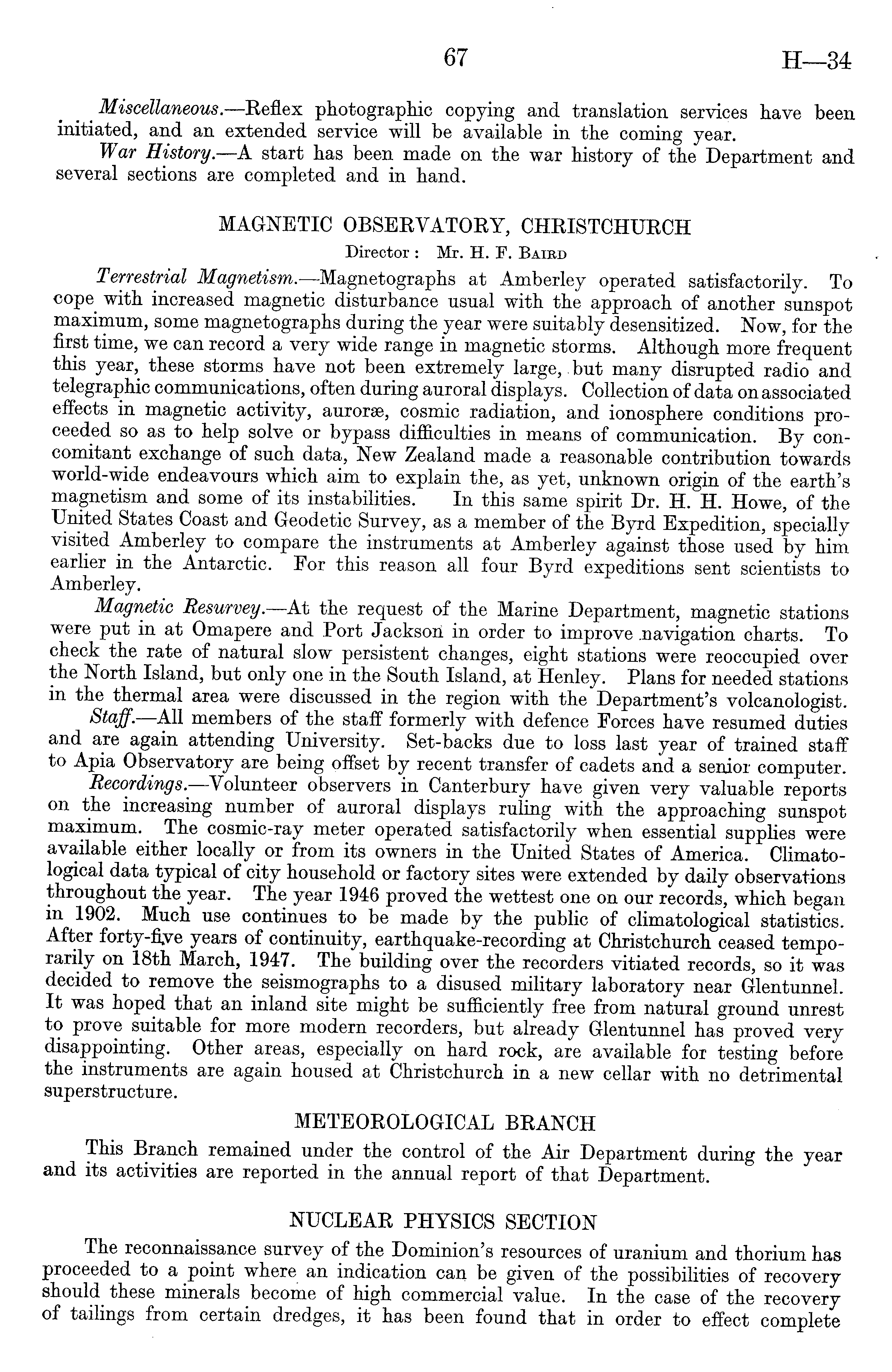 Miscellaneous—Reflex photographic copying and translation services have been initiated, and an extended service will be available in the coming year. War History.—A start has been made on the war history of the Department and several sections are completed and in hand. MAGNETIC OBSERVATORY, CHRISTCHURCH Director : Mr. H. F. Baird Terrestrial Magnetism.—Magnetographs at Amberley operated satisfactorily. To cope with increased magnetic disturbance usual with the approach of another sunspot maximum, some magnetographs during the year were suitably desensitized. Now, for the first time, we can record a very wide range in magnetic storms. Although more frequent this year, these storms have not been extremely large, .but many disrupted radio and telegraphic communications, often during auroral displays. Collection of data on associated effects in magnetic activity, aurorse, cosmic radiation, and ionosphere conditions proceeded so as to help solve or bypass difficulties in means of communication. By concomitant exchange of such data, New Zealand made a reasonable contribution towards world-wide endeavours which aim to explain the, as yet, unknown origin of the earth's magnetism and some of its instabilities. In this same spirit Dr. H. H. Howe, of the United States Coast and Geodetic Survey, as a member of the Byrd Expedition, specially visited Amberley to compare the instruments at Amberley against those used by him earlier in the Antarctic. For this reason all four Byrd expeditions sent scientists to Amberley. Magnetic Resurvey.—At the request of the Marine Department, magnetic stations were put in at Omapere and Port Jacksoti in order to improve .navigation charts. To check the rate of natural slow persistent changes, eight stations were reoccupied over the North Island, but only one in the South Island, at Henley. Plans for needed stations in the thermal area were discussed in the region with the Department's volcanologist. S ta ff- —All members of the staff formerly with defence Forces have resumed duties and are again attending University. Set-backs due to loss last year of trained staff to Apia Observatory are being offset by recent transfer of cadets and a senior computer. Recordings.—Volunteer observers in Canterbury have given very valuable reports on the increasing number of auroral displays ruling with the approaching sunspot maximum. The cosmic-ray meter operated satisfactorily when essential supplies were available either locally or from its owners in the United States of America. Climatological data typical of city household or factory sites were extended by daily observations throughout the year. The year 1946 proved the wettest one on our records, which began in 1902. Much use continues to be made by the public of climatological statistics. After forty-fi,ve years of continuity, earthquake-recording at Christchurch ceased temporarily on 18th March, 1947. The building over the recorders vitiated records, so it was decided to remove the seismographs to a disused military laboratory near Glentunnel. It was hoped that an inland site might be sufficiently free from natural ground unrest to prove suitable for more modern recorders, but already Glentunnel has proved very disappointing. Other areas, especially on hard rock, are available for testing before the instruments are again housed at Christchurch in a new cellar with no detrimental superstructure. METEOROLOGICAL BRANCH This Branch remained under the control of the Air Department during the year and its activities are reported in the annual report of that Department. NUCLEAR PHYSICS SECTION The reconnaissance survey of the Dominion's resources of uranium and thorium has proceeded to a point where an indication can be given of the possibilities of recovery should these minerals become of high commercial value. In the case of the recovery of tailings from certain dredges, it has been found that in order to effect complete