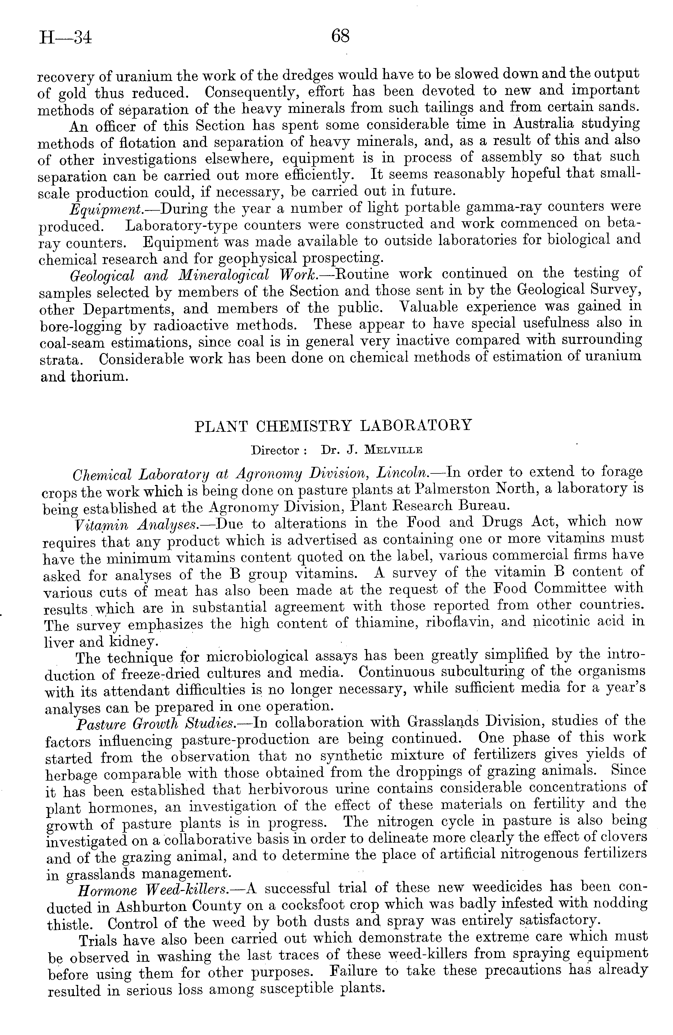 recovery of uranium the work of the dredges would have to be slowed down and the output of gold thus reduced. Consequently, effort has been devoted to new and important methods of separation of the heavy minerals from such tailings and from certain sands. An officer of this Section has spent some considerable time in Australia studying methods of flotation and separation of heavy minerals, and, as a result of this and also of other investigations elsewhere, equipment is in process of assembly so that such separation can be carried out more efficiently. It seems reasonably hopeful that smallscale production could, if necessary, be carried out in future. Equipment.—During the year a number of light portable gamma-ray counters were produced. Laboratory-type counters were constructed and work commenced on betaray counters. Equipment was made available to outside laboratories for biological and chemical research and for geophysical prospecting. Geological and Mineralogical Work. —Routine work continued on the testing of samples selected by members of the Section and those sent in by the Geological Survey, other Departments, and members of the public. Valuable experience was gained in bore-logging by radioactive methods. These appear to have special usefulness also in coal-seam estimations, since coal is in general very inactive compared with surrounding strata. Considerable work has been done on chemical methods of estimation of uranium and thorium. PLANT CHEMISTRY LABORATORY Director : Dr. J. Melville Chemical Laboratory at Agronomy Division, Lincoln.—ln order to extend to forage crops the work which is being done on pasture plants at Palmerston North, a laboratory is being established at the Agronomy Division, Plant Research Bureau. Vitamin Analyses, —Due to alterations in the Food and Drugs Act, which now requires that any product which is advertised as containing one or more vitamins must have the minimrmn vitamins content quoted on the label, various commercial firms have asked for analyses of the B group vitamins. A survey of the . vitamin B content of various cuts of meat has also been made at the request of the Food Committee with results which are in substantial agreement with those reported from other countries. The survey emphasizes the high content of thiamine, riboflavin, and nicotinic acid in liver and kidney. . . The technique for microbiological assays has been greatly simplified by the introduction of freeze-dried cultures and media. Continuous subculturing of the organisms with its attendant difficulties is no longer necessary, while sufficient media for a year's analyses can be prepared in one operation. Pasture Growth Studies. —In collaboration with Grasslands Division, studies of the factors influencing pasture-production are'being continued. One phase of this work - started from the observation that no synthetic mixture of fertilizers gives yields of herbage comparable with those obtained from the droppings of grazing animals. Since it has been established that herbivorous urine contains considerable concentrations of plant hormones, an investigation of the effect of these materials on fertility and the growth of pasture plants is in progress. The nitrogen cycle in pasture is also being investigated on a collaborative basis in order to delineate more clearly the effect of clovers and of the grazing animal, and to determine the place of artificial nitrogenous fertilizers in grasslands management. Hormone Weed-killers. —A successful trial of these new weedicides has been conducted in Ashburton County on a cocksfoot crop which was badly infested with nodding thistle. Control of the weed by both dusts and spray was entirely satisfactory. Trials have also been carried out which demonstrate the extreme care which must be observed in washing the last traces of these weed-killers from spraying equipment before using them for other purposes. Failure to take these precautions has already resulted in serious loss among susceptible plants.