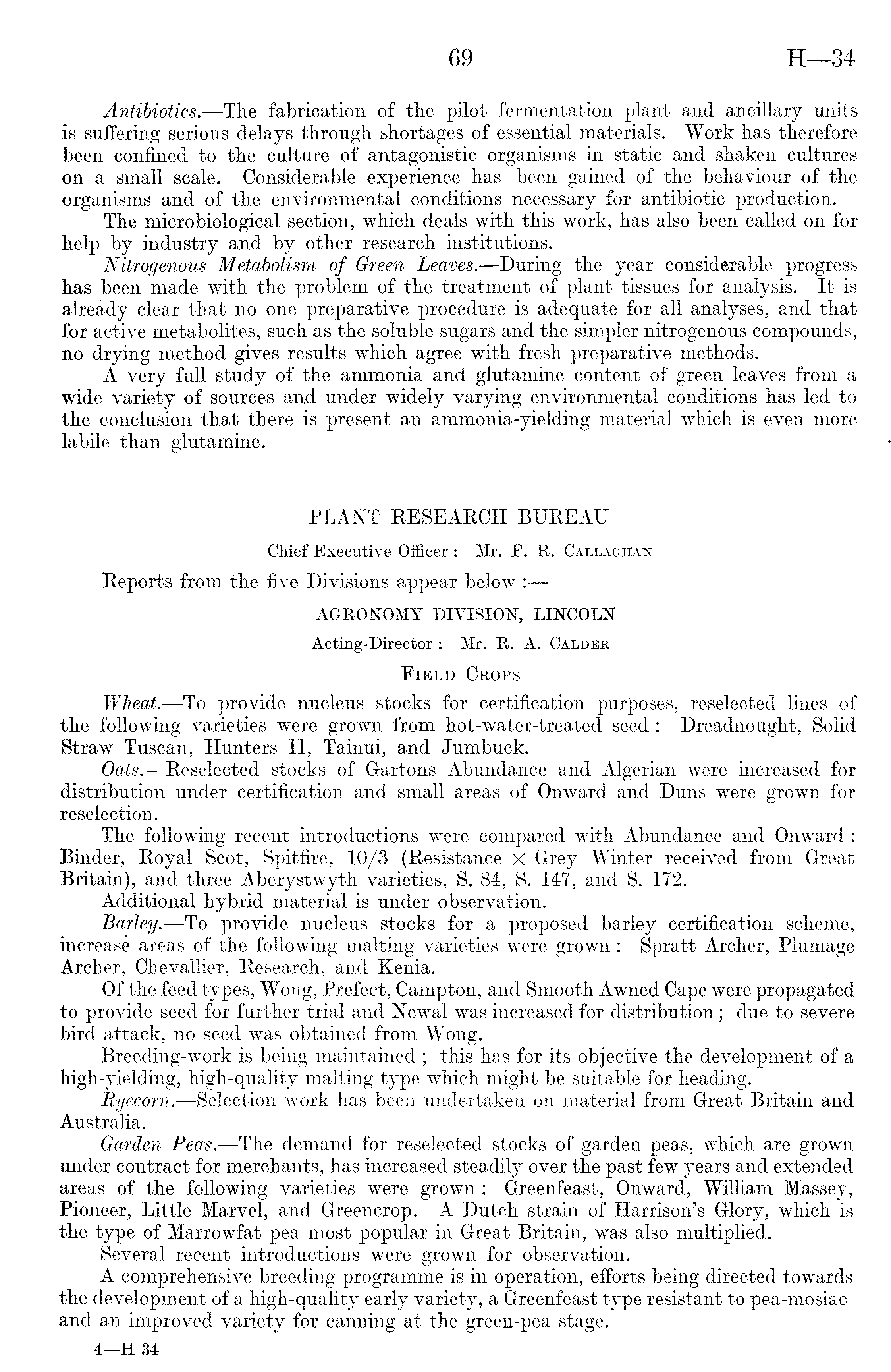 Antibiotics. —The fabrication of the pilot fermentation plant and ancillary units is suffering serious delays through shortages of essential materials. Work has therefore been confined to the culture of antagonistic organisms in static and shaken cultures on a small scale. Considerable experience has been gained of the behaviour of the organisms and of the environmental conditions necessary for antibiotic production. The microbiological section, which deals with this work, has also been called on for help by industry and by other research institutions. Nitrogenous Metabolism of Green Leaves. —During the year considerable progress has been made with the problem of the treatment of plant tissues for analysis. It is already clear that no one preparative procedure is adequate for all analyses, and that for active metabolites, such as the soluble sugars and the simpler nitrogenous compounds, no drying method gives results which agree with fresh preparative methods. A very full study of the ammonia and glutamine content of green leaves from a wide variety of sources and under widely varying environmental conditions has led to the conclusion that there is present an ammonia-yielding material which is even more labile than glutamine. PLANT RESEARCH BUREAU Chief Executive Officer : Mr. F. R. Callaghan Reports from the five Divisions appear below : AGRONOMY DIVISION, LINCOLN Acting-Director: Mr. R. A. Calder Field Crops Wheat.—To provide nucleus stocks for certification purposes, reselected lines of the following varieties were grown from hot-water-treated seed : Dreadnought, Solid Straw Tuscan, Hunters 11, Tainui, and Jumbuck. Oats. —Reselected stocks of Gartons Abundance and Algerian were increased for distribution under certification and small areas of Onward and Duns were grown for reselection. The following recent introductions were compared with Abundance and Onward : Binder, Royal Scot, Spitfire, 10/3 (Resistance X Grey Winter received from Great Britain), and three Aberystwyth varieties, S. 84, S. 147, and S. 172. Additional hybrid material is under observation. Barley. —To provide nucleus stocks for a proposed barley certification scheme, increase areas of the following malting varieties were grown : Spratt Archer, Plumage Archer, Chevallier, Research, and Kenia. Of the feed types, Wong, Prefect, Camp ton, and Smooth Awned Cape were propagated to provide seed for further trial and Newal was increased for distribution; due to severe bird attack, no seed was obtained from Wong. Breeding-work is being maintained ; this has for its objective the development of a high-yielding, high-quality malting type which might be suitable for heading. Ryecorn.—Selection work has been undertaken on material from Great Britain and Australia. Garden Peas. —The demand for reselected stocks of garden peas, which are grown under contract for merchants, has increased steadily over the past few years and extended areas of the following varieties were grown : Greenfeast, Onward, William Massey, Pioneer, Little Marvel, and Greencrop. A Dutch strain of Harrison's Glory, which is the type of Marrowfat pea most popular in Great Britain, was also multiplied. Several recent introductions were grown for observation. A comprehensive breeding programme is in operation, efforts being directed towards the development of a high-quality early variety, a Greenfeast type resistant to pea-mosiac • and an improved variety for canning at the green-pea stage.