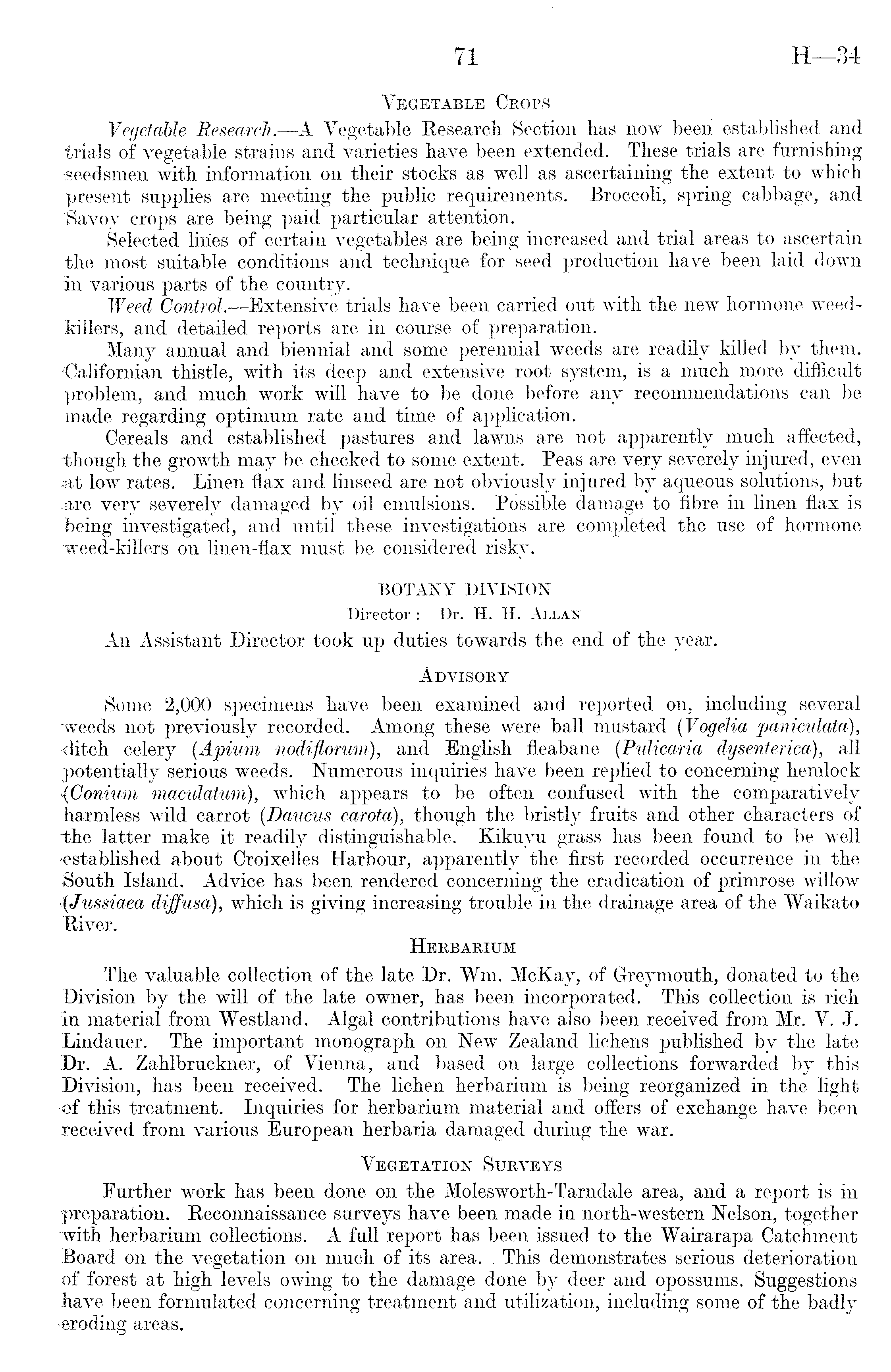 Vegetable Crops Vegetable Research.—A Vegetable Research. Section- has now been established and trials of vegetable strains and varieties have been extended. These trials are furnishing seedsmen with information on their stocks as well as ascertaining the extent to which present supplies are meeting the public requirements. Broccoli, spring cabbage, and 'Savoy crops are being paid particular attention. Selected lines of certain vegetables are being increased and trial areas to ascertain "the most suitable conditions and technique for seed production have been laid down in various parts of the country. Weed Control. —Extensive trials have been carried out with the new hormone weedkillers, and detailed reports are in course of preparation. Many annual and biennial and some perennial weeds are readily killed by them. 'Californian thistle, with its deep and extensive root system, is a much more difficult problem, and much work will have to be done before any recommendations can be made regarding optimum rate and time of application. Cereals and established pastures and lawns are not apparently much affected, "though the growth may be checked to some extent. Peas are very severely injured, even at low rates. Linen flax and linseed are not obviously injured by aqueous solutions, but are very severely damaged by oil emulsions. Possible damage to fibre in linen flax is being investigated, and until these investigations are completed the use of hormone •weed-killers on linen-flax must be considered risky. BOTANY DIVISION Director : Dr. H. H. Allan An Assistant Director took up duties towards the end of the year. Advisory Some 2,000 specimens have been examined and reported on, including several weeds not previously recorded. Among these were ball mustard (Vogelia paniculata), -ditch celery (Apium nodiflorum), and English fleabane (Pulicaria dysenterica), all potentially serious weeds. Numerous inquiries have been replied to concerning hemlock iConium maculatum), which appears to be often confused with the comparatively harmless wild carrot (Daucus carota), though the bristly fruits and other characters of "the latter make it readily distinguishable. Kikuyu grass has been found to be well •established about Croixelles Harbour, apparently the first recorded occurrence in the South Island. Advice has been rendered concerning the eradication of primrose willow \Jussiaea diffusa), which is giving increasing trouble in the drainage area of the Waikato River. Herbarium The valuable collection of the late Dr. Wm. McKay, of Greymouth, donated to the Division by the will of the late owner, has been incorporated. This collection is rich in material from Westland. Algal contributions have also been received from Mr. V. J. Lindauer. The important monograph on New Zealand lichens published by the late Dr. A. Zahlbruckner, of Vienna, and based on large collections forwarded by this Division, has been received. The lichen herbarium is being reorganized in the light of this treatment. Inquiries for herbarium material and offers of exchange have been received from various European herbaria damaged during the war. Vegetation Surveys Further work has been done on the Moles worth-Tarndale area, and a report is in preparation. Reconnaissance surveys have been made in north-western Nelson, together with herbarium collections. A full report has been issued to the Wairarapa Catchment Board on the vegetation on much of its area. . This demonstrates serious deterioration of forest at high levels owing to the damage done by deer and opossums. Suggestions have been formulated concerning treatment and utilization, including some of the badly -eroding areas.