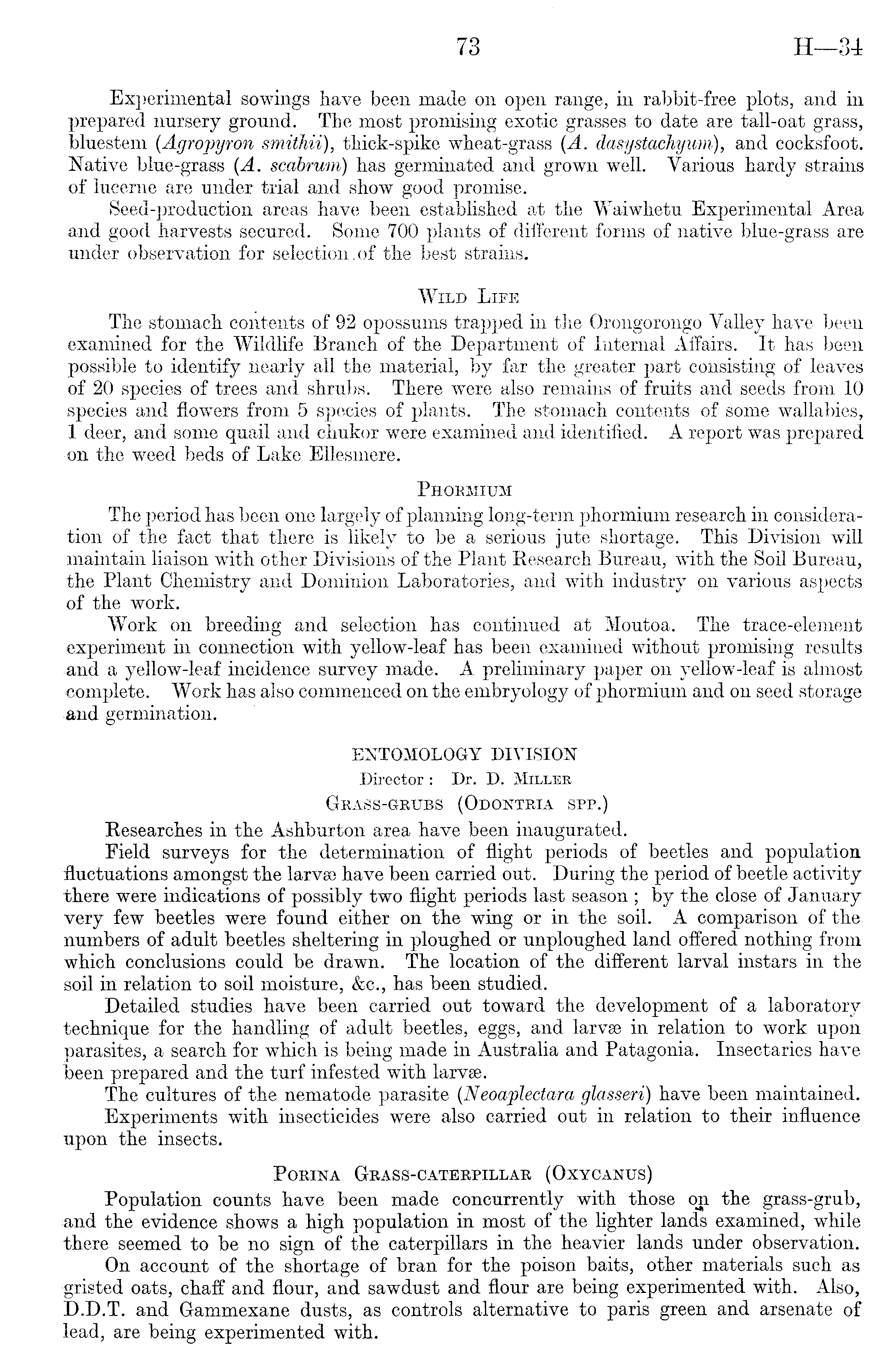 Experimental sowings have been made on open range, in rabbit-free plots, and in prepared nursery ground. The most promising exotic grasses to date are tall-oat grass, bluestem (Agropyron smithii), thick-spike wheat-grass (A. dasystachyum), and cocksfoot. Native blue-grass (A. scabrum) has germinated and grown well. Various hardy strains of lucerne are under trial and show good promise. Seed-production areas have been established at the Waiwhetu Experimental Area -and good harvests secured. Some 700 plants of different forms of native blue-grass are under observation for selection.of the best strains. Wild Life The stomach contents of 92 opossums trapped in the Orongorongo Valley have been examined for the Wildlife Branch of the Department of Internal Affairs. It has been possible to identify nearly all the material, by far the greater part consisting of leaves of 20 species of trees and shrubs. There were also remains of fruits and seeds from 10 species and flowers from 5 species of plants. The stomach contents of some wallabies, 1 deer, and some quail and chukor were examined and identified. A report was prepared on the weed beds of Lake Ellesmere. Phormium The period has been one largely of planning long-term phormium research in consideration of the fact that there is likely to be a serious jute shortage. This Division will maintain liaison with other Divisions of the Plant Research Bureau, with the Soil Bureau, the Plant Chemistry and Dominion Laboratories, and with industry on various aspects of the work. Work on breeding and selection has continued at Moutoa. The trace-element •experiment in connection with yellow-leaf has been examined without promising results and a yellow-leaf' incidence survey made. A preliminary paper on yellow-leaf is almost complete. Work has also commenced on the embryology of phormium and on seed storage •and germination. ENTOMOLOGY DIVISION Director : Dr. D. Miller Grass-grubs (Odontria spp.) Researches in the Ashburton area have been inaugurated. Field surveys for the determination of flight periods of beetles and population fluctuations amongst the larvae have been carried out. During the period of beetle activity there were indications of possibly two flight periods last season ; by the close of January very few beetles were found either on the wing or in the soil. A comparison of the numbers of adult beetles sheltering in ploughed or unploughed land offered nothing from which conclusions could be drawn. The location of the different larval instars in the soil in relation to soil moisture, &c., has been studied. Detailed studies have been carried out toward the development of a laboratory technique for the handling of adult beetles, eggs, and larvae in relation to work upon parasites, a search for which is being made in Australia and Patagonia. Insectaries have been prepared and the turf infested with larvae. The cultures of the nematode parasite (Neoaplectara glasseri) have been maintained. Experiments with insecticides were also carried out in relation to their influence upon the insects. Porina Grass-caterpillar (Oxycanus) Population counts have been made concurrently with those on the grass-grub, and the evidence shows a high population in most of the lighter lands examined, while there seemed to be no sign of the caterpillars in the heavier lands under observation. On account of the shortage of bran for the poison baits, other materials such as gristed oats, chaff and flour, and sawdust and flour are being experimented with. Also, D.D.T. and Gammexane dusts, as controls alternative to paris green and arsenate of lead, are being experimented with.