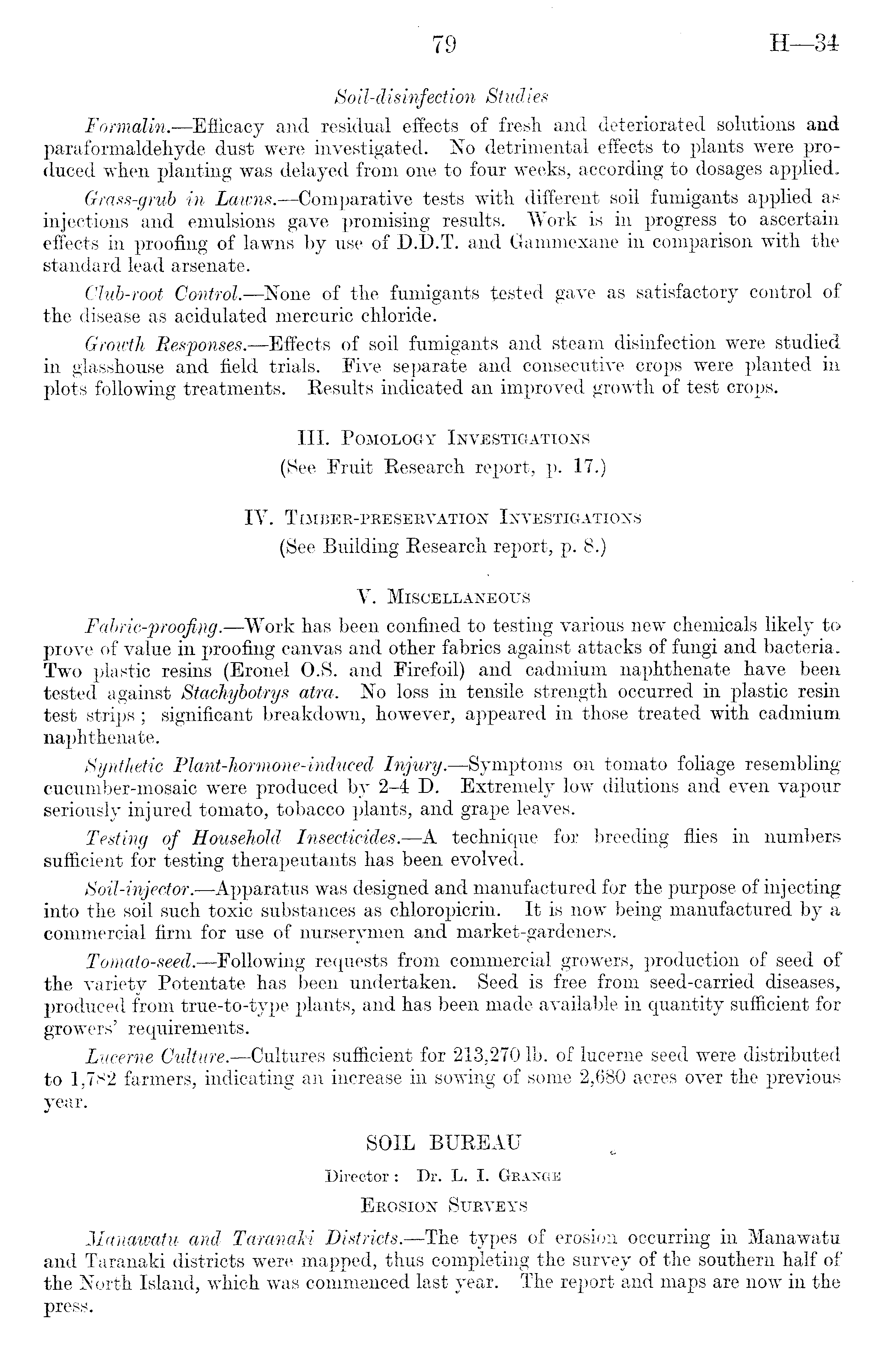 Soil-disinfection Studies Formalin.—Efficacy and residual effects of fresh and deteriorated solutions and paraformaldehyde dust were investigated. No detrimental effects to plants were produced when planting was delayed from one to four weeks, according to dosages applied. Grass-grub in Lawns. —Comparative tests with different soil fumigants applied as injections and emulsions gave promising results. Work is in progress to ascertain effects in proofing of lawns by use of D.D.T. and Gammexane in comparison with the standard lead arsenate. Club-root Control. —None of the fumigants Rested gave as satisfactory control of the disease as acidulated mercuric chloride. Growth Responses. —Effects of soil fumigants and steam disinfection were studied in glasshouse and field trials. Five separate and consecutive crops were planted in plots following treatments. Results indicated an improved growth of test crops. 111. Pomology Investigations (See Fruit Research report, p. 17.) IV. Timber-preservation Investigations (See Building Research report, p. 8.) V. Miscellaneous Fabric-proofing■— Work has been confined to testing various new chemicals likely to prove of value in proofing canvas and other fabrics against attacks of fungi and bacteria. Two plastic resins (Eronel O.S. and Firefoil) and cadmium naphthenate have been tested against Stachybotrys atra. No loss in tensile strength occurred in plastic resin test strips; significant breakdown, however, appeared in those treated with cadmium naphthenate. Synthetic Plant-hormone-induced Injury. —Symptoms on tomato foliage resembling cucumber-mosaic were produced by 2-4 D. Extremely low dilutions and even vapour seriously injured tomato, tobacco plants, and grape leaves. Testing of Household Insecticides. —A technique for breeding flies in numbers sufficient for testing therapeutants has been evolved. Soil-injector.—Apparatus was designed and manufactured for the purpose of injecting into the soil such toxic substances as chloropicrin. It is now being manufactured by a commercial firm for use of nurserymen and market-gardeners. Tomato-seed. —Following requests from commercial growers, production of seed of the variety Potentate has been undertaken. Seed is free from seed-carried diseases, produced from true-to-type plants, and has been made available in quantity sufficient for growers' requirements. Lucerne Culture. —Cultures sufficient for 213,270 lb. of lucerne seed were distributed to 1,782 farmers, indicating an increase in sowing of some 2,680 acres over the previous year. SOIL BUREAU Director: Dr. L. I. Grange Erosion Surveys Manawatu and Taranaki Districts. —The types of erosion occurring in Manawatu and Taranaki districts were mapped, thus completing the survey of the southern half of the North Island, which was commenced last year. The report and maps are now in the press.
