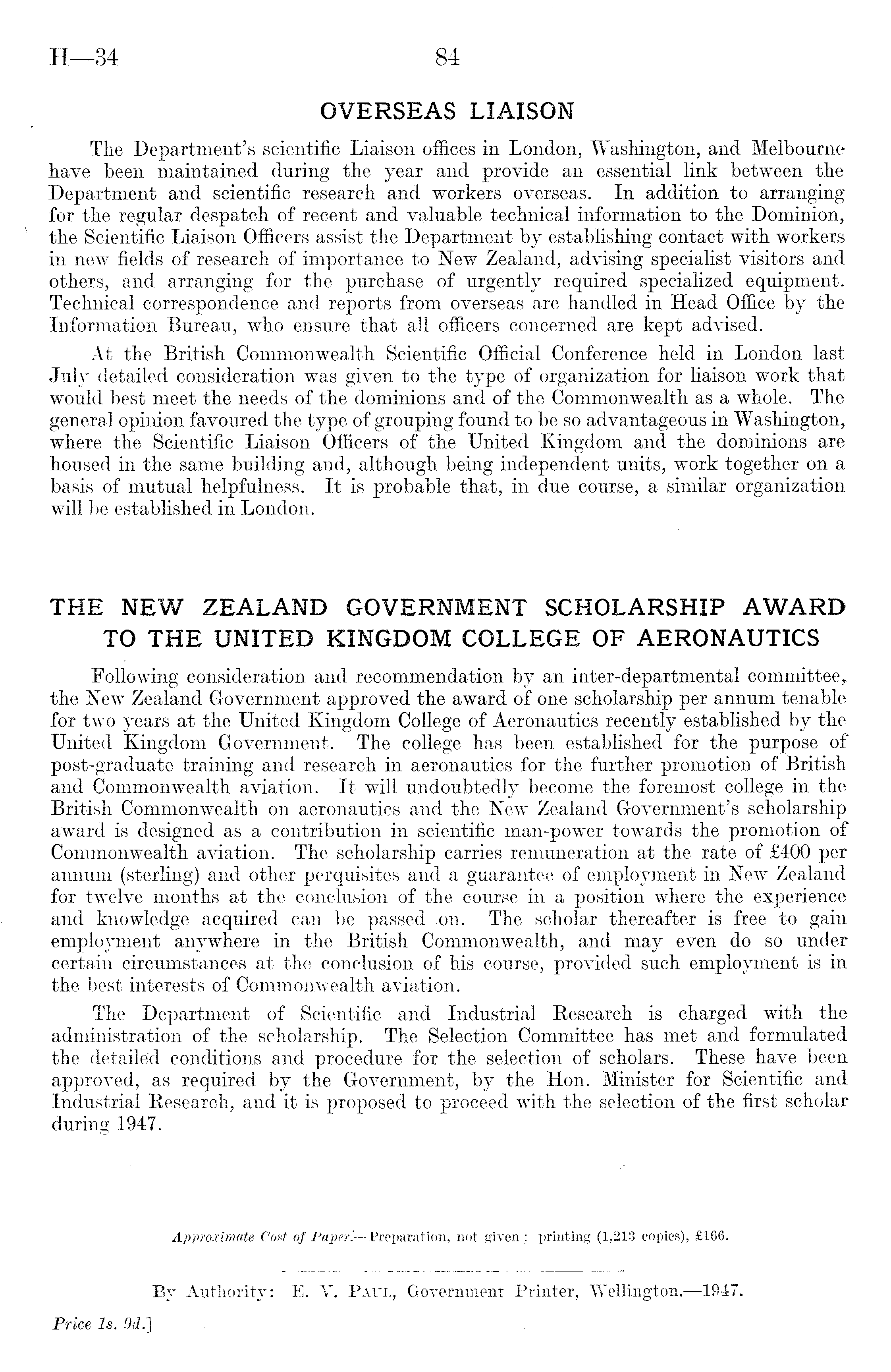 OVERSEAS LIAISON The Department's scientific Liaison offices in London, Washington, and Melbourne have been maintained during the year and provide an essential link between the Department and scientific research and workers overseas. In addition to arranging for the regular despatch of recent and valuable technical information to the Dominion, the Scientific Liaison Officers assist the Department by establishing contact with workers in new fields of research of importance to New Zealand, advising specialist visitors and others, and arranging for the purchase of urgently required specialized equipment. Technical correspondence and reports from overseas are handled in Head Office by the Information Bureau, who ensure that all officers concerned are kept advised. At the British Commonwealth Scientific Official Conference held in London last July detailed consideration was given to the type of organization for liaison work that would best meet the needs of the dominions and of the Commonwealth as a whole. The general opinion favoured the type of grouping found to be so advantageous in where the Scientific Liaison Officers of the United Kingdom and the dominions are housed in the same building and, although being independent units, work together on a basis of mutual helpfulness. It is probable that, in due course, a similar organization will be established in London. THE NEW ZEALAND GOVERNMENT SCHOLARSHIP AWARD TO THE UNITED KINGDOM COLLEGE OF AERONAUTICS Following consideration and recommendation by an inter-departmental committee,, the New Zealand Government approved the award of one scholarship per annum tenable for two years at the United Kingdom College of Aeronautics recently established by the United Kingdom Government. The college has been established for the purpose of post-graduate training and research in aeronautics for the further promotion of British and Commonwealth aviation. It will undoubtedly become the foremost college in the British Commonwealth on aeronautics and the New Zealand Government's scholarship award is designed as a contribution in scientific man-power towards the promotion of Commonwealth aviation. The scholarship carries remuneration at the rate of £4OO per annum (sterling) and other perquisites and a guarantee of employment in New Zealand for twelve months at the conclusion of the course in a position where the experience and knowledge acquired can be passed .on. The scholar thereafter is free to gain employment anywhere in the British Commonwealth, and may even do so under certain circumstances at the conclusion of his course, provided such employment is in the best interests of Commonwealth aviation. The Department of Scientific and Industrial Research is charged with the administration of the scholarship. The Selection Committee has met and formulated the detailed conditions and procedure for the selection of scholars. These have been approved, as required by the Government, by the Hon. Minister for Scientific and Industrial Research, and it is proposed to proceed with the selection of the first scholar during 1947.