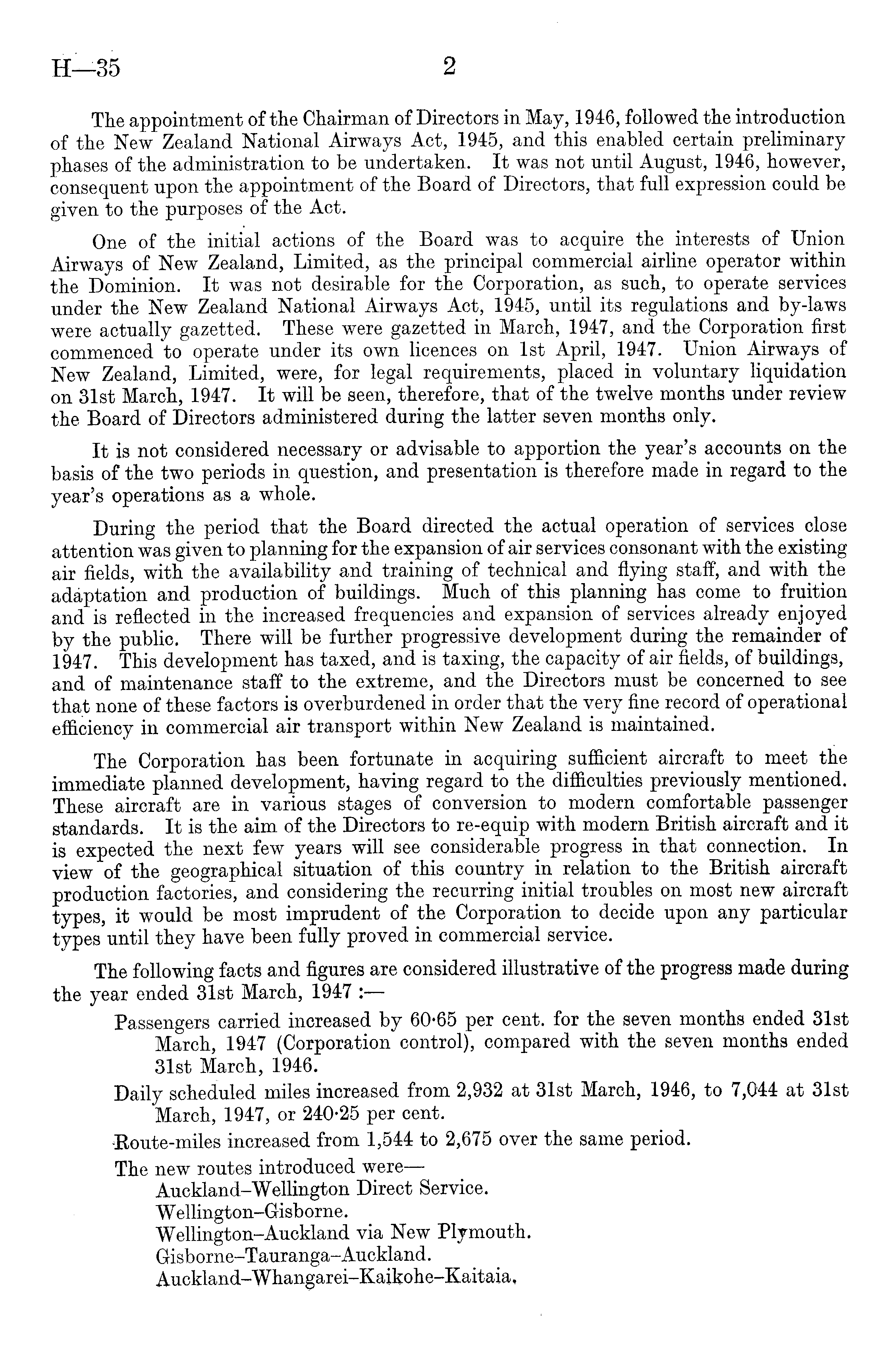 The appointment of the Chairman of Directors in May, 1946, followed the introduction of the New Zealand National Airways Act, 1945, and this enabled certain preliminary phases of the administration to be undertaken. It was not until August, 1946, however, consequent upon the appointment of the Board of Directors, that full expression could be given to the purposes of the Act. One of the initial actions of the Board was to acquire the interests of Union Airways of New Zealand, Limited, as the principal commercial airline operator within the Dominion. It was not desirable for the Corporation, as such, to operate services under the New Zealand National Airways Act, 1945, until its regulations and by-laws were actually gazetted. These were gazetted in March, 1947, and the Corporation first commenced to operate under its own licences on Ist April, 1947. Union Airways of New Zealand, Limited, were, for legal requirements, placed in voluntary liquidation on 31st March, 1947. It will be seen, therefore, that of the twelve months under review the Board of Directors administered during the latter seven months only. It is not considered necessary or advisable to apportion the year's accounts on the basis of the two periods in question, and presentation is therefore made in regard to the year's operations as a whole. During the period that the Board directed the actual operation of services close attention was given to planning for the expansion of air services consonant with the existing air fields, with the availability and training of technical and flying staff, and with the adaptation and production of buildings. Much of this planning has come to fruition and is reflected in the increased frequencies and expansion of services already enjoyed by the public. There will be further progressive development during the remainder of 1947. This development has taxed, and is taxing, the capacity of air fields, of buildings, and of maintenance staff to the extreme, and the Directors must be concerned to see that none of these factors is overburdened in order that the very fine record of operational efficiency in commercial air transport within New Zealand is maintained. The Corporation has been fortunate in acquiring sufficient aircraft to meet the immediate planned development, having regard to the difficulties previously mentioned. These aircraft are in various stages of conversion to modern comfortable passenger standards. It is the aim of the Directors to re-equip with modern British aircraft and it is expected the next few years will see considerable progress in that connection. In view of the geographical situation of this country in relation to the British aircraft production factories, and considering the recurring initial troubles on most new aircraft types, it would be most imprudent of the Corporation to decide upon any particular types until they have been fully proved in commercial service. The following facts and figures are considered illustrative of the progress made during the year ended 31st March, 1947 : Passengers carried increased by 60-65 per cent, for the seven months ended 31st March, 1947 (Corporation control), compared with the seven months ended 31st March, 1946. Daily scheduled miles increased from 2,932 at 31st March, 1946, to 7,044 at 31st March, 1947, or 240-25 per cent. increased from 1,544 to 2,675 over the same period. The new routes introduced were — Auckland-Wellington Direct Service. Wellington-Gisborne. Wellington-Auckland via New Plymouth. Gisborne-Tauranga-Auckland. Auckland-Whangarei-Kaikohe-Kaitaia,