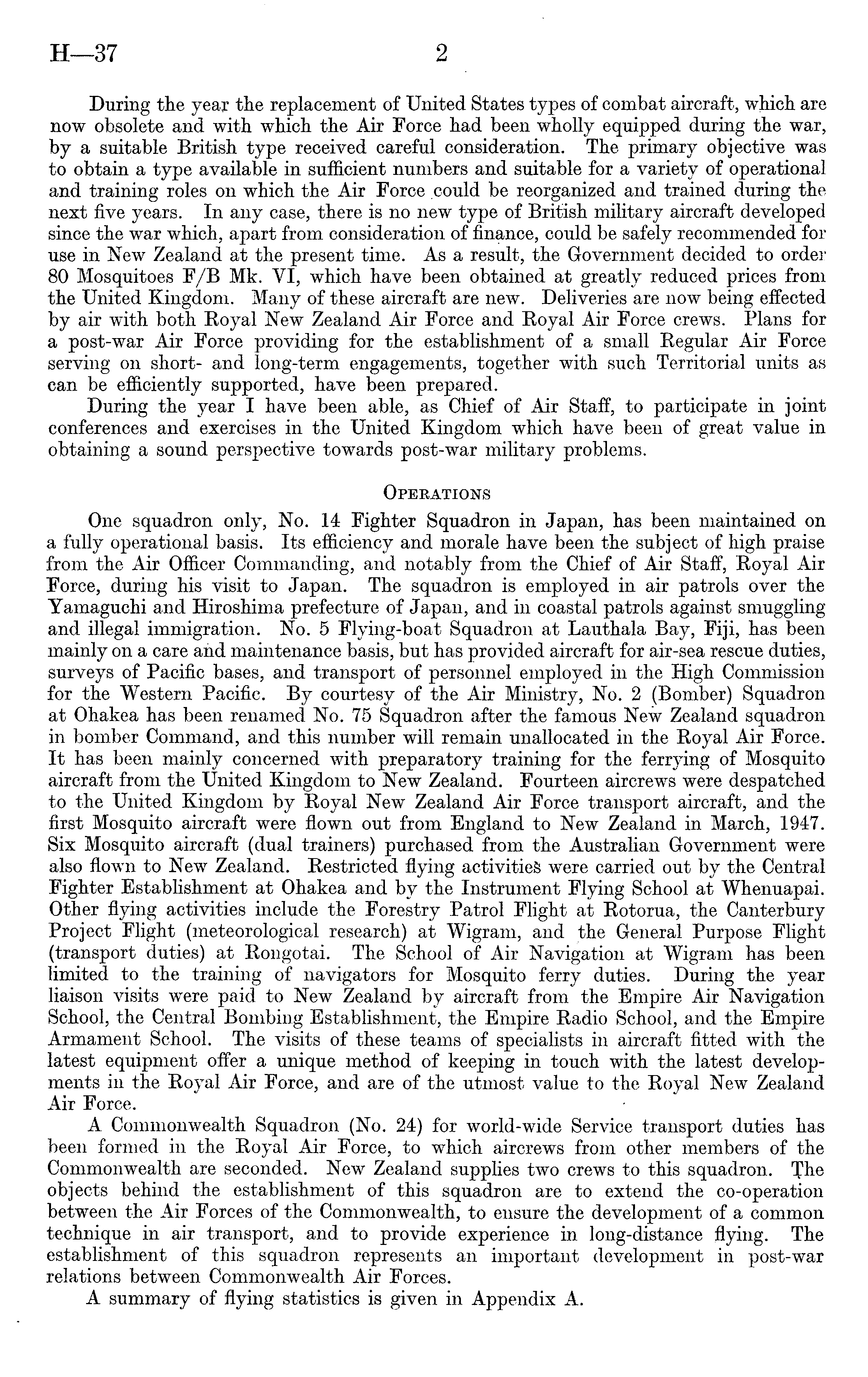 During the year the replacement of United States types of combat aircraft, which are now obsolete and with which the Air Force had been wholly equipped during the war, by a suitable British type received careful consideration. The primary objective was to obtain a type available in sufficient numbers and suitable for a variety of operational and training roles on which the Air Force could be reorganized and trained during the next five years. In any case, there is no new type of British military aircraft developed since the war which, apart from consideration of finance, could be safely recommended for use in New Zealand at the present time. As a result, the Government decided to order 80 Mosquitoes F/B Mk. YI, which have been obtained at greatly reduced prices from the United Kingdom. Many of these aircraft are new. Deliveries are now being effected by air with both Royal New Zealand Air Force and Royal Air Force crews. Plans for a post-war Air Force providing for the establishment of a small Regular Air Force serving on short- and long-term engagements, together with such Territorial units as can be efficiently supported, have been prepared. During the year I have been able, as Chief of Air Staff, to participate in joint conferences and exercises in the United Kingdom which have been of great value in obtaining a sound perspective towards post-war military problems. Operations One squadron only, No. 14 Fighter Squadron in Japan, has been maintained on a fully operational basis. Its efficiency and morale have been the subject of high praise from the Air Officer Commanding, and notably from the Chief of Air Staff, Royal Air Force, during his visit to Japan. The squadron is employed in air patrols over the Yamaguchi and Hiroshima prefecture of Japan, and in coastal patrols against smuggling and illegal immigration. No. 5 Flying-boat Squadron at Lauthala Bay, Fiji, has been mainly on a care and maintenance basis, but has provided aircraft for air-sea rescue duties, surveys of Pacific bases, and transport of personnel employed in the High Commission for the Western Pacific. By courtesy of the Air Ministry, No. 2 (Bomber) Squadron at Ohakea has been renamed No. 75 Squadron after the famous New Zealand squadron in bomber Command, and this number will remain unallocated in the Royal Air Force. It has been mainly concerned with preparatory training for the ferrying of Mosquito aircraft from the United Kingdom to New Zealand. Fourteen aircrews were despatched to the United Kingdom by Royal New Zealand Air Force transport aircraft, and the first Mosquito aircraft were flown out from England to New Zealand in March, 1947. Six Mosquito aircraft (dual trainers) purchased from the Australian Government were also flown to New Zealand. Restricted flying activities were carried out by the Central Fighter Establishment at Ohakea and by the Instrument Flying School at Whenuapai. Other flying activities include the Forestry Patrol Flight at Rotorua, the Canterbury Project Flight (meteorological research) at Wigram, and the General Purpose Flight (transport duties) at Rongotai. The School of Air Navigation at Wigram has been limited to the training of navigators for Mosquito ferry duties. During the year liaison visits were paid to New Zealand by aircraft from the Empire Air Navigation School, the Central Bombing Establishment, the Empire Radio School, and the Empire Armament School. The visits of these teams of specialists in aircraft fitted with the latest equipment offer a unique method of keeping in touch with the latest developments in the Royal Air Force, and are of the utmost value to the Royal New Zealand Air Force. A Commonwealth Squadron (No. 24) for world-wide Service transport duties has been formed in the Royal Air Force, to which aircrews from other members of the Commonwealth are seconded. New Zealand supplies two crews to this squadron. The objects behind the establishment of this squadron are to extend the co-operation between the Air Forces of the Commonwealth, to ensure the development of a common technique in air transport, and to provide experience in long-distance flying. The establishment of this squadron represents an important development in post-war relations between Commonwealth Air Forces. A summary of flying statistics is given in Appendix A.
