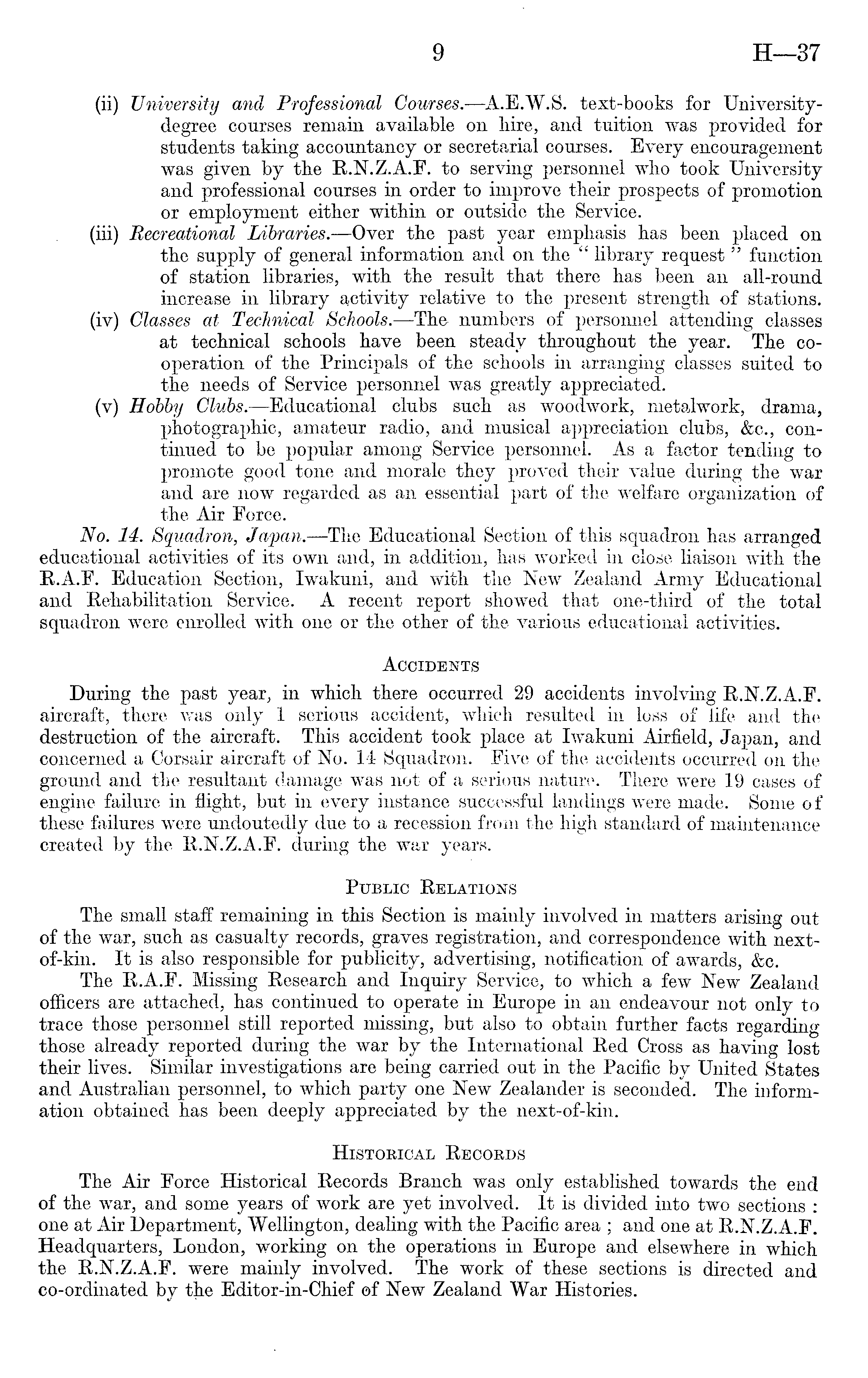 (ii) University and Professional Courses. —A.E.W.S. text-books for Universitydegree courses remain available on hire, and tuition was provided for students taking accountancy or secretarial courses. Every encouragement was given by the R.N.Z.A.F. to serving personnel who took University and professional courses in order to improve their prospects of promotion or employment either within or outside the Service. (iii) Recreational Libraries. —Over the past year emphasis has been placed on the supply of general information and on the " library request " function of station libraries, with the result that there has been an all-round increase in library activity relative to the present strength of stations. (iv) Classes at Technical Schools. —The numbers of personnel attending classes at technical schools have been steady throughout the year. The cooperation of the Principals of the schools in arranging classes suited to the needs of Service personnel was greatly appreciated. (v) Hobby Clubs. —Educational clubs such as woodwork, metalwork, drama, photographic, amateur radio, and musical appreciation clubs, &c., continued to be popular among Service personnel. As a factor tending to promote good tone and morale they proved their value during the war and are now regarded as an essential part of the welfare organization of the Air Force. No. 14. Squadron, Japan.—The Educational Section of this squadron has arranged educational activities of its own and, in addition, has worked in close liaison with the R.A.F. Education Section, Iwakuni, and with the New Zealand Army Educational and Rehabilitation Service. A recent report showed that one-third of the total squadron were enrolled with one or the other of the various educational activities. Accidents During the past year, in which there occurred 29 accidents involving R.N.Z.A.F. aircraft, there was only 1 serious accident, which resulted in loss of life and the destruction of the aircraft. This accident took place at Iwakuni Airfield, Japan, and concerned a Corsair aircraft of No. 14 Squadron. Five of the accidents occurred on the ground and the resultant damage was not of a serious nature. There were 19 cases of engine failure in flight, but in every instance successful landings were made. Some of these failures were undoutedly due to a recession from the high standard of maintenance created by the R.N.Z.A.F. during the war years. Public Relations The small staff remaining in this Section is mainly involved in matters arising out of the war, such as casualty records, graves registration, and correspondence with next-of-kin. It is also responsible for publicity, advertising, notification of awards, &c. The R.A.F. Missing Research and Inquiry Service, to which a few New Zealand officers are attached, has continued to operate in Europe in an endeavour not only to trace those personnel still reported missing, but also to obtain further facts regarding those already reported during the war by the International Red Cross as having lost their lives. Similar investigations are being carried out in the Pacific by United States and Australian personnel, to which party one New Zealander is seconded. The information obtained has been deeply appreciated by the next-of-kin. Historical Records The Air Force Historical Records Branch was only established towards the end of the war, and some years of work are yet involved. It is divided into two sections : one at Air Department, Wellington, dealing with the Pacific area ; and one at R.N.Z.A.F. Headquarters, London, working on the operations in Europe and elsewhere in which the R.N.Z.A.F. were mainly involved. The work of these sections is directed and co-ordinated by the Editor-in-Chief of New Zealand War Histories.