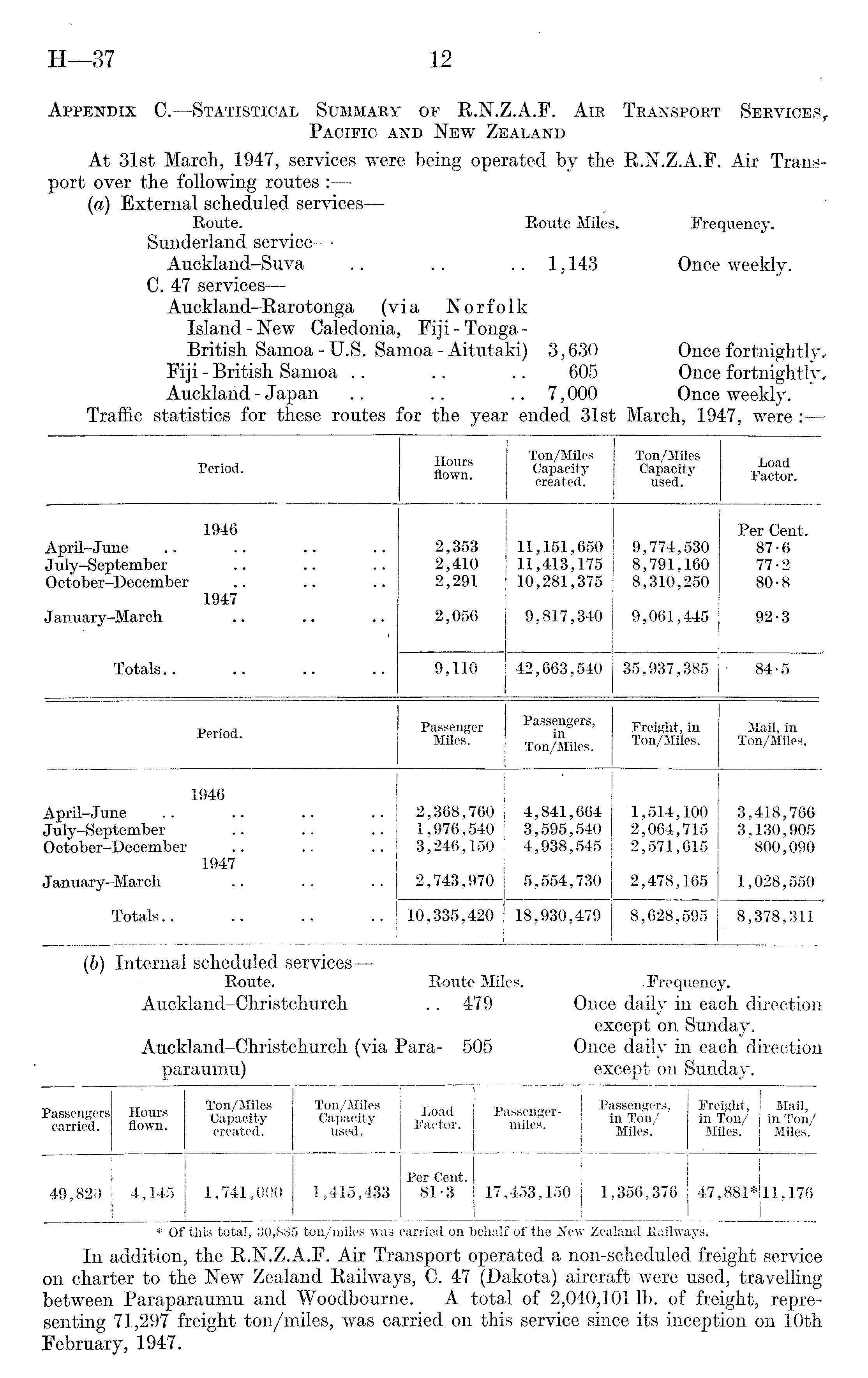 Appendix C.—Statistical Summary op R.N.Z.A.F. Air Transport Services, Pacific and New Zealand At 31st March, 1947, services were being operated by the R.N.Z.A.F. Air Transport over the following routes (a) External scheduled services— Route. Route Miles. Frequency. Sunderland service— Auckland-Suva .. .. .. 1,143 Once weekly. C. 47 services— Auckland-Rarotonga (via Norfolk Island-New Caledonia, Fiji-Tonga-British Samoa-U.S. Samoa-Aitutaki) 3,630 Once fortnightly, Fiji - British Samoa .. .. .. 605 Once fortnightly, Auckland - Japan .. .. .. 7,000 Once weekly. Traffic statistics for these routes for the year ended 31st March, 1947, were : —-