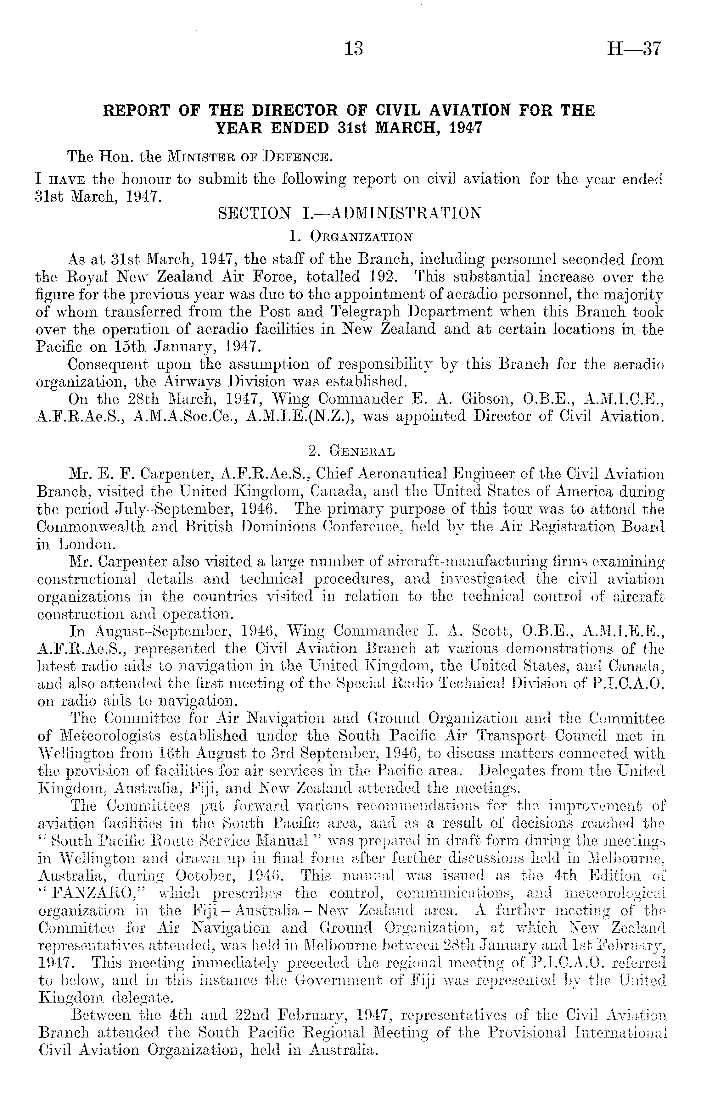 REPORT OF THE DIRECTOR OF CIVIL AVIATION FOR THE YEAR ENDED 31st MARCH, 1947 The Hon. the Minister op Defence. I have the honour to submit the following report on civil aviation for the year ended 31st March, 1947. SECTION I.—ADMINISTRATION 1. Organization As at 31st March, 1947, the staff of the Branch, including personnel seconded from the Royal New Zealand Air Force, totalled 192. This substantial increase over the figure for the previous year was due to the appointment of aeradio personnel, the majority of whom transferred from the Post and Telegraph Department when this Branch took over the operation of aeradio facilities in New Zealand and at certain locations in the Pacific on 15th January, 1947. Consequent upon the assumption of responsibility by this Branch for the aeradio organization, the Airways Division was established. On the 28th March, 1947, Wing Commander E. A. Gibson, 0.8. E., A.M.1.C.E., A.F.R.Ae.S., A.M.A.Soc.Ce., A.M.1.E.(N.Z.), was appointed Director of Civil Aviation. 2. General Mr. E. F. Carpenter, A.F.R.Ae.S., Chief Aeronautical Engineer of the Civil Aviation Branch, visited the United Kingdom, Canada, and the United States of America during the period July-September, 1946. The primary purpose of this tour was to attend the Commonwealth and British Dominions Conference, held by the Air Registration Board in London. Mr. Carpenter also -visited a large number of aircraft-manufacturing firms examining constructional details and technical procedures, and investigated the civil aviation organizations in the countries visited in relation to the technical control of aircraft construction and operation. In August-September, 1946, Wing Commander I. A. Scott, 0.8. E., A.M.1.E.E., A.F.R.Ae.S., represented the Civil Aviation Branch at various demonstrations of the latest radio aids to navigation in the United Kingdom, the United States, and Canada, and also attended the first meeting of the Special Radio Technical Division of P.1.C.A.0. on radio aids to navigation. The Committee for Air Navigation and Ground Organization and the Committee of Meteorologists established under the South Pacific Air Transport Council met in Wellington from 16th August to 3rd September, 1946, to discuss matters connected with the provision of facilities for air services in the Pacific area. Delegates from the United Kingdom, Australia, Fiji, and New Zealand attended the meetings. The Committees put forward various recommendations for the improvement of aviation facilities in the South Pacific area, and as a result of decisions reached the " South Pacific Route Service Manual " was prepared in draft form during the meetings in Wellington and drawn up in final form after further discussions held in Melbourne, Australia, during October, 1946. This manual was issued as the 4th Edition of " FANZARO," which prescribes the control, communications, and meteorological organization in the Fiji - Australia - New Zealand area. A further meeting of the Committee for Air Navigation and Ground Organization, at which New Zealand representatives attended, was held in Melbourne between 28th January and Ist February, 1947. This meeting immediately preceded the regional meeting of P.1.C.A.0. referred to below, and in this instance the Government of Fiji was represented by the United Kingdom delegate. Between the 4th and 22nd February, 1947, representatives of the Civil Aviation Branch attended the South Pacific Regional Meeting of the Provisional International Civil Aviation Organization, held in Australia.