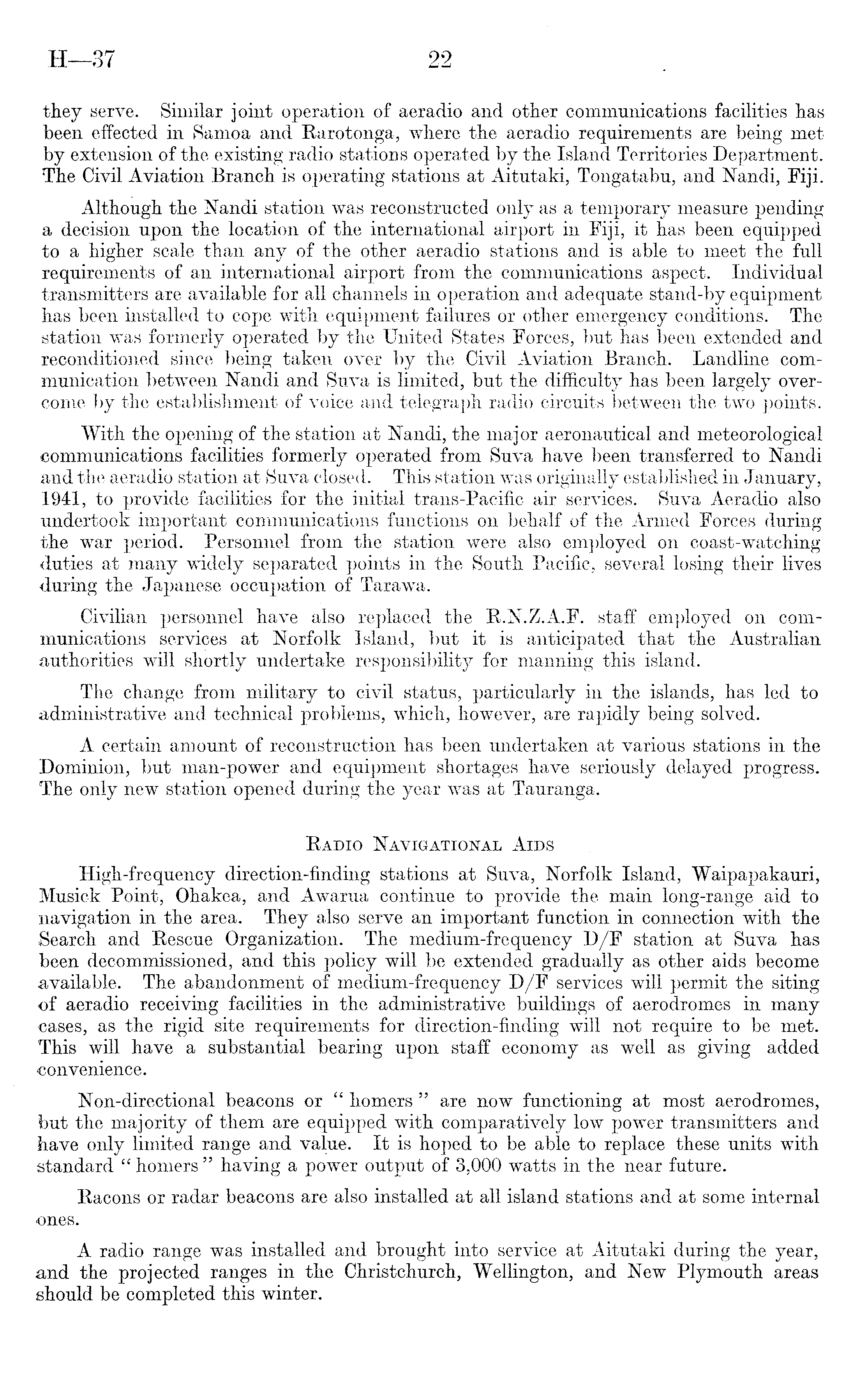 they serve. Similar joint operation of aeradio and other communications facilities has been effected in Samoa and Rarotonga, where the aeradio requirements are being met by extension of the existing radio stations operated by the Island Territories Department. The Civil Aviation Branch is operating stations at Aitutaki, Tongatabu, and Nandi, Fiji. Although the Nandi station was reconstructed only as a temporary measure pending a decision upon the location of the international airport in Fiji, it has been equipped to a higher scale than any of the other aeradio stations and is able to meet the fall requirements of an international airport from the communications aspect. Individual transmitters are available for all channels in operation and adequate stand-by equipment has been installed to cope with equipment failures or other emergency conditions. The station was formerly operated by the United States Forces, but has been extended and reconditioned since being taken over by the Civil Aviation Branch. Landline communication between Nandi and Suva is limited, but the difficulty has been largely overcome by the establishment of voice and telegraph radio circuits between the two points. With the opening of the station at Nandi, the major aeronautical and meteorological communications facilities formerly operated from Suva have been transferred to Nandi and the aeradio station at Suva closed. This station was originally established in January, 1941, to provide facilities for the initial trans-Pacific air services. Suva Aeradio also undertook important communications functions on behalf of the Armed Forces during the war period. Personnel from the station were also employed on coast-watching duties at many widely separated points in the South Pacific, several losing their lives during the Japanese occupation of Tarawa. Civilian personnel have also replaced the R.N.Z.A.F. staff employed on communications services at Norfolk Island, but it is anticipated that the Australian authorities will shortly undertake responsibility for manning this island. The change from military to civil status, particularly in the islands, has led to administrative and technical problems, which, however, are rapidly being solved. A certain amount of reconstruction has been undertaken at various stations in the Dominion, but man-power and equipment shortages have seriously delayed progress. The only new station opened during the year was at Tauranga. Radio Navigational Aids High-frequency direction-finding stations at Suva, Norfolk Island, Waipapakauri, Musick Point, Ohakea, and Awarua continue to provide the main long-range aid to navigation in the area. They also serve an important function in connection with the Search and Rescue Organization. The medium-frequency D/F station at Suva has been decommissioned, and this policy will be extended gradually as other aids become available. The abandonment of medium-frequency D/F services will permit the siting of aeradio receiving facilities in the administrative buildings of aerodromes in many cases, as the rigid site requirements for direction-finding will not require to be met. This will have a substantial bearing upon staff economy as well as giving added convenience. Non-directional beacons or " homers " are now functioning at most aerodromes, but the majority of them are equipped with comparatively low power transmitters and have only limited range and value. It is hoped to be able to replace these units with standard " homers " having a power output of 3,000 watts in the near future. Racons or radar beacons are also installed at all island stations and at some internal ones. A radio range was installed and brought into service at Aitutaki during the year, and the projected ranges in the Christchurch, Wellington, and New Plymouth areas should be completed this winter.