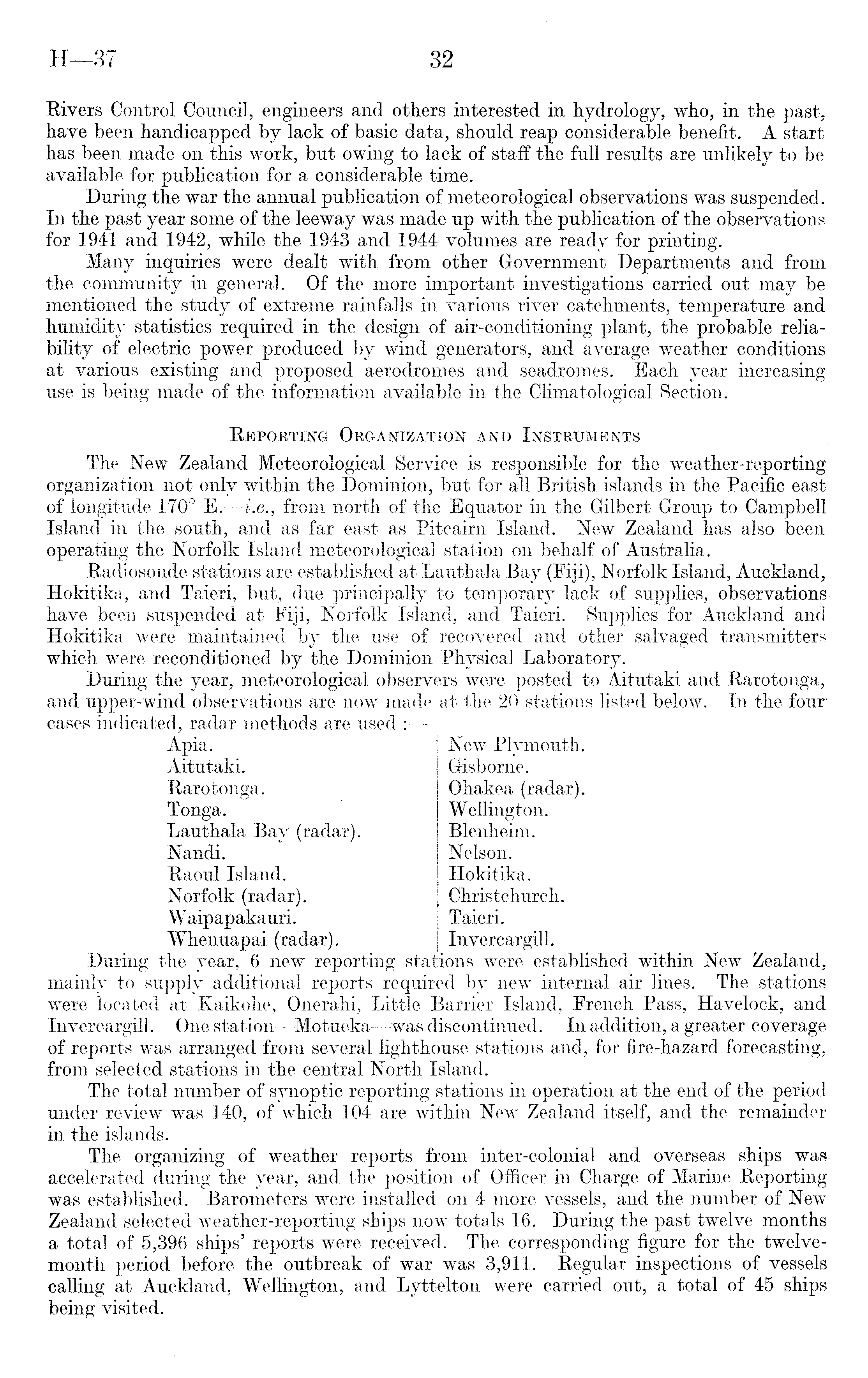 Rivers Control Council, engineers and others interested in hydrology, who, in the past, have been handicapped by lack of basic data, should reap considerable benefit. A start has been made on this work, but owing to lack of staff the full results are unlikely to be available for publication for a considerable time. During the war the annual publication of meteorological observations was suspended. In the past year some of the leeway was made up with the publication of the observations for 1941 and 1942, while the 1943 and 1944 volumes are ready for printing. Many inquiries were dealt with from other Government Departments and from the community in general. Of the more important investigations carried out may be mentioned the study of extreme rainfalls in various river catchments, temperature and humidity statistics required in the design of air-conditioning plant, the probable reliability of electric power produced by wind generators, and average weather conditions at various existing and proposed aerodromes and seadromes. Each year increasing use is being made of the information available in the Climatological Section. Reporting Organization and Instruments The New Zealand Meteorological Service is responsible for the weather-reporting organization not only within the Dominion, but for all British islands in the Pacific east of longitude 170° E. —i.e., from north of the Equator in the Gilbert Group to Campbell Island in the south, and as far east as Pitcairn Island. New Zealand has also been operating the Norfolk Island meteorological station on behalf of Australia. Radiosonde stations are established at Lauthala Bay (Fiji), Norfolk Island, Auckland, Hokitika, and Taieri, but, due principally to temporary lack of supplies, observationshave been suspended at Fiji, Norfolk Island, and Taieri. Supplies for Auckland and Hokitika were maintained by the use of recovered and other salvaged transmitters which were reconditioned by the Dominion Physical Laboratory. During the year, meteorological observers were posted to Aitutaki and Rarotonga, and upper-wind observations are now made at the 20 stations listed below. In the four cases indicated, radar methods are used : Apia. New Plymouth. Aitutaki. Gisborne. Rarotonga. Ohakea (radar). Tonga. Wellington. Lauthala Bay (radar). Blenheim. Nandi. Nelson. Raoul Island. Hokitika. Norfolk (radar). Christchurch. Waipapakauri. Taieri. Whenuapai (radar). Invercargill. During the year, 6 new reporting stations were established within New Zealand, mainly to supply additional reports required by new internal air lines. The stations were located at Kaikohe, Onerahi, Little Barrier Island, French Pass, Havelock, and Invercargill. One station —Motueka —was discontinued. In addition, a greater coverage of reports was arranged from several lighthouse stations and, for fire-hazard forecasting, from selected stations in the central North Island. The total number of synoptic reporting stations in operation at the end of the period under review was 140, of which 104 are within New Zealand itself, and the remainder in the islands. The organizing of weather reports from inter-colonial and overseas ships wasaccelerated during the year, and the position of Officer in Charge of Marine Reporting was established. Barometers were installed on 4 more vessels, and the number of New Zealand selected weather-reporting ships now totals 16. During the past twelve months a total of 5,396 ships' reports were received. The corresponding figure for the twelvemonth period before the outbreak of war was 3,911. Regular inspections of vessels calling at Auckland, Wellington, and Lyttelton were carried out, a total of 45 shipsbeing visited.