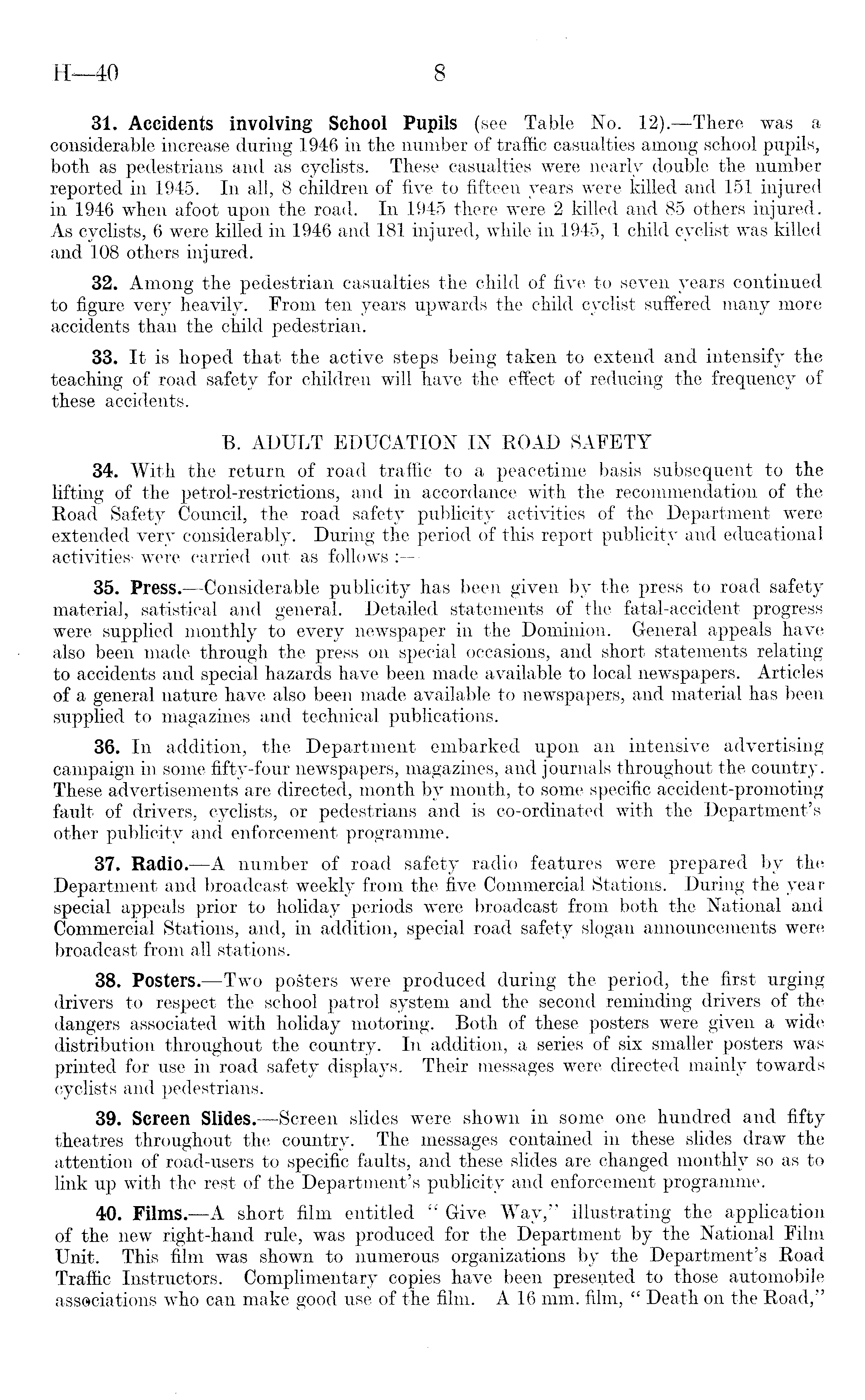 31. Accidents involving School Pupils (see Table No. 12). —There was a considerable increase during 1946 in the number of traffic casualties among school pupils, both as pedestrians and as cyclists. These casualties were nearly double the number reported in 1945. In all, 8 children of five to fifteen years were killed and 151 injured in 1946 when afoot upon the road. In 1945 there were 2 killed and 85 others injured. As cyclists, 6 were killed in 1946 and 181 injured, while in 1945, 1 child cyclist was killed and 108 others injured. 32. Among the pedestrian casualties the child of five to seven years continued to figure very heavily. From ten years upwards the child cyclist suffered many more accidents than the child pedestrian. 33. It is hoped that the active steps being taken to extend and intensify the teaching of road safety for children will have the effect of reducing the frequency of these accidents. B. ADULT EDUCATION IN ROAD SAFETY 34. With the return of road traffic to a peacetime basis subsequent to the lifting of the petrol-restrictions, and in accordance with the recommendation of the Road Safety Council, the road safety publicity activities of the Department were extended very considerably. During the period of this report publicity and educational activities- were carried out as follows : 35. Press. —Considerable publicity has been given by the press to road safety material, satistical and general. Detailed statements of the fatal-accident progress were supplied monthly to every newspaper in the Dominion. General appeals have also been made through the press on special occasions, and short statements relating to accidents and special hazards have been made available to local newspapers. Articles of a general nature have also been made available to newspapers, and material has been supplied to magazines and technical publications. 36. In addition, the Department embarked upon an intensive advertising campaign in some fifty-four newspapers, magazines, and journals throughout the country. These advertisements are directed, month by month, to some specific accident-promoting fault of drivers, cyclists, or pedestrians and is co-ordinated with the Department's other publicity and enforcement programme. 37. Radio. —A number of road safety radio features were prepared by the Department and broadcast weekly from the five Commercial Stations. During the year special appeals prior to holiday periods were broadcast from both the National and Commercial Stations, and, in addition, special road safety slogan announcements were broadcast from all stations. 38. Posters.—Two posters were produced during the period, the first urging drivers to respect the school patrol system and the second reminding drivers of the dangers associated with holiday motoring. Both of these posters were given a wide distribution throughout the country. In addition, a series of six smaller posters was printed for use in road safety displays. Their messages were directed mainly towards cyclists and pedestrians. 39. Screen Slides. —Screen slides were shown in some one hundred and fifty theatres throughout the country. The messages contained in these slides draw the attention of road-users to specific faults, and these slides are changed monthly so as to link up with the rest of the Department's publicity and enforcement programme. 40. Films. —A short film entitled " Give Way," illustrating the application of the new right-hand rule, was produced for the Department by the National Film Unit. This film was shown to numerous organizations by the Department's Road Traffic Instructors. Complimentary copies have been presented to those automobile associations who can make good use of the film. Al6 mm. film, " Death on the Road,"