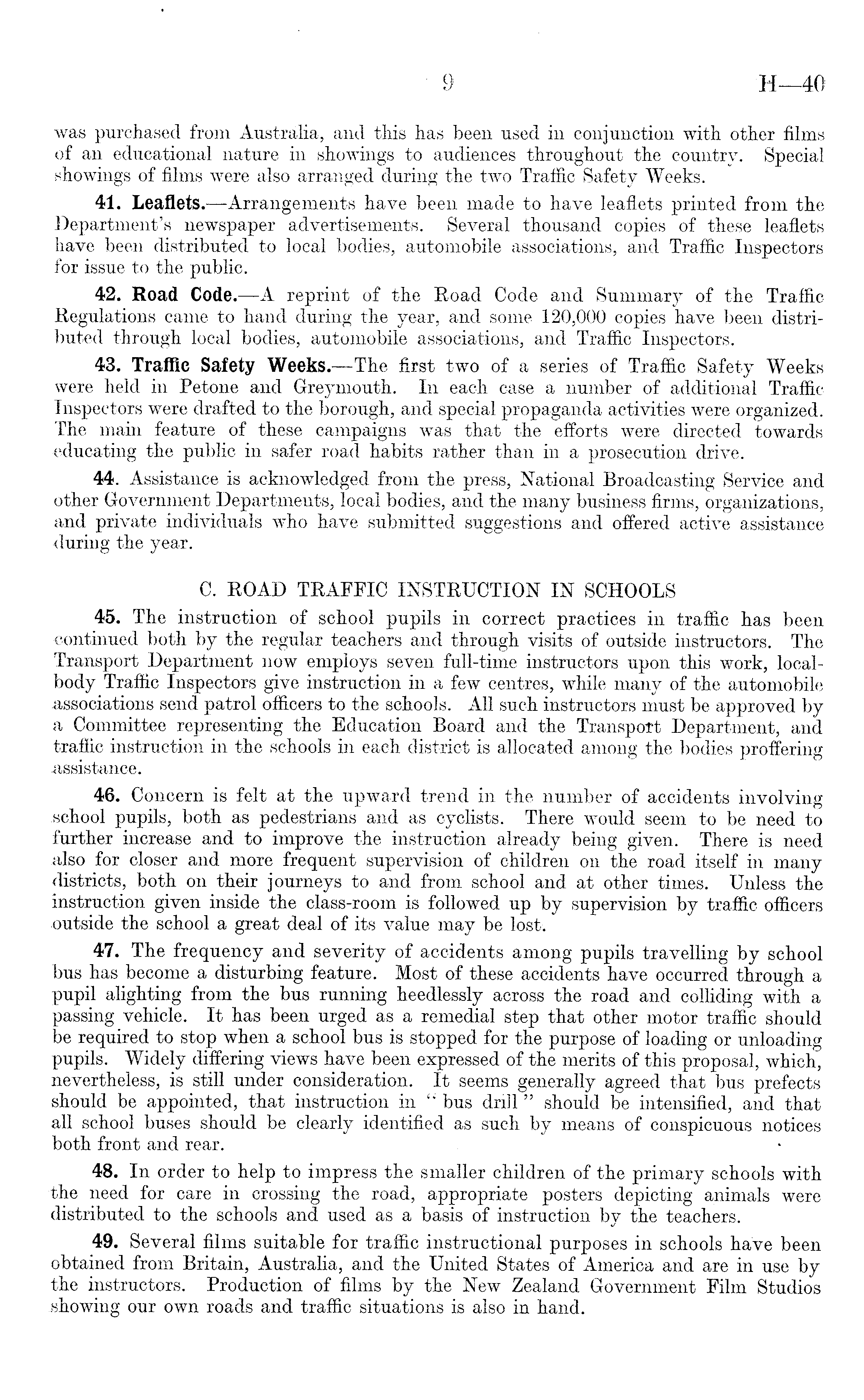 was purchased from Australia, and this has been used in conjunction with other films of an educational nature in showings to audiences throughout the country. Special showings of films were also arranged during the two Traffic Safety Weeks. 41. Leaflets. —Arrangements have been made to have leaflets printed from the Department's newspaper advertisements. Several thousand copies of these leaflets have been distributed to local bodies, automobile associations, and Traffic Inspectors for issue to the public. 42. Road Code. —A reprint of the Road Code and Summary of the Traffic Regulations came to hand during the year, and some 120,000 copies have been distributed through local bodies, automobile associations, and Traffic Inspectors. 43. Traffic Safety Weeks. —The first two of a series of Traffic Safety Weeks were held in Petone and Greymouth. In each case a number of additional Traffic Inspectors were drafted to the borough, and special propaganda activities were organized. The main feature of these campaigns was that the efforts were directed towards educating the public in safer road habits rather than in a prosecution drive. 44. Assistance is acknowledged from the press, National Broadcasting Service and other Government Departments, local bodies, and the many business firms, organizations, and private individuals who have submitted suggestions and offered active assistance •during the year. C. ROAD TRAFFIC INSTRUCTION IN SCHOOLS 45. The instruction of school pupils in correct practices in traffic has been continued both by the regular teachers and through visits of outside instructors. The Transport Department now employs seven full-time instructors upon this work, localbody Traffic Inspectors give instruction in a few centres, while many of the automobile -associations send patrol officers to the schools. All such instructors must be approved by a Committee representing the Education Board and the Transport Department, and traffic instruction in the schools in each district is allocated among the bodies proffering assistance. 46. Concern is felt at the upward trend in the number of accidents involving school pupils, both as pedestrians and as cyclists. There would seem to be need to further increase and to improve the instruction already being given. There is need also for closer and more frequent supervision of children on the road itself in many districts, both on their journeys to and from school and at other times. Unless the instruction given inside the class-room is followed up by supervision by traffic officers outside the school a great deal of its value may be lost. 47. The frequency and severity of accidents among pupils travelling by school bus has become a disturbing feature. Most of these accidents have occurred through a pupil alighting from the bus running heedlessly across the road and colliding with a passing vehicle. It has been urged as a remedial step that other motor traffic should be required to stop when a school bus is stopped for the purpose of loading or unloading pupils. Widely differing views have been expressed of the merits of this proposal, which, nevertheless, is still under consideration. It seems generally agreed that bus prefects should be appointed, that instruction in " bus drill" should be intensified, and that all school buses should be clearly identified as such by means of conspicuous notices both front and rear. 48. In order to help to impress the smaller children of the primary schools with the need for care in crossing the road, appropriate posters depicting animals were distributed to the schools and used as a basis of instruction by the teachers. 49. Several films suitable for traffic instructional purposes in schools have been obtained from Britain, Australia, and the United States of America and are in use by the instructors. Production of films by the New Zealand Government Film Studios showing our own roads and traffic situations is also in hand.