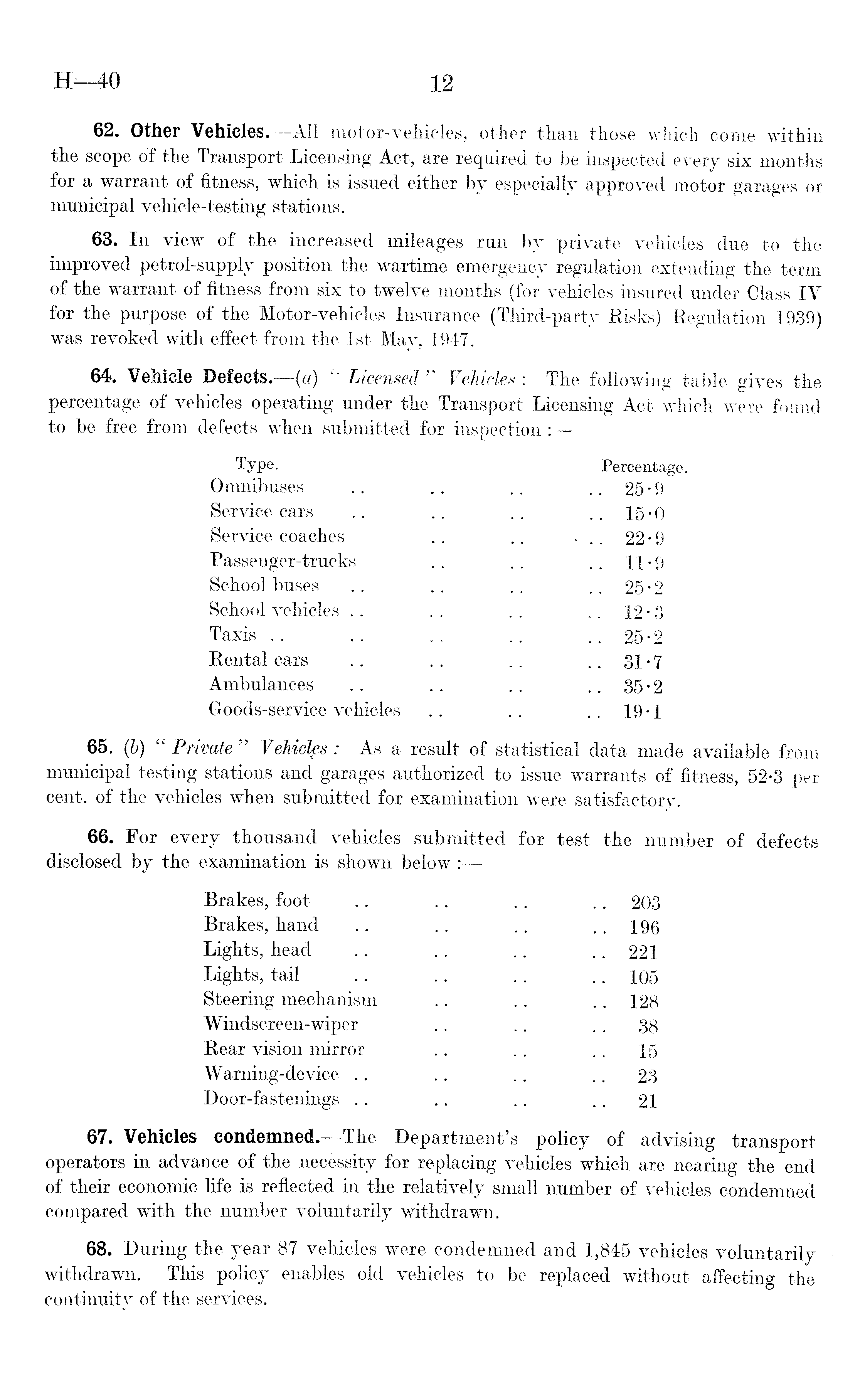 62. Other Vehicles. -All motor-vehicles, other than those which come within the scope of the Transport Licensing Act, are required to be inspected every six months for a warrant of fitness, which is issued either by especially approved motor garages or municipal vehicle-testing stations. 63. In view of the increased mileages run by private vehicles due to the improved petrol-supply position the wartime emergency regulation extending the term of the warrant of fitness from six to twelve months (for vehicles insured under Class IY for the purpose of the Motor-vehicles Insurance (Third-party Risks) Regulation 1939) was revoked with effect from the Ist May, 1947. 64. Vehicle Defeets.—(a) " Licensed " Vehicles : The following table gives the percentage of vehicles operating under the Transport Licensing Act which were found to be free from defects when submitted for inspection : Type. Percentage. Omnibuses .. .. .. .. 25-9 Service cars .. .. .. ..15*0 Service coaches .. .. ... 22-9 Passenger-trucks .. .. .. 11-9 School buses .. .. .. .. 25 • 2 School vehicles .. .. .. ..12*3 Taxis .. .. .. .. .. 25-2 Rental cars .. .. .. .. 31 • 7 Ambulances .. .. .. .. 35 • 2 Goods-service vehicles .. .. .. 19-1 65. (b) " Private " Vehicles: As a result of statistical data made available from municipal testing stations and garages authorized to issue warrants of fitness, 52*3 per cent, of the vehicles when submitted for examination were satisfactory. 66. For every thousand vehicles submitted for test the number of defects disclosed by the examination is shown below : Brakes, foot .. .. .. .. 203 Brakes, hand .. .. .. .. 196 Lights, head .. .. .. .. 221 Lights, tail .. .. .. .. 105 s Steering mechanism .. .. 128 Windscreen-wiper .. .. .. 38 Rear vision mirror .. .. .. 15 Warning-device .. .. .. 23 Door-fastenings .. .. .. .. 21 67. Vehicles condemned. —The Department's policy of advising transport operators in advance of the necessity for replacing vehicles which are nearing the end of their economic life is reflected in the relatively small number of vehicles condemned compared with the number voluntarily withdrawn. 68. During the year 87 vehicles were condemned and 1,845 vehicles voluntarily withdrawn. This policy enables old vehicles to be replaced without affecting the continuity of the services.