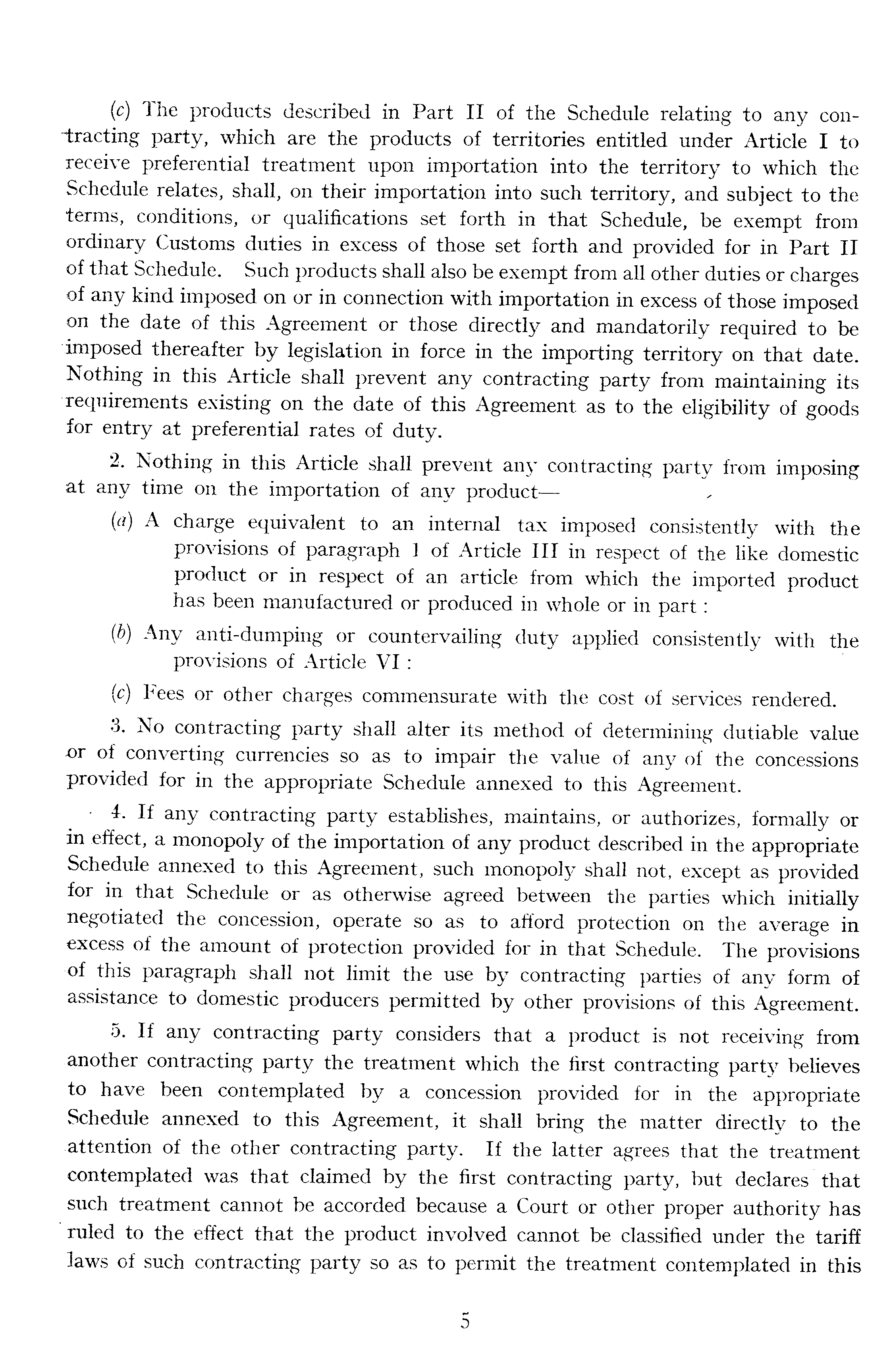 (c) The products described in Part II of the Schedule relating to any contracting party, which are the products of territories entitled under Article I to receive preferential treatment upon importation into the territory to which the Schedule relates, shall, on their importation into such territory, and subject to the terms, conditions, or qualifications set forth in that Schedule, be exempt from ordinary Customs duties in excess of those set forth and provided for in Part II of that Schedule. Such products shall also be exempt from all other duties or charges of any kind imposed on or in connection with importation in excess of those imposed on the date of this Agreement or those directly and mandatorily required to be imposed thereafter by legislation in force in the importing territory on that date. Nothing in this Article shall prevent any contracting party from maintaining its requirements existing on the date of this Agreement as to the eligibility of goods for entry at preferential rates of duty. 2. Nothing in this Article shall prevent any contracting party from imposing at any time on the importation of any product—(a) A charge equivalent to an internal tax imposed consistently with the provisions of paragraph 1 of Article 111 in respect of the like domestic product or in respect of an article from which the imported product has been manufactured or produced in whole or in part: (b) Any anti-dumping or countervailing duty applied consistently with the provisions of Article VI: (c) Fees or other charges commensurate with the cost of services rendered. 3. No contracting party shall alter its method of determining dutiable value or of converting currencies so as to impair the value of any of the concessions provided for in the appropriate Schedule annexed to this Agreement. • 4. If any contracting party establishes, maintains, or authorizes, formally or in effect, a monopoly of the importation of any product described in the appropriate Schedule annexed to this Agreement, such monopoly shall not, except as provided for in that Schedule or as otherwise agreed between the parties which initially negotiated the concession, operate so as to afford protection on the average in excess of the amount of protection provided for in that Schedule. The provisions of this paragraph shall not limit the use by contracting parties of any form of assistance to domestic producers permitted by other provisions of this Agreement. 5. If any contracting party considers that a product is not receiving from another contracting party the treatment which the first contracting party believes to have been contemplated by a concession provided for in the appropriate Schedule annexed to this Agreement, it shall bring the matter directly to the attention of the other contracting party. If the latter agrees that the treatment contemplated was that claimed by the first contracting party, but declares that such treatment cannot be accorded because a Court or other proper authority has ruled to the effect that the product involved cannot be classified under the tariff laws of such contracting party so as to permit the treatment contemplated in this