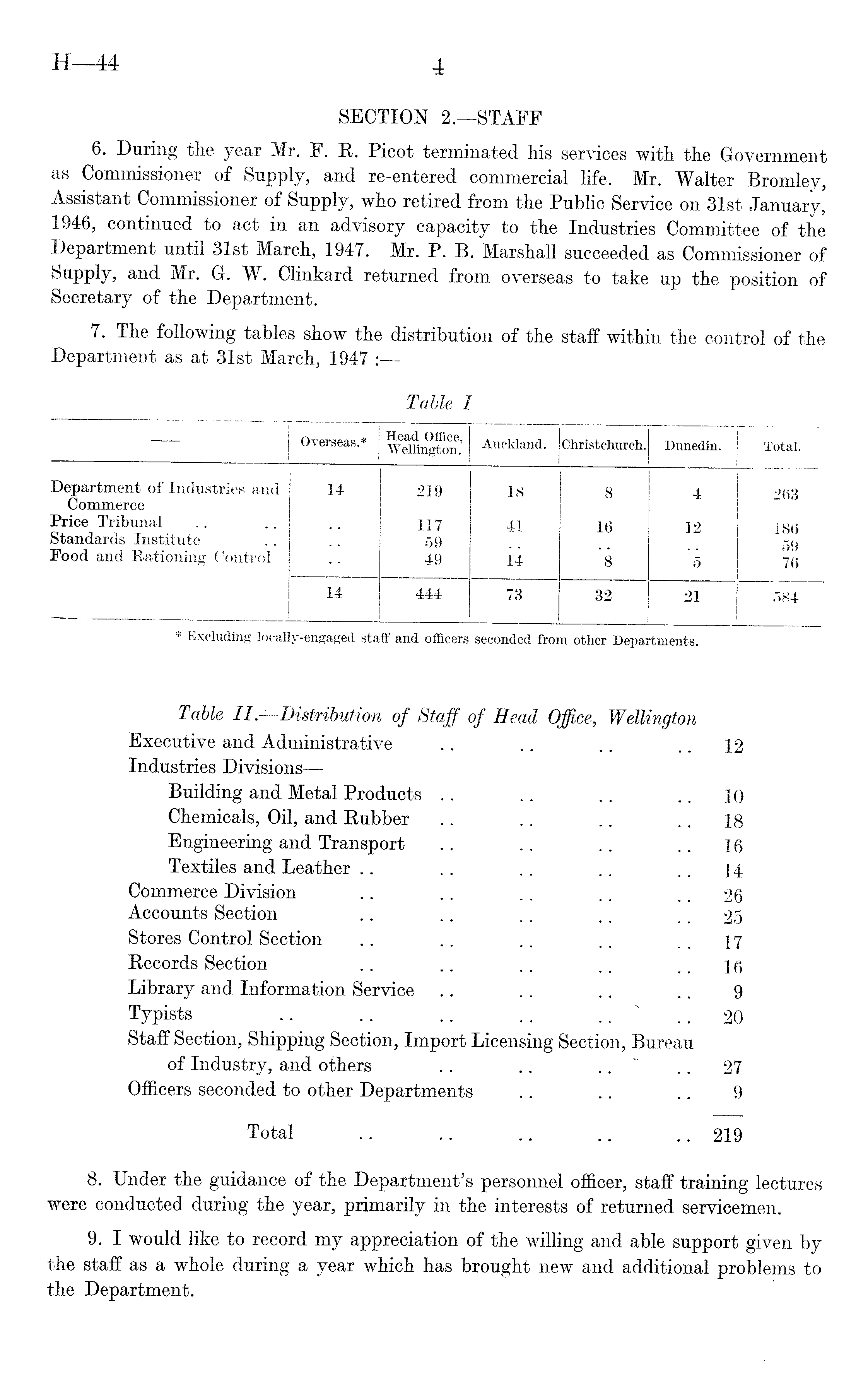 SECTION 2.—STAFF 6. During the year Mr. F. R. Picot terminated his services with the Government as Commissioner of Supply, and re-entered commercial life. Mr. Walter Bromley, Assistant Commissioner of Supply, who retired from the Publie Service on 31st January, 1946, continued to act in an advisory capacity to the Industries Committee of the Department until 31st March, 1947. Mr. P. B. Marshall succeeded as Commissioner of Supply, and Mr. Gr. W. Clinkard returned from overseas to take up the position of Secretary of the Department. 7. The following tables show the distribution of the staff within the control of the Department as at 31st March, 1947 :