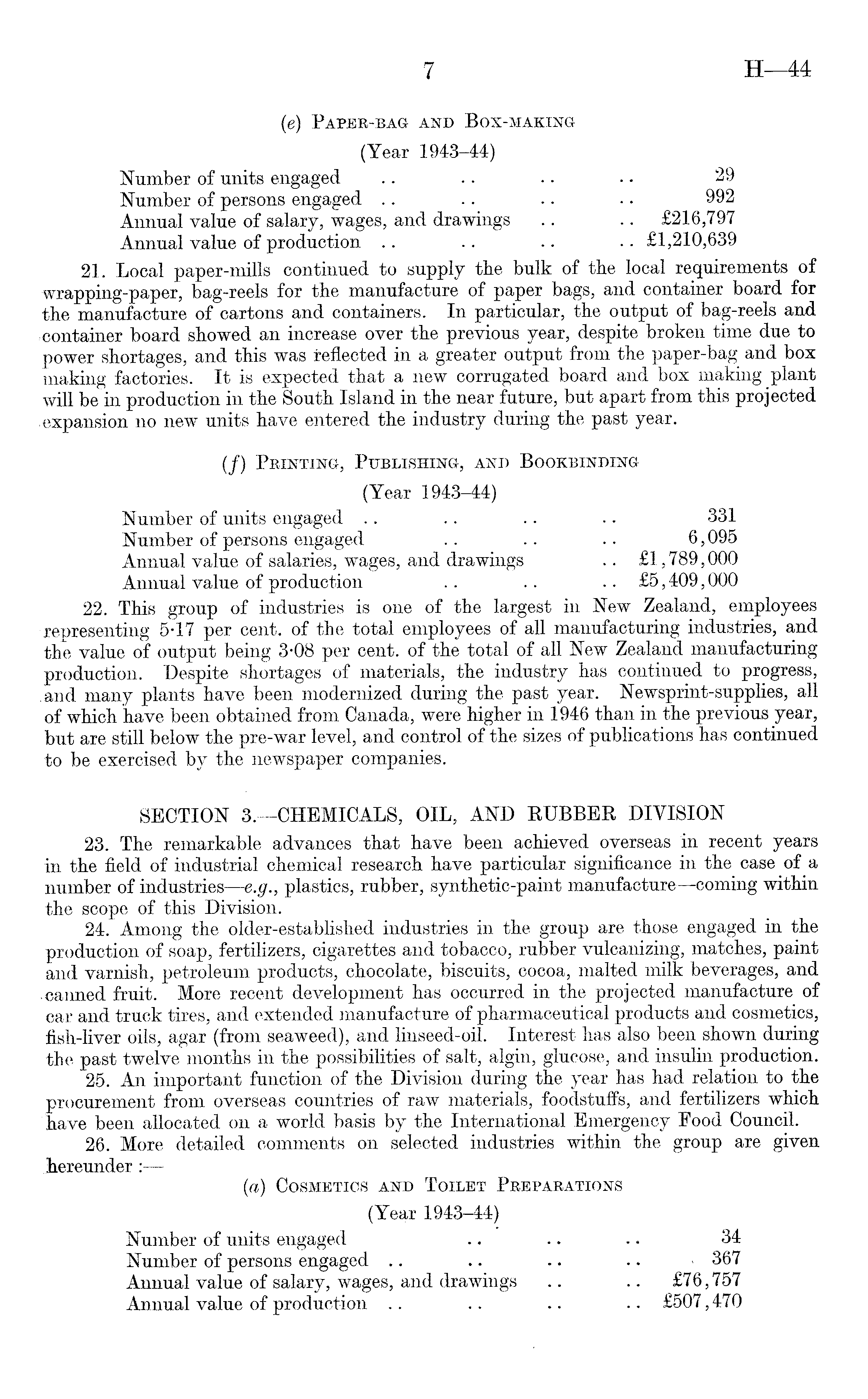 (e) Paper-bag and Box-making (Year 1943-44) Number of units engaged .. .. .. .. 29 Number of persons engaged .. . . .. .. 992 Annual value of salary, wages, and drawings .. .. £216,797 Annual value of production .. .. .. .. £1,210,639 21. Local paper-mills continued to supply the bulk of the local requirements of wrapping-paper, bag-reels for the manufacture of paper bags, and container board for the manufacture of cartons and containers. In particular, the output of bag-reels and container board showed an increase over the previous year, despite broken time due to power shortages, and this was reflected in a greater output from the paper-bag and box making factories. It is expected that a new corrugated board and box making plant will be in production in the South Island in the near future, but apart from this projected •expansion no new units have entered the industry during the past year. (/) Printing, Publishing, and Bookbinding (Year 1943-44) Number of units engaged .. .. .. .. 331 Number of persons engaged . . .. .. 6, 095 Annual value of salaries, wages, and drawings .. £1,789,000 Annual value of production .. .. .. £5,409, 000 22. This group of industries is one of the largest in New Zealand, employees representing 5-17 per cent, of the total employees of all manufacturing industries, and the value of output being 3-08 per cent, of the total of all New Zealand manufacturing production. Despite shortages of materials, the industry has continued to progress, and many plants have been modernized during the past year. Newsprint-supplies, all of which have been obtained from Canada, were higher in 1946 than in the previous year, but are still below the pre-war level, and control of the sizes of publications has continued to be exercised by the newspaper companies. SECTION 3.—CHEMICALS, OIL, AND RUBBER DIVISION 23. The remarkable advances that have been achieved overseas 'in recent years in the field of industrial chemical research have particular significance in the case of a number of industries —e.g., plastics, rubber, synthetic-paint manufacture —coming within the scope of this Division. 24. Among the older-established industries in the group are those engaged in the production of soap, fertilizers, cigarettes and tobacco, rubber vulcanizing, matches, paint and varnish, petroleum products, chocolate, biscuits, cocoa, malted milk beverages, and ■canned fruit. More recent development has occurred in the projected manufacture of car and truck tires, and extended manufacture of pharmaceutical products and cosmetics, fish-liver oils, agar (from seaweed), and linseed-oil. Interest has also been shown during the past twelve months in the possibilities of salt, algin, glucose, and insulin production. 25. An important function of the Division during the year has had relation to the procurement from overseas countries of raw materials, foodstuffs, and fertilizers which have been allocated on a world basis by the International Emergency Food Council. 26. More detailed comments on selected industries within the group are given .hereunder : (a) Cosmetics and Toilet Preparations (Year 1943-44) Number of units engaged .. .. .. 34 Number of persons engaged .. .. .. .. 367 Annual value of salary, wages, and drawings .. .. £76,757 Annual value of production .. .. .. .. £507,470