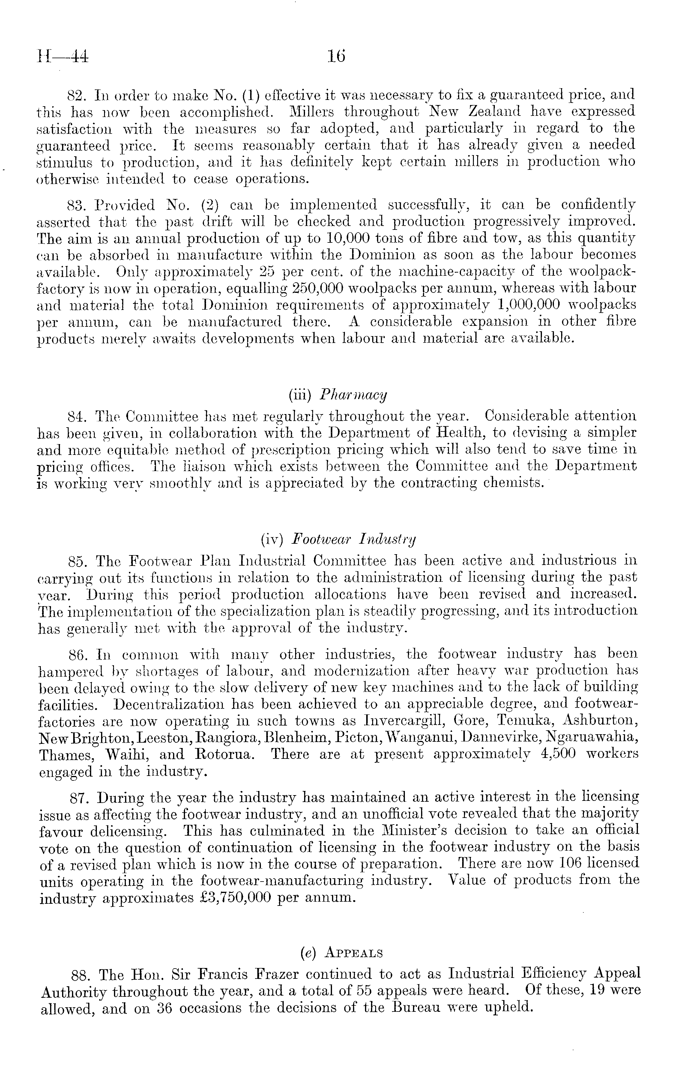 82. In order to make No. (1) effective it was necessary to fix a guaranteed price, and this has now been accomplished. Millers throughout New Zealand have expressed satisfaction with the measures so far adopted, and particularly in regard to the guaranteed price. It seems reasonably certain that it has already given a needed stimulus to production, and it has definitely kept certain millers in production who otherwise intended to cease operations. 83. Provided No. (2) can be implemented successfully, it can be confidently asserted that the past drift will be checked and production progressively improved. The aim is an annual production of up to 10,000 tons of fibre and tow, as this quantity can be absorbed in manufacture within the Dominion as soon as the labour becomes available. Only approximately 25 per cent, of the machine-capacity of the woolpackfactory is now in operation, equalling 250,000 woolpacks per annum, whereas with labour and material the total Dominion requirements of approximately 1,000,000 woolpacks per annum, can be manufactured there. A considerable expansion in other fibre products merely awaits developments when labour and material are available. (iii) Pharmacy 84. The Committee has met regularly throughout the year. Considerable attention has been given, in collaboration with the Department of Health, to devising a simpler and more equitable method of prescription pricing which will also tend to save time in pricing offices. The liaison which exists between the Committee and the Department is working very smoothly and is appreciated by the contracting chemists. (iv) Footwear Industry 85. The Footwear Plan Industrial Committee has been active and industrious in carrying out its functions in relation to the administration of licensing during the past year. During this period production allocations have been revised and increased. The implementation of the specialization plan is steadily progressing, and its introduction has generally met with the approval of the industry. 86. In common with many other industries, the footwear industry has been hampered by shortages of labour, and modernization after heavy war production has been delayed owing to the slow delivery of new key machines and to the lack of building facilities. Decentralization has been achieved to an appreciable degree, and footwearfactories are now operating in such towns as Invercargill, Gore, Temuka, Ashburton, New Brighton, Leeston, Rangiora, Blenheim, Picton, Wanganui, Dannevirke, Ngaruawahia, Thames, Waihi, and Rotorua. There are at present approximately 4,500 workers engaged in the industry. 87. During the year the industry has maintained an active interest in the licensing issue as affecting the footwear industry, and an unofficial vote revealed that the majority favour delicensing. This has culminated in the Minister's decision to take an official vote on the question of continuation of licensing in the footwear industry on the basis of a revised plan which is now in the course of preparation. There are now 106 licensed units operating in the footwear-manufacturing industry. Value of products from the industry approximates £3,750,000 per annum. (e) Appeals 88. The Hon. Sir Francis Frazer continued to act as Industrial Efficiency Appeal Authority throughout the year, and a total of 55 appeals were heard. Of these, 19 were allowed, and on 36 occasions the decisions of the Bureau were upheld.