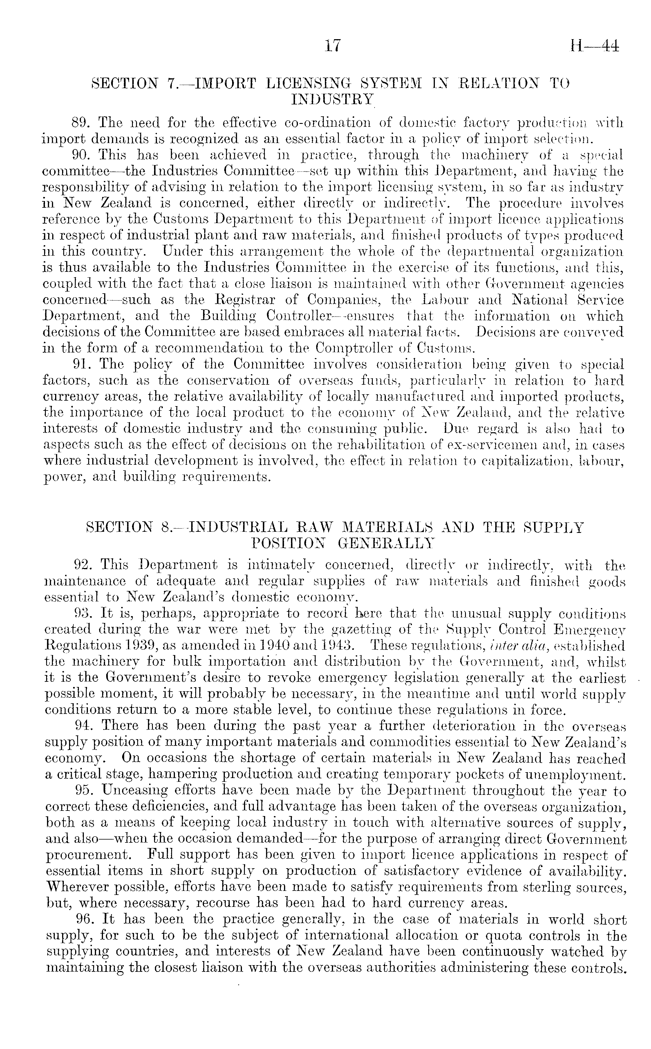 SECTION 7.—IMPORT LICENSING SYSTEM IN RELATION TO INDUSTRY 89. The need for the effective co-ordination of domestic factory production with import demands is recognized as an essential factor in a policy of import selection. 90. This has been achieved in practice, through the machinery of a special committee —the Industries Committee —set up within this Department, and having the responsibility of advising in relation to the import licensing system, in so far as industry in New Zealand is concerned, either directly or indirectly. The procedure involves reference by the Customs Department to this Department of import licence applications in respect of industrial plant and raw materials, and finished products of types produced in this country. Under this arrangement the whole of the departmental organization is thus available to the Industries Committee in the exercise of its functions, and this, coupled with the fact that a close liaison is maintained with other Government agencies concerned —such as the Registrar of Companies, the Labour and National Service Department, and the Building Controller —ensures that the information on which decisions of the Committee are based embraces all material facts. Decisions are conveyed in the form of a recommendation to the Comptroller of Customs. 91. The policy of the Committee involves consideration being given to special factors, such as the conservation of overseas funds, particularly in relation to hard currency areas, the relative availability of locally manufactured and imported products, the importance of the local product to the economy of New Zealand, and the relative interests of domestic industry and the consuming public. Due regard is also had to aspects such as the effect of decisions on the rehabilitation of ex-servicemen and, in cases where industrial development is involved, the effect in relation to capitalization, labour, power, and building requirements. SECTION B.—INDUSTRIAL RAW MATERIALS AND THE SUPPLY POSITION GENERALLY 92. This Department is intimately concerned, directly or indirectly, with the maintenance of adequate and regular supplies of raw materials and finished goods essential to New Zealand's domestic economy. 93. It is, perhaps, appropriate to record here that the unusual supply conditions created during the war were met by the gazetting of the Supply Control Emergency Regulations 1939, as amended in 1940 and 1943. These regulations, inter alia, established the machinery for bulk importation and distribution by the Government, and, whilst it is the Government's desire to revoke emergency legislation generally at the earliest possible moment, it will probably be necessary, in the meantime and until world supply conditions return to a more stable level, to continue these regulations in force. 94. There has been during the past year a further deterioration in the overseas supply position of many important materials and commodities essential to New Zealand's economy. On occasions the shortage of certain materials in New Zealand has reached a critical stage, hampering production and creating temporary pockets of unemployment. 95. Unceasing efforts have been made by the Department throughout the year to correct these deficiencies, and full advantage has been taken of the overseas organization, both as a means of keeping local industry in touch with alternative sources of supply, and also—when the occasion demanded —for the purpose of arranging direct Government procurement. Full support has been given to import licence applications in respect of essential items in short supply on production of satisfactory evidence of availability. Wherever possible, efforts have been made to satisfy requirements from sterling sources, but, where necessary, recourse has been had to hard currency areas. 96. It has been the practice generally, in the case of materials in world short supply, for such to be the subject of international allocation or quota controls in the supplying countries, and interests of New Zealand have been continuously watched by maintaining the closest liaison with the overseas authorities administering these controls.