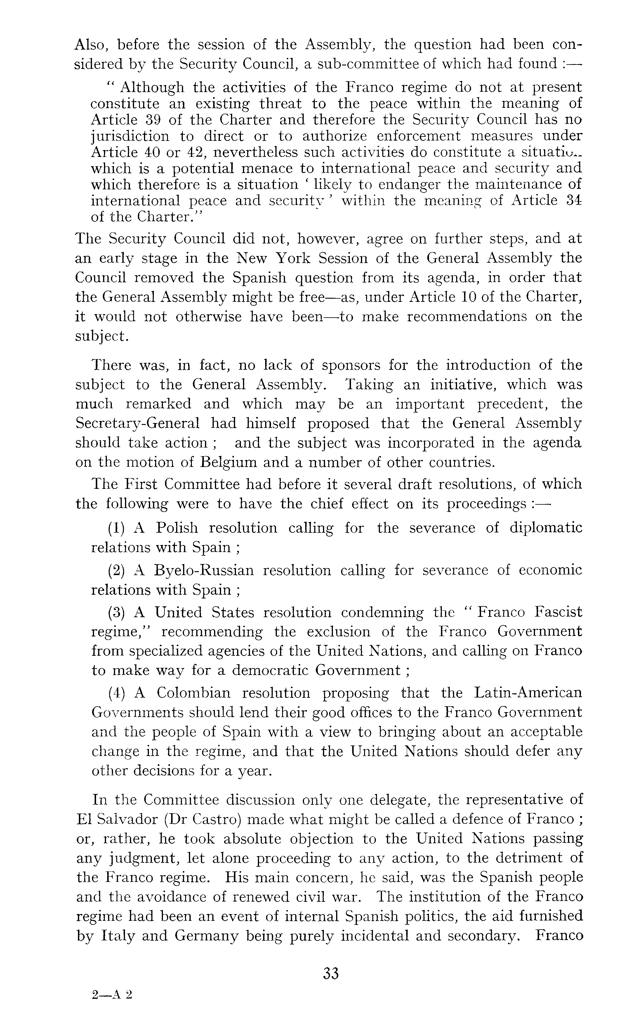Also, before the session of the Assembly, the question had been considered by the Security Council, a sub-committee of which had found " Although the activities of the Franco regime do not at present constitute an existing threat to the peace within the meaning of Article 39 of the Charter and therefore the Security Council has no jurisdiction to direct or to authorize enforcement measures under Article 40 or 42, nevertheless such activities do constitute a situatiuwhich is a potential menace to international peace and security and which therefore is a situation ' likely to endanger the maintenance of international peace and security' within the meaning of Article 34 of the Charter." The Security Council did not, however, agree on further steps, and at an early stage in the New York Session of the General Assembly the Council removed the Spanish question from its agenda, in order that the General Assembly might be free—as, under Article 10 of the Charter, it would not otherwise have been—to make recommendations on the subject. There was, in fact, no lack of sponsors for the introduction of the subject to the General Assembly. Taking an initiative, which was much remarked and which may be an important precedent, the Secretary-General had himself proposed that the General Assembly should take action ; and the subject was incorporated in the agenda on the motion of Belgium and a number of other countries. The First Committee had before it several draft resolutions, .of which the following were to have the chief effect on its proceedings : (1) A Polish resolution calling for the severance of diplomatic relations with Spain ; (2) A Byelo-Russian resolution calling for severance of economic relations with Spain ; (3) A United States resolution condemning the " Franco Fascist regime," recommending the exclusion of the Franco Government from specialized agencies of the United Nations, and calling on Franco to make way for a democratic Government; (4) A Colombian resolution proposing that the Latin-American Governments should lend their good offices to the Franco Government and the people of Spain with a view to bringing about an acceptable change in the regime, and that the United Nations should defer any other decisions for a year. In the Committee discussion only one delegate, the representative of El Salvador (Dr Castro) made what might be called a defence of Franco ; or, rather, he took absolute objection to the United Nations passing any judgment, let alone proceeding to any action, to the detriment of the Franco regime. His main concern, he said, was the Spanish people and the avoidance of renewed civil war. The institution of the Franco regime had been an event of internal Spanish politics, the aid furnished by Italy and Germany being purely incidental and secondary. Franco
