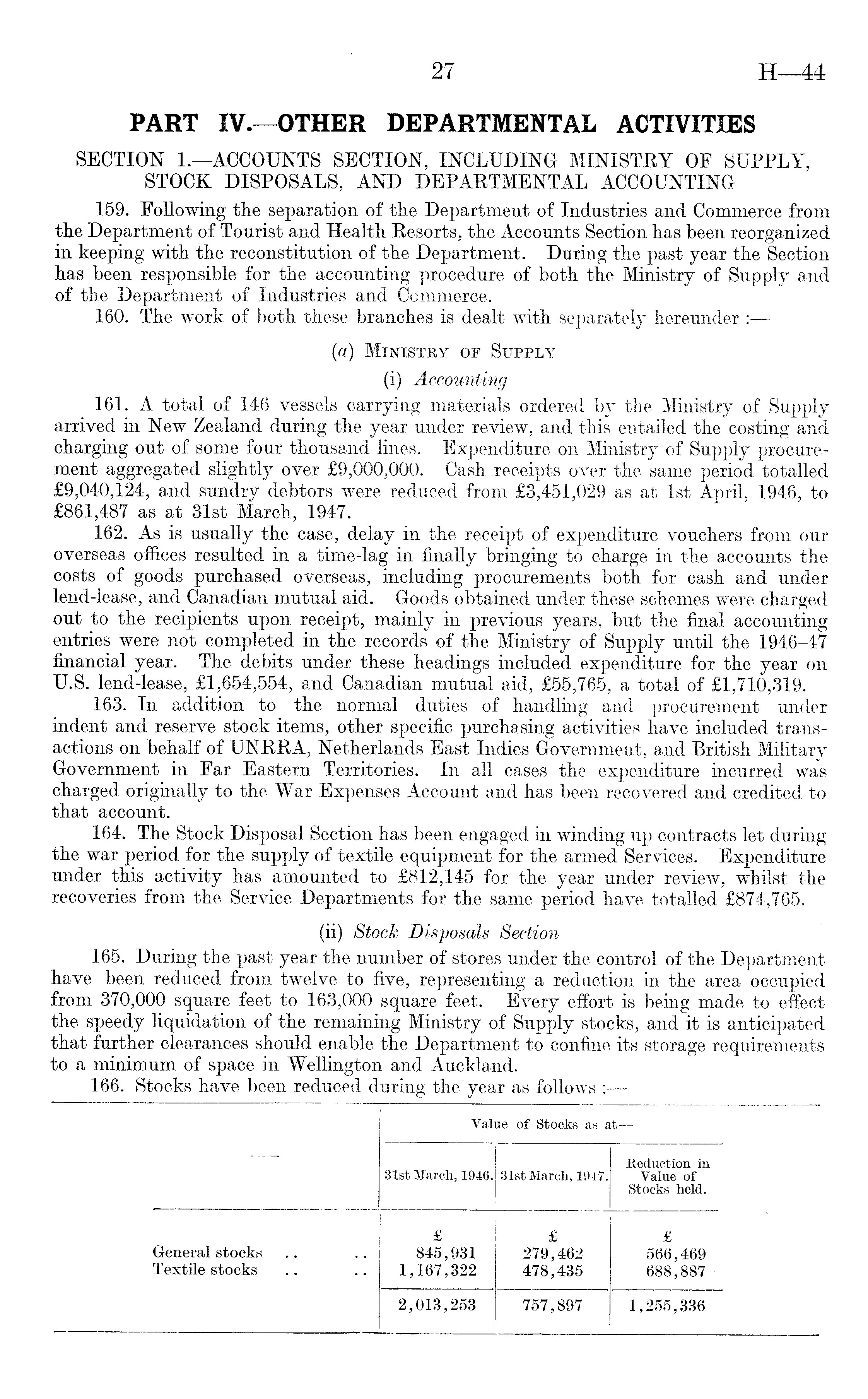 PART IV.—OTHER DEPARTMENTAL ACTIVITIES SECTION I.—ACCOUNTS SECTION, INCLUDING MINISTRY OF SUPPLY, STOCK DISPOSALS, AND DEPARTMENTAL ACCOUNTING 159. Following the separation of tlie Department of Industries and Commerce from the Department of Tourist and Health Resorts, the Accounts Section has been reorganized in keeping with the reconstitution of the Department. During the past year the Section has been responsible for the accounting procedure of both the Ministry of Supply and of the Department of Industries and Commerce. 160. The work of both these branches is dealt with separately hereunder (a) Ministry of Supply (i) Accounting 161. A total of 146 vessels carrying materials ordered by the Ministry of Supply arrived in New Zealand during the year under review, and this entailed the costing and charging out of some four thousand lines. Expenditure on Ministry of Supply procurement aggregated slightly over £9,000,000. Cash receipts over the same period totalled £9,040,124, and sundry debtors were reduced from £3,451,029 as at Ist April, 1946, to £861,487 as at 31st March, 1947. 162. As is usually the case, delay in the receipt of expenditure vouchers from our overseas offices resulted in a time-lag in finally bringing to charge in the accounts the costs of goods purchased overseas, including procurements both for cash and under lend-lease, and Canadian mutual aid. Goods obtained under these schemes were charged out to the recipients upon receipt, mainly in previous years, but the final accounting entries were not completed in the records of the Ministry of Supply until the 1946-47 financial year. The debits under these headings included expenditure for the year on U.S. Lend-lease, £1,654,554, and Canadian mutual aid, £55,765, a total of £1,710,319. 163. In addition to the normal duties of handling and procurement under indent and reserve stock items, other specific purchasing activities have included transactions on behalf of UNRRA, Netherlands East Indies Government, and British Military Government in Far Eastern Territories. In all cases the expenditure incurred was charged originally to the War Expenses Account and has been recovered and credited to that account. 164. The Stock Disposal Section has been engaged in winding up contracts let during the war period for the supply of textile equipment for the armed Services. Expenditure under this activity has amounted to £812,145 for the year under review, whilst the recoveries from the Service Departments for the same period have totalled £874,765. (ii) Stock Disposals Section 165. During the past year the number of stores under the control of the Department have been reduced from twelve to five, representing a reduction in the area occupied from 370,000 square feet to 163,000 square feet. Every effort is being made to effect the speedy liquidation of the remaining Ministry of Supply stocks, and it is anticipated that further clearances should enable the Department to confine its storage requirements to a minimum of space in Wellington and Auckland. 166. Stocks have been reduced during the'year as follows :