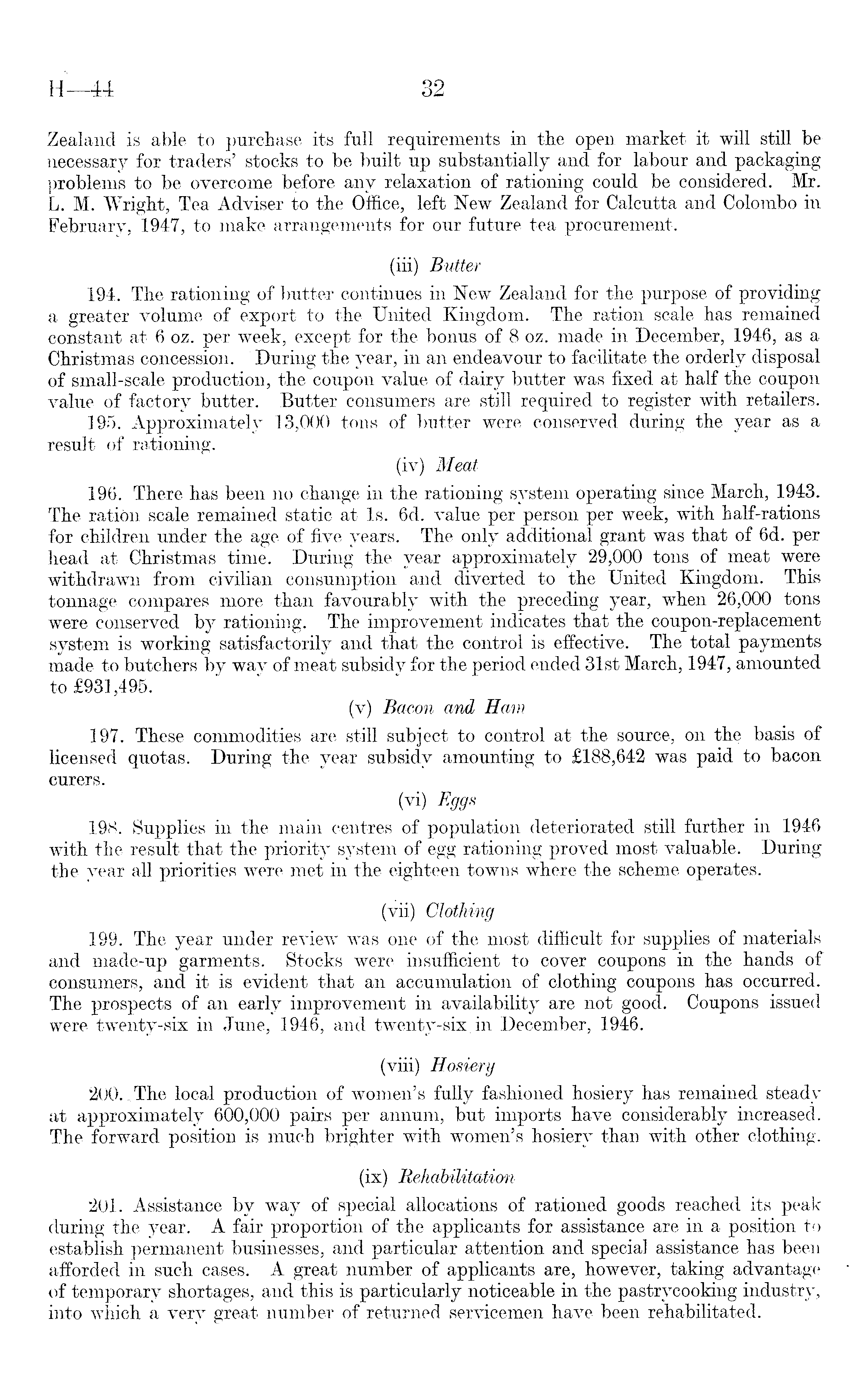 Zealand is able to purchase its full requirements in the open market it will still be necessary for traders' stocks to be built up substantially and for labour and packaging problems to be overcome before any relaxation of rationing could be considered. Mr. L. M. Wright, Tea Adviser to the Office, left New Zealand for Calcutta and Colombo in February, 1947, to make arrangements for our future tea procurement. (iii) Butter 194. The rationing of butter continues in New Zealand for the purpose of providing a greater volume of export to the United Kingdom. The ration scale has remained constant at 6 oz. per week, except for the bonus of 8 oz. made in December, 1946, as a Christmas concession. ' During the year, in an endeavour to facilitate the orderly disposal of small-scale production, the coupon value of dairy butter was fixed at half the coupon value of factory butter. Butter consumers are still required to register with retailers. 195. Approximately 13,000 tons of butter were conserved during the year as a result of rationing. (iv) Meat 196. There has been no change in the rationing system operating since March, 1943. The ration scale remained static at Is. 6d. value per person per week, with half-rations for children under the age of five years. The only additional grant was that of 6d. per head at Christmas time. During the year approximately 29,000 tons of meat were withdrawn from civilian consumption and diverted to the United Kingdom. This tonnage compares more than favourably with the preceding year, when 26,000 tons were conserved by rationing. The improvement indicates that the coupon-replacement system is working satisfactorily and that the control is effective. The total payments made to butchers by way of meat subsidy for the period ended 31st March, 1947, amounted to £931,495. (v) Bacon and Ham 197. These commodities are still subject to control at the source, on the basis of licensed quotas. During the year subsidy amounting to £188,642 was paid to bacon curers. (vi) Eggs 198. Supplies in the main centres of population deteriorated still further in 1946 with the result that the priority system of egg rationing proved most valuable. During the year all priorities were met in the eighteen towns where the scheme operates. (vii) Clothing 199. The year under review was one of the most difficult for supplies of materials and made-up garments. Stocks were insufficient to cover coupons in the hands of consumers, and it is evident that an accumulation of clothing coupons has occurred. The prospects of an early improvement in availability are not good. Coupons issued were twenty-six in June, 1946, and twenty-six in December, 1946. (viii) Hosiery 200. .The local production of women's fully fashioned hosiery has remained steady at approximately 600,000 pairs per annum, but imports have considerably increased. The forward position is much brighter with women's hosiery than with other clothing. (ix) Rehabilitation 201. Assistance by way of special allocations of rationed goods reached its peak during the year. A fair proportion of the applicants for assistance are in a position to establish permanent businesses, and particular attention and special assistance has been afforded in such cases. A great number of applicants are, however, taking advantage of temporary shortages, and this is particularly noticeable in the pastrycooking industry, into which a very great number of returned servicemen have been rehabilitated.