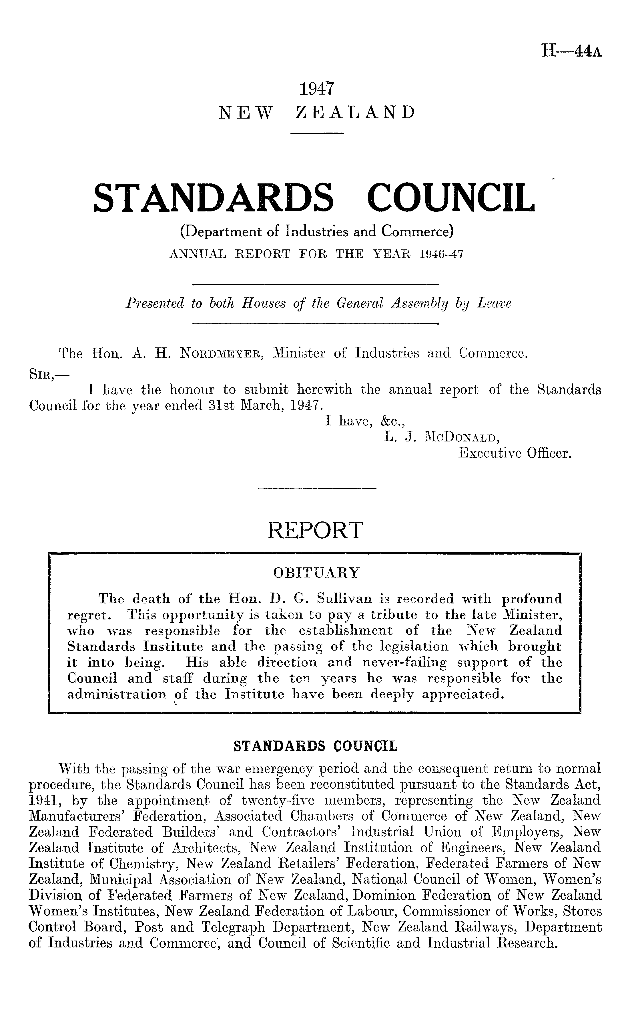 The Hon. A. H. Nordmeyer, Minister of Industries and Commerce. Sir, — I have the honour to submit herewith the annual report of the Standards Council for the year ended 31st March, 1947. I have, &c., L. J. McDonald, Executive Officer.