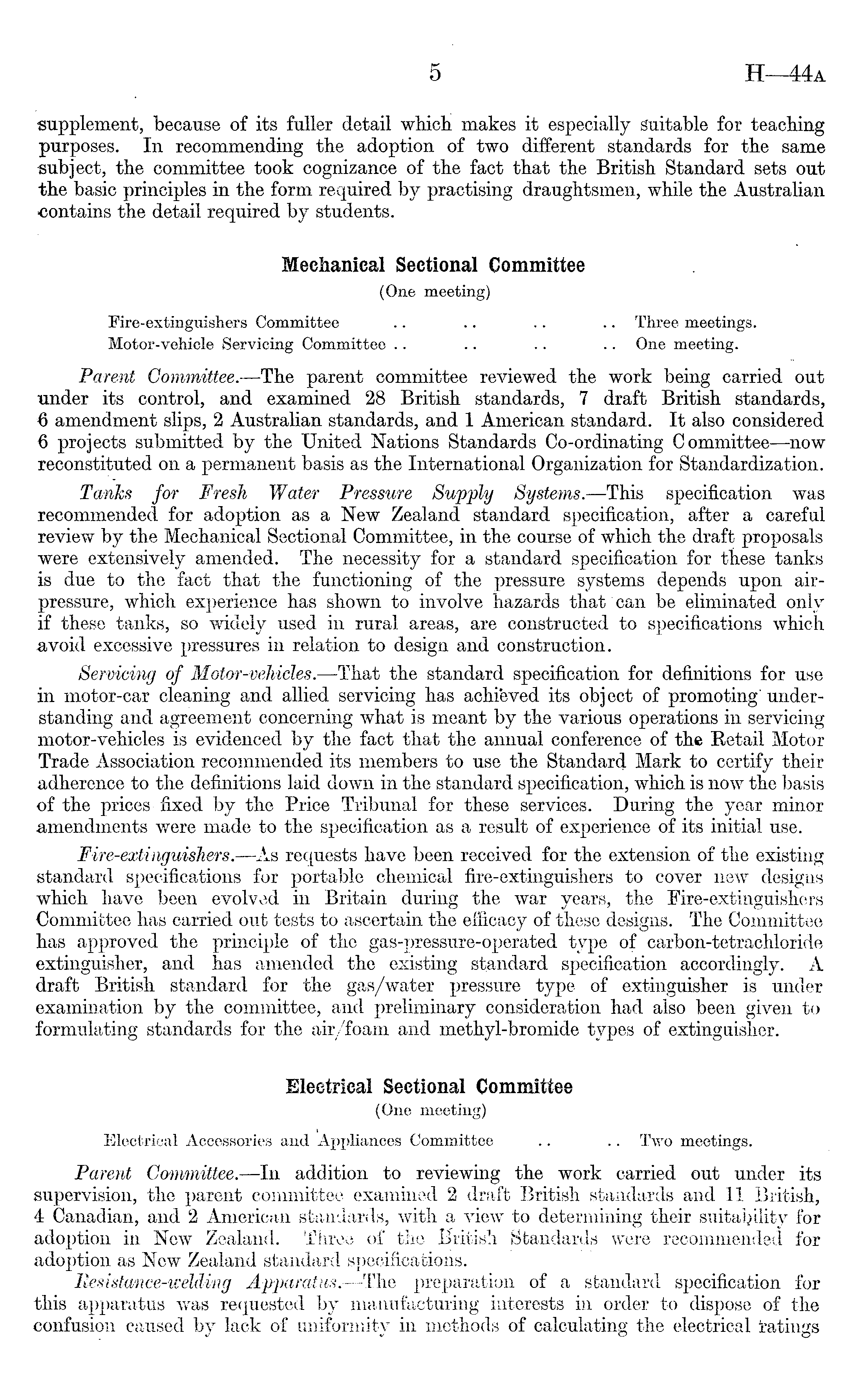 supplement, because of its fuller detail which makes it especially Suitable for teaching purposes. In recommending the adoption of two different standards for the same subject, the committee took cognizance of the fact that the British Standard sets out the basic principles in the form required by practising draughtsmen, while the Australian ■contains the detail required by students. Mechanical Sectional Committee (One meeting) Fire-extinguishers Committee .. .. .. .. Three meetings. Motor-vehicle Servicing Committee .. .. .. .. One meeting. Parent Committee. —The parent committee reviewed the work being carried out under its control, and examined 28 British standards, 7 draft British standards, 6 amendment slips, 2 Australian standards, and 1 American standard. It also considered 6 projects submitted by the United Nations Standards Co-ordinating Committee —now reconstituted on a permanent basis as the International Organization for Standardization. Tanks for Fresh Water Pressure Supply Systems. —This specification was recommended for adoption as a New Zealand standard specification, after a careful review by the Mechanical Sectional Committee, in the course of which the draft proposals were extensively amended. The necessity for a standard specification for these tanks is due to the fact that the functioning of the pressure systems depends upon airpressure, which experience has shown to involve hazards that can be eliminated only if these tanks, so widely used in rural areas, are constructed to specifications which avoid excessive pressures in relation to design and construction. Servicing of Motor-vehicles. —That the standard specification for definitions for use in motor-car cleaning and allied servicing has achieved its object of promoting' understanding and agreement concerning what is meant by the various operations in servicing motor-vehicles is evidenced by the fact that the annual conference of the Retail Motor Trade Association recommended its members to use the Standard Mark to certify their adherence to the definitions laid down in the standard specification, which is now the basis of the prices fixed by the Price Tribunal for these services. During the year minor amendments were made to the specification as a result of experience of its initial use. Fire-extinguishers.—As requests have been received for the extension of the existing standard specifications for portable chemical fire-extinguishers to cover new designs which have been evolved in Britain during the war years, the Fire-extinguishers Committee has carried out tests to ascertain the efficacy of these designs. The Committee has approved the principle of the gas-pressure-operated type of carbon-tetrachloride extinguisher, and has amended the existing standard specification accordingly. A draft British standard for the gas/water pressure type of extinguisher is under examination by the committee, and preliminary consideration had also been given to formulating standards for the air/foam and methyl-bromide types of extinguisher. Electrical Sectional Committee (One meeting) Electrical Accessories and Appliances Committee .. .. Two meetings. Parent Committee. —In addition to reviewing the work carried out under its supervision, the parent committee examined 2 draft British standards and 11 British, 4 Canadian, and 2 American standards, with a view to determining their suitability for adoption in New Zealand. Three of the British Standards were recommended for adoption as New Zealand standard specifications. Resistance-welding Apparatus. —The preparation of a standard specification for this apparatus was requested by manufacturing interests in order to dispose of the confusion caused by lack of uniformity in methods of calculating the electrical "ratings