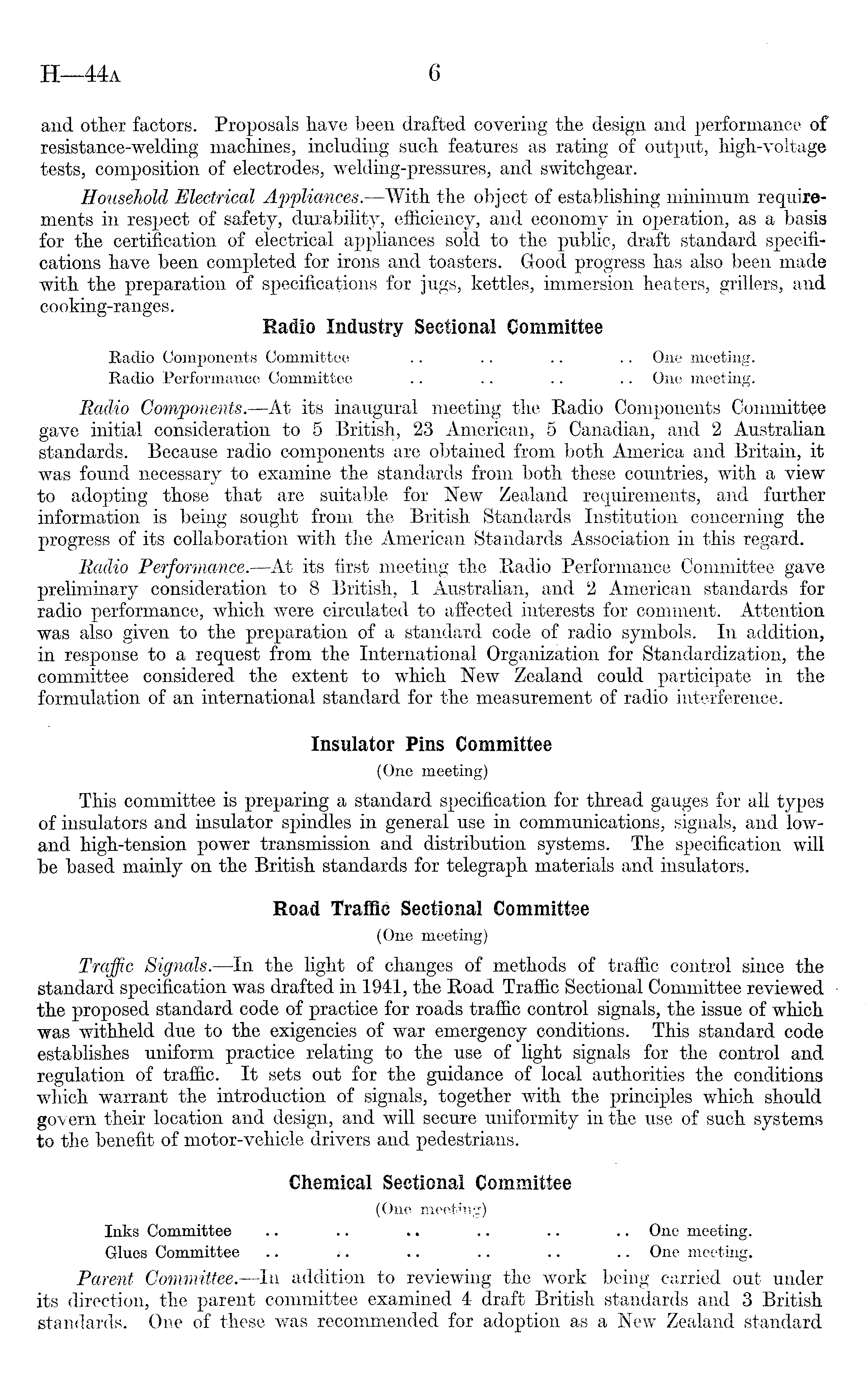 and other factors. Proposals have been drafted covering the design and performance of resistance-welding machines, including such features as rating of output, high-voltage tests, composition of electrodes, welding-pressures, and switchgear. Household Electrical Appliances.—With the object of establishing minimum requirements in respect of safety, durability, efficiency, and economy in operation, as a basis for the certification of electrical appliances sold to the public, draft standard specifications have been completed for irons and toasters. Good progress has also been made with the preparation of specifications for jugs, kettles, immersion heaters, grillers, and cooking-ranges. Radio Industry Sectional Committee Radio Components Committee .. .. .. .. One meeting. Radio Performance Committee .. .. .. .. One meeting. Radio Components.—At its inaugural meeting the Radio Components Committee gave initial consideration to 5 British, 23 American, 5 Canadian, and 2 Australian standards. Because radio components are obtained from both America and Britain, it was found necessary to examine the standards from both these countries, with a view to adopting those that are suitable for New- Zealand requirements, and further information is being sought from the British Standards Institution concerning the progress of its collaboration with the American Standards Association in this regard. Radio Performance. —At its first meeting the Radio Performance Committee gave preliminary consideration to 8 British, 1 Australian, and 2 American standards for radio performance, which were circulated to affected interests for comment. Attention was also given to the preparation of a standard code of radio symbols. In addition, in response to a request from the International Organization for Standardization, the committee considered the extent to which New Zealand could participate in the formulation of an international standard for the measurement of radio interference. Insulator Pins Committee (One meeting) This committee is preparing a standard specification for thread gauges for all types of insulators and insulator spindles in general use in communications, signals, and lowand high-tension power transmission and distribution systems. The specification will be based mainly on the British standards for telegraph materials and insulators. Road Traffic Sectional Committee (One meeting) Traffic Signals.—ln the light of changes of methods of traffic control since the standard specification was drafted in 1941, the Road Traffic Sectional Committee reviewed the proposed standard code of practice for roads traffic control signals, the issue of which was withheld due to the exigencies of war emergency conditions. This standard code establishes uniform practice relating to the use of light signals for the control and regulation of traffic. It sets out for the guidance of local authorities the conditions which warrant the introduction of signals, together with the principles which should govern their location and design, and will secure uniformity in the use of such systems to the benefit of motor-vehicle drivers and pedestrians. Chemical Sectional Committee (One meeting) Inks Committee .. .. .. .. .. .. One meeting. Glues Committee .. .-. .. .. .. .. One meeting. Parent Committee. —In addition to reviewing the work being carried out under its direction, the parent committee examined 4 draft British standards and 3 British standards. One of these was recommended for adoption as a New Zealand standard