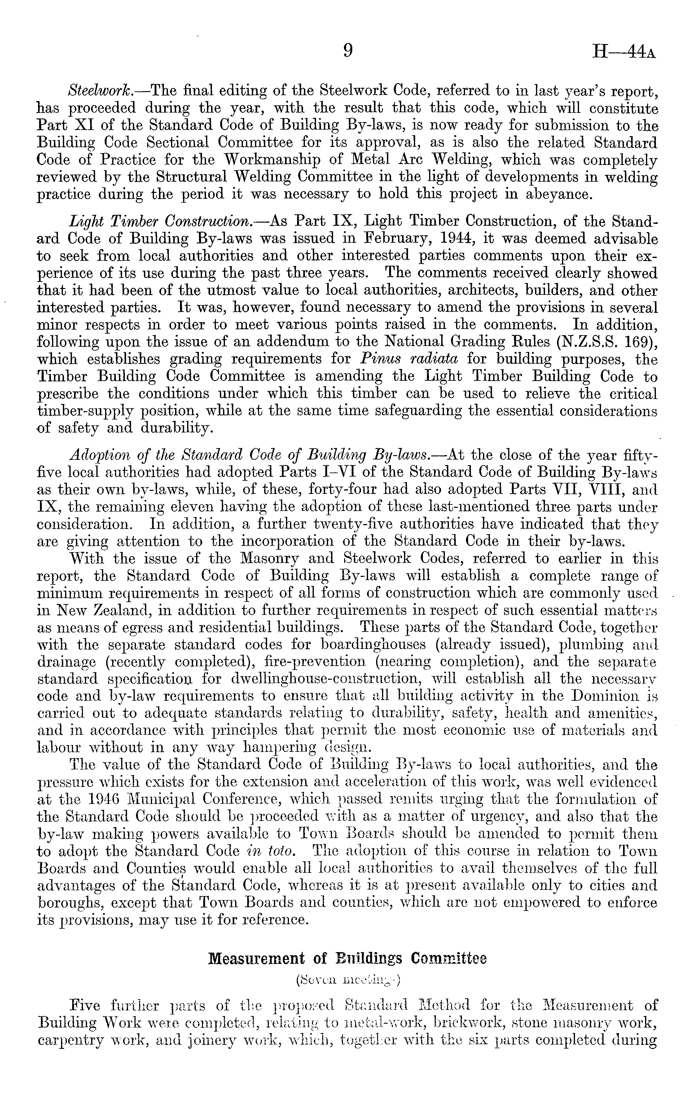 SteelworJc.—The final editing of the Steelwork Code, referred to in last year's report, has proceeded during the year, with the result that this code, which will constitute Part XI of the Standard Code of Building By-laws, is now ready for submission to the Building Code Sectional Committee for its approval, as is also the related Standard Code of Practice for the Workmanship of Metal Arc Welding, which was completely reviewed by the Structural Welding Committee in the light of developments in welding practice during the period it was necessary to hold this project in abeyance. Light Timber Construction. —As Part IX, Light Timber Construction, of the Standard Code of Building By-laws was issued in February, 1944, it was deemed advisable to seek from local authorities and other interested parties comments upon their experience of its use during the past three years. The comments received clearly showed that it had been of the utmost value to local authorities, architects, builders, and other interested parties. It was, however, found necessary to amend the provisions in several minor respects in order to meet various points raised in the comments. In addition, following upon the issue of an addendum to the National Grading Rules (N.Z.S.S. 169), which establishes grading requirements for Pinus radiata for building purposes, the Timber Building Code Committee is amending the Light Timber Building Code to prescribe the conditions under which this timber can be used to relieve the critical timber-supply position, while at the same time safeguarding the essential considerations of safety and durability. Adoption of the Standard Code of Building By-laws. —At the close of the year fiftyfive local authorities had adopted Parts I-YI of the Standard Code of Building By-laws as their own by-laws, while, of these, forty-four had also adopted Parts VII, VIII, and IX, the remaining eleven having the adoption of these last-mentioned three parts under consideration. In addition, a further twenty-five authorities have indicated that they are giving attention to the incorporation of the Standard Code in their by-laws. With the issue of the Masonry and Steelwork Codes, referred to earlier in this report, the Standard Code of Building By-laws will establish a complete range of minimum requirements in respect of all forms of construction which are commonly used in New Zealand, in addition to further requirements in respect of such essential matters as means of egress and residential buildings. These parts of the Standard Code, together with the separate standard codes for boardinghouses (already issued), plumbing and drainage (recently completed), fire-prevention (nearing completion), and the separate standard specification for dwellinghouse-construction, will establish all the necessary code and by-law requirements to ensure that all building activity in the Dominion is carried out to adequate standards relating to durability, safety, health and amenities, and in accordance with principles that permit the most economic use of materials and labour without in any way hampering design. The value of the Standard Code of Building By-laws to local authorities, and the pressure which exists for the extension and acceleration of this work, was well evidenced at the 1946 Municipal Conference, which passed remits urging that the formulation of the Standard Code should be proceeded with as a matter of urgency, and also that the by-law making powers available to Town Boards should be amended to permit them to adopt the Standard Code in toto. The adoption of this course in relation to Town and Counties would enable all local authorities to avail themselves of the full advantages of the Standard Code, whereas it is at present available only to cities and boroughs, except that Town Boards and counties, which are not empowered to enforce its provisions, may use it for reference. Measurement of Buildings Committee (Seven meetings) Five further parts of the proposed Standard Method for the Measurement of Building Work were completed, relating to metal-work, brickwork, stone masonry work, carpentry work, and joinery work, which, together with the six parts completed during