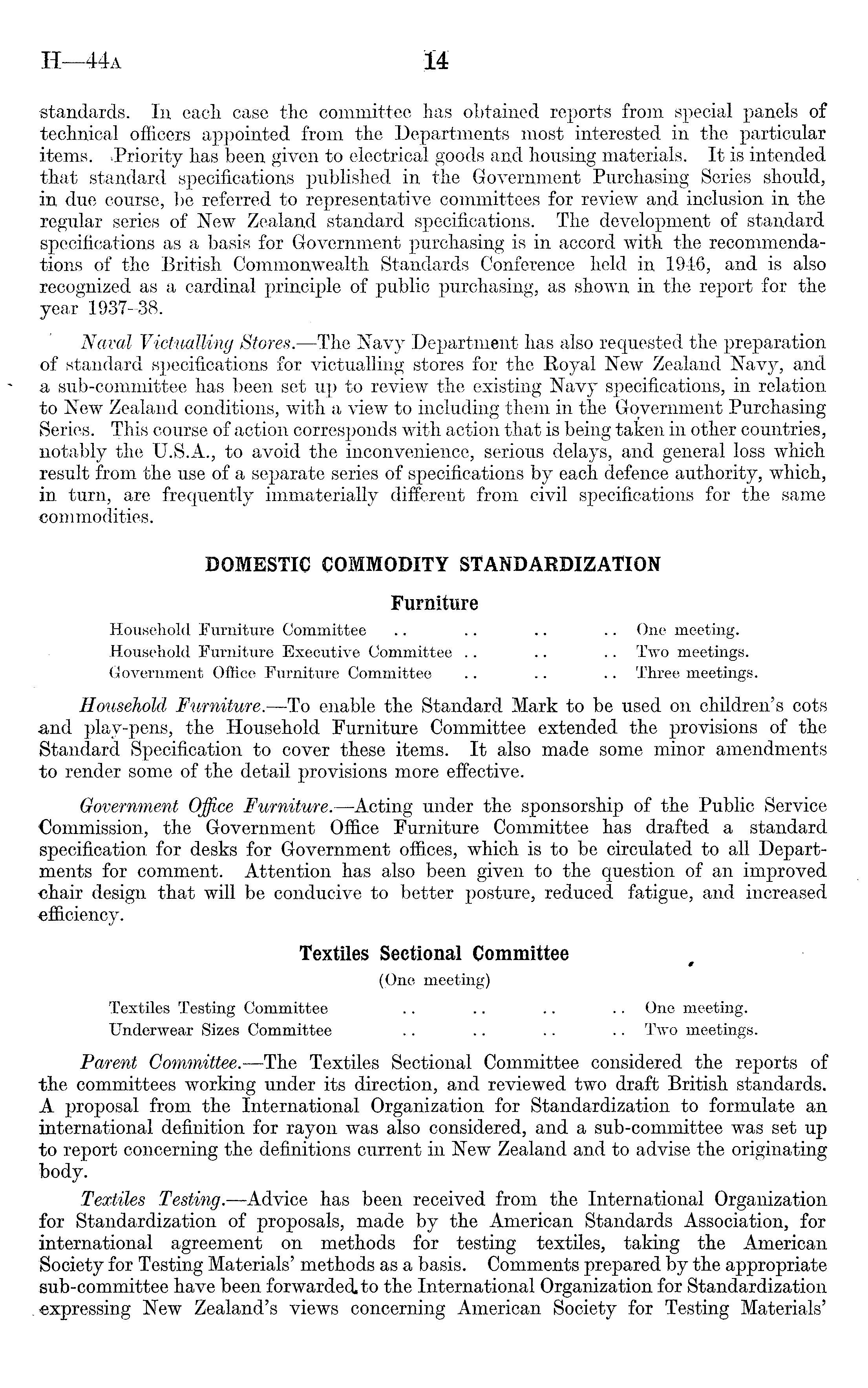 standards. In each case the committee has obtained reports from special panels of technical officers appointed from the Departments most interested in the particular items. .Priority has been given to electrical goods and housing materials. It is intended that standard specifications published in the Government Purchasing Series should, in due course, be referred to representative committees for review and inclusion in the regular series of New Zealand standard specifications. The development of standard specifications as a basis for Government purchasing is in accord with the recommendations of the British Commonwealth Standards Conference held in 1946, and is also recognized as a cardinal principle of public purchasing, as shown in the report for the year 1937-38. Naval Victualling Stores. —The Navy Department has also requested the preparation •of standard specifications for victualling stores for the Royal New Zealand Navy, and a sub-committee has been set up to review the existing Navy specifications, in relation to New Zealand conditions, with a view to including them in the Government Purchasing Series. This course of action corresponds with action that is being taken in other countries, notably the U.S.A., to avoid the inconvenience, serious delays, and general loss which result from the use of a separate series of specifications by each defence authority, which, in turn, are frequently immaterially different from civil specifications for the same commodities. DOMESTIC COMMODITY STANDARDIZATION Furniture Household Furniture Committee .. .. .. .. One meeting. Household Furniture Executive Committee .. .. .. Two meetings. Government Office Furniture Committee .. .. .. Three meetings. Household Furniture. —To enable the Standard Mark to be used on children's cots and play-pens, the Household Furniture Committee extended the provisions of the Standard Specification to cover these items. It also made some minor amendments to render some of the detail provisions more effective. Government Office Furniture. —Acting under the sponsorship of the Public Service Commission, the Government Office Furniture Committee has drafted a standard specification for desks for Government offices, which is to be circulated to all Departments for comment. Attention has also been given to the question of an improved chair design that will be conducive to better posture, reduced fatigue, and increased efficiency. Textiles Sectional Committee (One meeting) Textiles Testing Committee .. .. .. .. One meeting. Underwear Sizes Committee .. .. .. .. Two meetings. Parent Committee.—The Textiles Sectional Committee considered the reports of the committees working under its direction, and reviewed two draft British standards. A proposal from the International Organization for Standardization to formulate an international definition for rayon was also considered, and a sub-committee was set up to report concerning the definitions current in New Zealand and to advise the originating body. Textiles Testing.—Advice has been received from the International Organization for Standardization of proposals, made by the American Standards Association, for international agreement on methods for testing textiles, taking the American Society for Testing Materials' methods as a basis. Comments prepared by the appropriate sub-committee have been forwarded, to the International Organization for Standardization expressing New Zealand's views concerning American Society for Testing Materials'