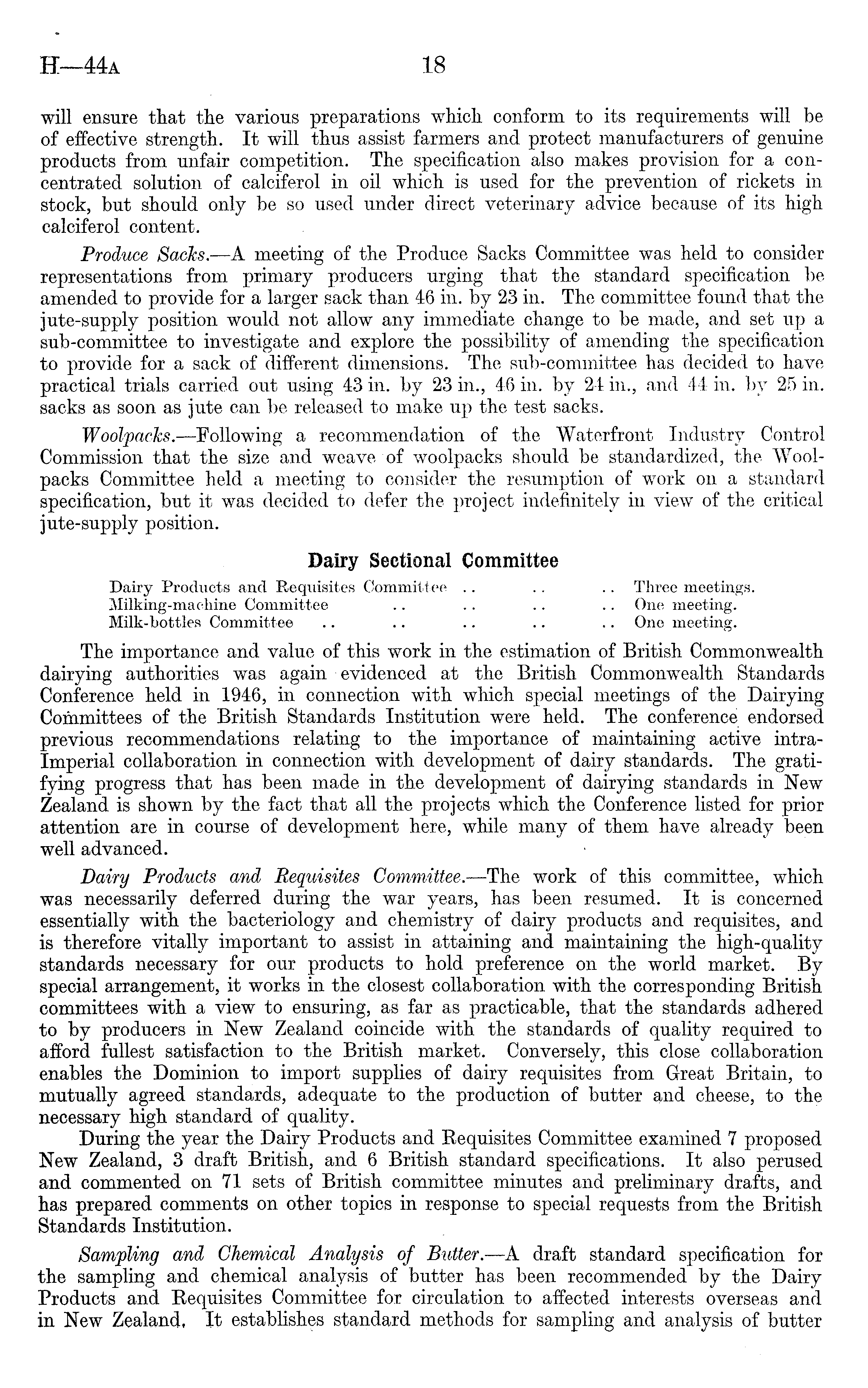 will ensure that the various preparations which conform to its requirements will be of effective strength. It will thus assist farmers and protect manufacturers of genuine products from unfair competition. The specification also makes provision for a concentrated solution of calciferol in oil which is used for the prevention of rickets in stock, but should only be so used under direct veterinary advice because of its high calciferol content. Produce Sacks. —A meeting of the Produce Sacks Committee was held to consider representations from primary producers urging that the standard specification be amended to provide for a larger sack than 46 in. by 23 in. The committee found that the jute-supply position would not allow any immediate change to be made, and set up a sub-committee to investigate and explore the possibility of amending the specification to provide for a sack of different dimensions. The sub-committee has decided to have practical trials carried out using 43 in. by 23 in., 46 in. by 24 in., and 44 in. by 25 in. sacks as soon as jute can be released to make up the test sacks. Woolsacks. —Following a recommendation of the Waterfront Industry Control Commission that the size and weave of woolpacks should be standardized, the Woolpacks Committee held a meeting to consider the resumption of work on a standard specification, but it was decided to defer the project indefinitely in view of the critical jute-supply position. Dairy Sectional Committee Dairy Products and Requisites Committee .. .. .. Three meetings. Milking-machine Committee .. .. .. .. One meeting. Milk-bottles Committee .. .. .. .. .. One meeting. The importance and value of this work in the estimation of British Commonwealth dairying authorities was again evidenced at the British Commonwealth Standards Conference held in 1946, in connection with which special meetings of the Dairying Committees of the British Standards Institution were held. The conference endorsed previous recommendations relating to the importance of maintaining active intraImperial collaboration in connection with development of dairy standards. The gratifying progress that has been made in the development of dairying standards in New Zealand is shown by the fact that all the projects which the Conference listed for prior attention are in course of development here, while many of them have already been well advanced. Dairy Products and Requisites Committee.—The work of this committee, which was necessarily deferred during the war years, has been resumed. It is concerned essentially with the bacteriology and chemistry of dairy products and requisites, and is therefore vitally important to assist in attaining and maintaining the high-quality standards necessary for our products to hold preference on the world market. By special arrangement, it works in the closest collaboration with the corresponding British committees with a view to ensuring, as far as practicable, that the standards adhered to by producers in New Zealand coincide with the standards of quality required to afford fullest satisfaction to the British market. Conversely, this close collaboration enables the Dominion to import supplies of dairy requisites from Great Britain, to mutually agreed standards, adequate to the production of butter and cheese, to the necessary high standard of quality. During the year the Dairy Products and Requisites Committee examined 7 proposed New Zealand, 3 draft British, and 6 British standard specifications. It also perused and commented on 71 sets of British committee minutes and preliminary drafts, and has prepared comments on other topics in response to special requests from the British Standards Institution. Sampling and Chemical Analysis of Butter. —A draft standard specification for the sampling and chemical analysis of butter has been recommended by the Dairy Products and Requisites Committee for circulation to affected interests overseas and in New Zealand, It establishes standard methods for sampling and analysis of butter