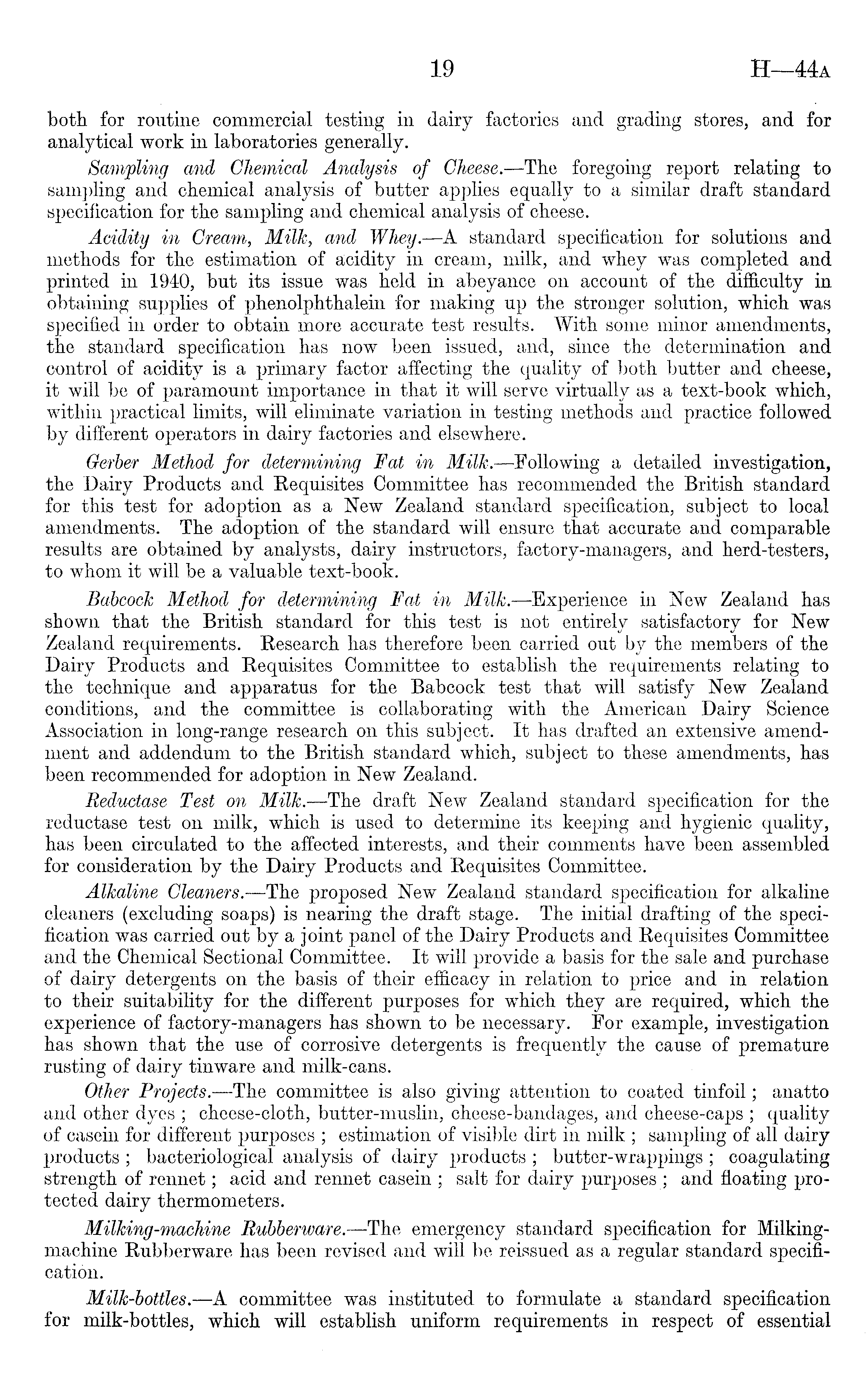 both for routine commercial testing in dairy factories and grading stores, and for analytical work in laboratories generally. Sampling and Chemical Analysis of Cheese.—The foregoing report relating to sampling and chemical analysis of butter applies equally to a similar draft standard specification for the sampling and chemical analysis of cheese. Acidity in Cream, Milk, and Whey. —A standard specification for solutions and methods for the estimation of acidity in cream, milk, and whey was completed and printed in 1940, but its issue was held in abeyance on account of the difficulty in obtaining supplies of phenolphthalein for making up the stronger solution, which was specified in order to obtain more accurate test results. With some minor amendments, the standard specification has now been issued, and, since the determination and control of acidity is a primary factor affecting the quality of both butter and cheese, it will be of paramount importance in that it will serve virtually as a text-book which, within practical limits, will eliminate variation in testing methods and practice followed by different operators in dairy factories and elsewhere. Gerber Method for determining Fat in Milk. —Following a detailed investigation, the Dairy Products and Requisites Committee has recommended the British standard for this test for adoption as a New Zealand standard specification, subject to local amendments. The adoption of the standard will ensure that accurate and comparable results are obtained by analysts, dairy instructors, factory-managers, and herd-testers, to whom it will be a valuable text-book. Babcock Method for determining Fat in Milk. —Experience in New Zealand has shown that the British standard for this test is not entirely satisfactory for New Zealand requirements. Research has therefore been carried out by the members of the Dairy Products and Requisites Committee to establish the requirements relating to the technique and apparatus for the Babcock test that will satisfy New Zealand conditions, and the committee is collaborating with the American Dairy Science Association in long-range research on this subject. It has drafted an extensive amendment and addendum to the British standard which, subject to these amendments, has been recommended for adoption in New Zealand. Reductase Test on Milk.—The draft New Zealand standard specification for the reductase test on milk, which is used to determine its keeping and hygienic quality, has been circulated to the affected interests, and their comments have been assembled for consideration by the Dairy Products and Requisites Committee. Alkaline Cleaners.—The proposed New Zealand standard specification for alkaline cleaners (excluding soaps) is nearing the draft stage. The initial drafting of the specification was carried out by a joint panel of the Dairy Products and Requisites Committee and the Chemical Sectional Committee. It will provide a basis for the sale and purchase of dairy detergents on the basis of their efficacy in relation to price and in relation to their suitability for the different purposes for which they are required, which the experience of factory-managers has shown to be necessary. For example, investigation has shown that the use of corrosive detergents is frequently the cause of premature rusting of dairy tinware and milk-cans. Other Projects.—The committee is also giving attention to coated tinfoil; anatto and other dyes ; cheese-cloth, butter-muslin, cheese-bandages, and cheese-caps ; quality of casein for different purposes ; estimation of visible dirt in milk ; sampling of all dairy products ; bacteriological analysis of dairy products ; butter-wrappings ; coagulating strength of rennet; acid and rennet casein ; salt for dairy purposes; and floating protected dairy thermometers. Milking-machine Rubberware. —The emergency standard specification for Milkingmachine Rubberware has been revised and will be reissued as a regular standard specification. Milk-bottles.—A committee was instituted to formulate a standard specification for milk-bottles, which will establish uniform requirements in respect of essential