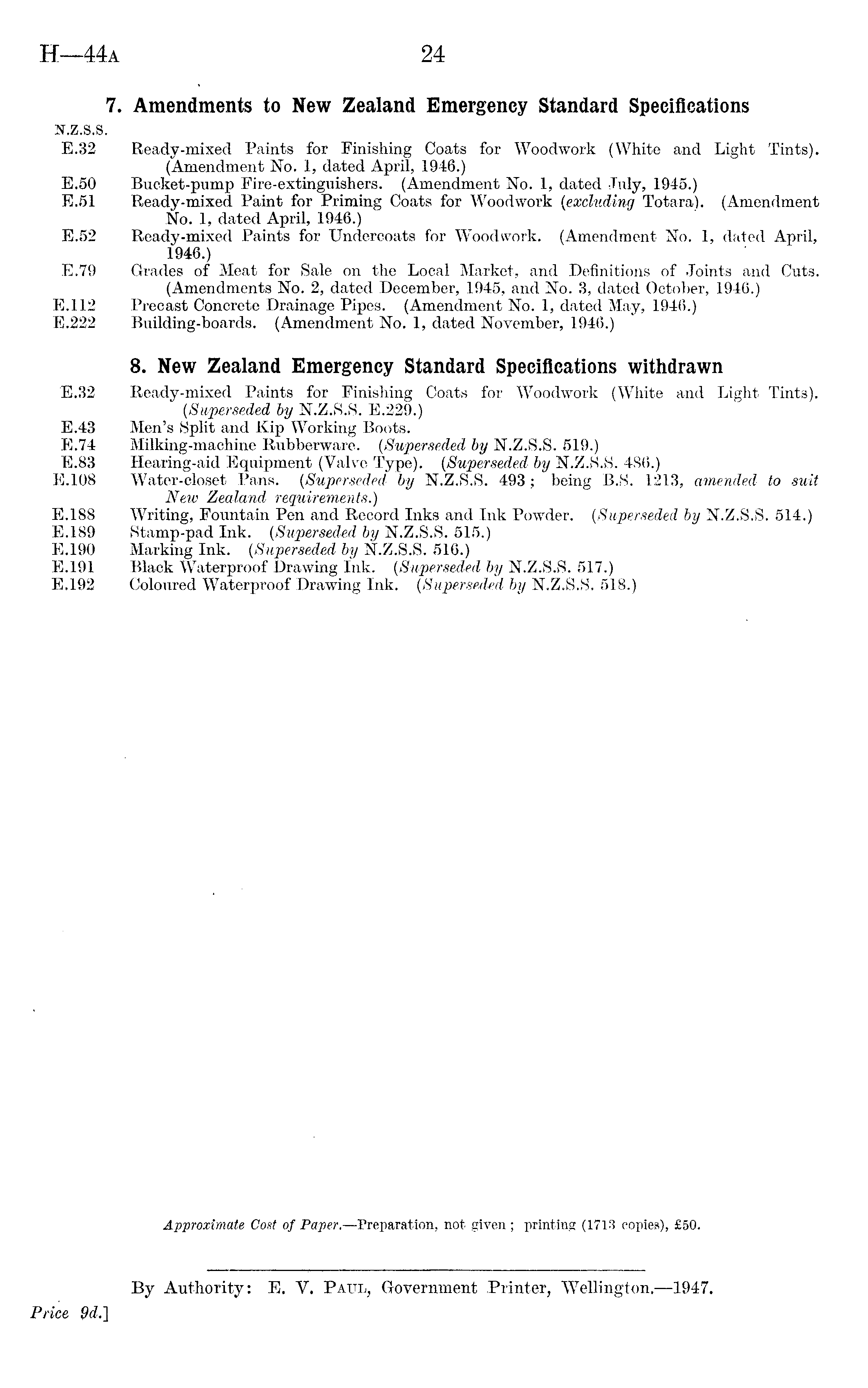 7. Amendments to New Zealand Emergency Standard Specifications N.Z.S.S. E. 32 Ready-mixed Paints for Finishing Coats for Woodwork (White and Light Tints). (Amendment No. 1, dated April, 1946.) E. 50 Bucket-pump Fire-extinguishers. (Amendment No. 1, dated July, 1945.) E. 51 Ready-mixed Paint for Priming Coats for Woodwork (excluding Totara). (Amendment No. 1, dated April, 1946.) E. 52 Ready-mixed Paints for Undercoats for Woodwork. (Amendment No. 1, dated April, 1946.) E. 79 Grades of Meat for Sale on the Local Market, and Definitions of Joints and Cuts. (Amendments No. 2, dated December, 1945, and No. 3, dated October, 1946.) E. 112 Precast Concrete Drainage Pipes. (Amendment No. 1, dated May, 1946.) E. 222 Building-boards. (Amendment No. 1, dated November, 1946.) 8. New Zealand Emergency Standard Specifications withdrawn E. 32 Ready-mixed Paints for Finishing Coats for Woodwork (White and Light Tints). {Superseded by N.Z.S.S. E. 229.) E. 43 Men's Split and Kip Working Boots. E. 74 Milking-machine Rubberware. ( Superseded by N.Z.S.S. 519.) E. 83 Hearing-aid Equipment (Valve Type). (Superseded by N.Z.S.S. 486.) E.IOB Water-closet Pans. (Superseded by N.Z.S.S. 493; being B.S. 1213, amended to suit New Zealand requirements.) E.IBB Writing, Fountain Pen and Record Inks and Ink Powder. ( Superseded by N.Z.S.S. 514.) E. 189 Stamp-pad Ink. (Superseded by N.Z.S.S. 515.) E. 190 Marking Ink. (Superseded by N.Z.S.S. 516.) E. 191 Black Waterproof Drawing Ink. (Superseded by N.Z.S.S. 517.) E. 192 Coloured Waterproof Drawing Ink. ( Superseded by N.Z.S.S. 518.)