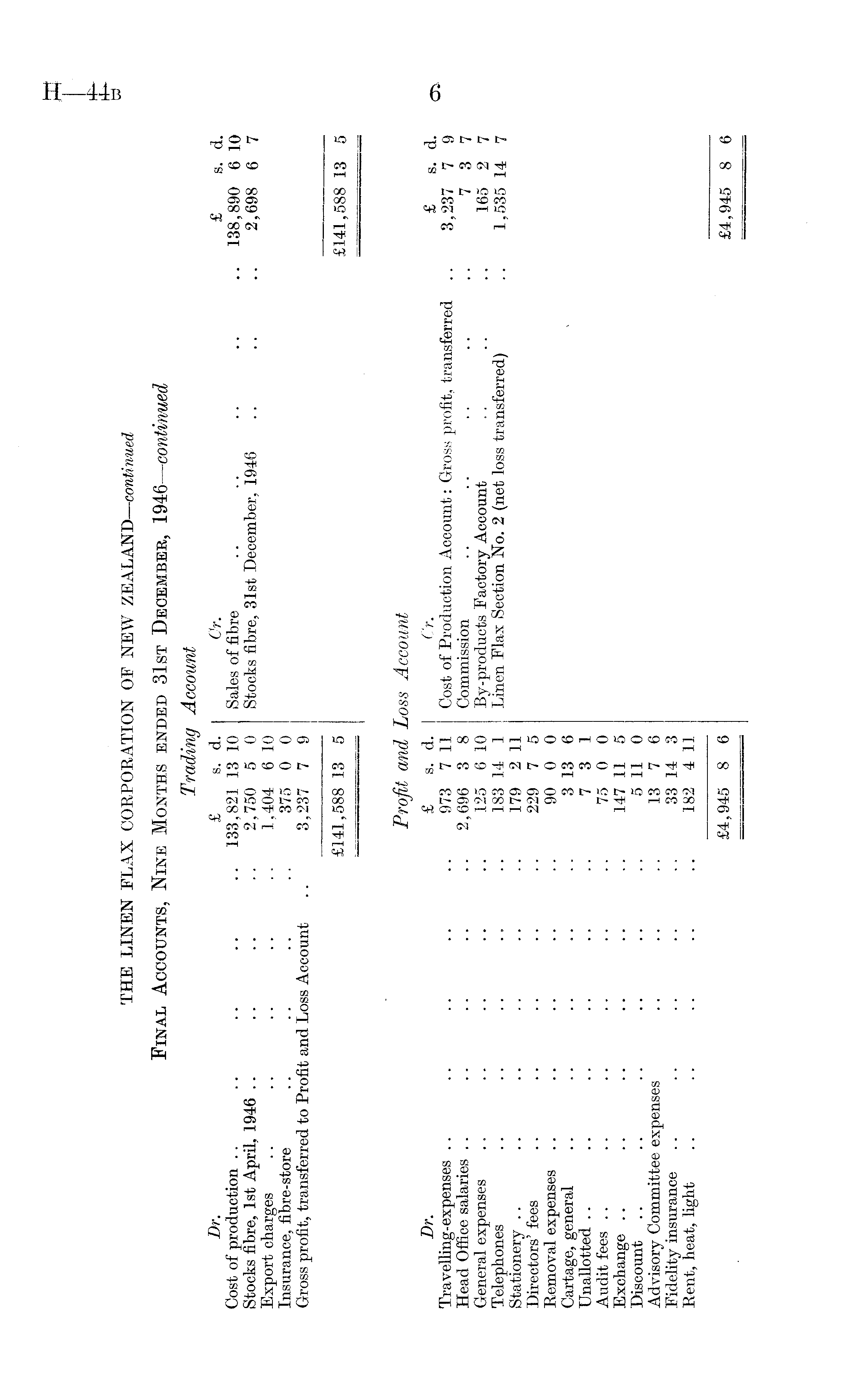 THE LINEN FLAX CORPORATION OF NEW ZEALAND— continued Final Accounts, Nine Months ended 31st December, 1946— continued Trading Account Dr. £ s. d. Cr. £ s . d. Cost of production .. .. .. .. .. 133,82113 10 Sales of fibre .. .. .. .. .. 138,890 6 10 Stocks fibre, Ist April, 1946 .. .. .. .. 2,750 5 0 Stocks fibre, 31st December, 1946 .. .. .. 2,698 6 7 Export charges .. .. .. .. . . 1,404 6 10 Insurance, fibre-store .. .. .. .. 375 0 0 Gross profit, transferred to Profit and Loss Account .. 3,237 7 9 £141,588 13 5 £141,588 13 5 Profit and Loss Account Dr. £ s. d. Cr. £ B . d. Travelling-expenses .. .. .. .. .. 973 7 11 Cost of Production Account: Gross profit, transferred .. 3,237 7 9 Head Office salaries . . .. .. .. .. 2,696 3 8 Commission .. .. .. .. .. 737 General expenses .. .. .. .. .. 125 6 10 By-products Factory Account .. .. .. 165 2 7 Telephones .. .. .. .. .. 183 14 1 Linen Flax Section No. 2 (net loss transferred) .. 1,535 14 7 Stationery .. .. .. .. .. .. 179 2 11 Directors' fees .. .. .. .. .. 229 7 5 Removal expenses .. .. .. .. .. 90 0 0 Cartage, general .......... 3 13 6 Unallotted .. .. .. .. .. .. 731 Audit fees .. .. .. .. .. .. 75 0 0 Exchange .. .. .. .. .. .. 147 11 5 Discount .. .. .. .. .. .. 5110 Advisory Committee expenses .. .. .. 13 7 6 Fidelity insurance .. .. .. .. .. 33 14 3 Rent, heat, light .. .. .. .. .. 182 4 11 £4,945 8 6 £4,945 8 6