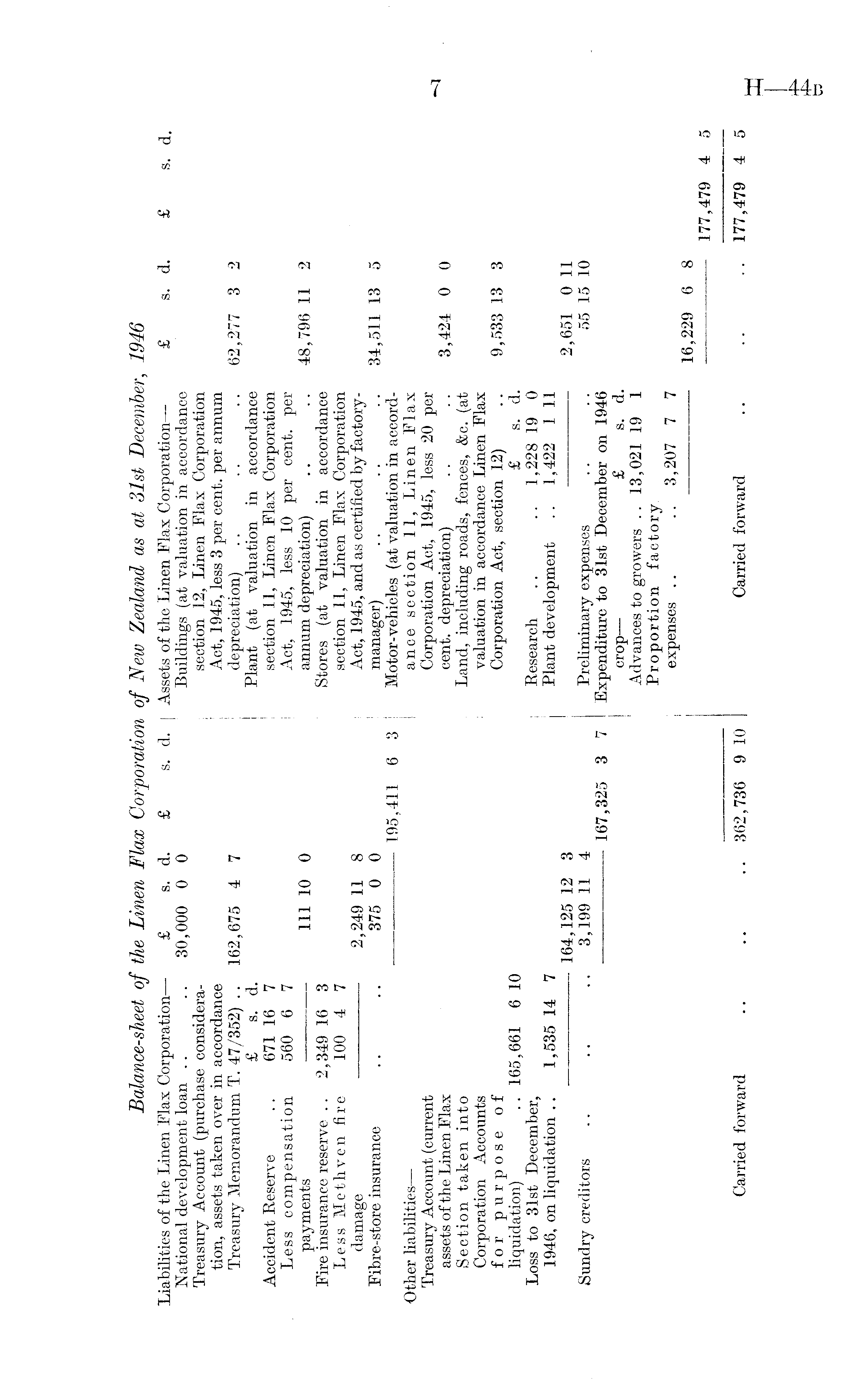 Balance-sheet of the Linen Flax Corporation of New Zealand as at 31st December, 1946 Liabilities of the Linen Flax Corporation— £ s. d. £ s. d. Assets of the Linen Flax Corporation— £ s. d. £ s. d. National development loan .. .. 30,000 0 0 Buildings (at valuation in accordance Treasury Account (purchase considera- section 12, Linen Flax Corporation tion, assets taken over in accordance Act, 1945, less 3 per cent, per annum Treasury Memorandum T. 47/352) .. 162,675 4 7 depreciation) .. .. .. 62,277 3 2 £ s. d. Plant (at valuation in accordance Accident Reserve .. 671 16 7 section 11, Linen Flax Corporation Less compensation 560 6 7 Act, 1945, less 10 per cent, per payments 111 10 0 annum depreciation) .. .. 48,796 11 2 Fire insurance reserve .. 2,349 16 3 Stores (at valuation in accordance Less Methven fire 100 4 7 section 11, Linen Flax Corporation damage 2,249 11 8 Act, 1945, and as certified by factory-Fibre-store insurance .. .. 375 0 0 manager) .. .. .. 34,511 13 5 195,411 6 3 Motor-vehicles (at valuation in accordOther liabilities— ance section 11, Linen Flax Treasury Account (current Corporation Act, 1945, less 20 per assets of the Linen Flax cent, depreciation) .. .. 3,424 0 0 Section taken into Land, including roads, fences, &c. (at Corporation Accounts valuation in accordance Linen Flax for purpose of Corporation Act, section 12) .. 9,533 13 3 liquidation) .. 165,661 6 10 £ s. d. Loss to 31st December, Research .. .. 1,228 19 0 1946, on liquidation .. 1,535 14 7 Plant development .. 1,422 111 164,125 12 3 2,651 0 11 Sundry creditors .. .. .. 3,199 11 4 Preliminary expenses .. .. 55 15 10 167,325 3 7 Expenditure to 31st December on 1946 crop— £ s. d. Advances to growers .. 13,021 19 1 Proportion factory. expenses .. .. 3,207 7 7 ■ 16,229 6 8 177,479 4 5 Carried forward .. .. .. 362,736 9 10 Carried forward .. .. .. 177,479 4 5