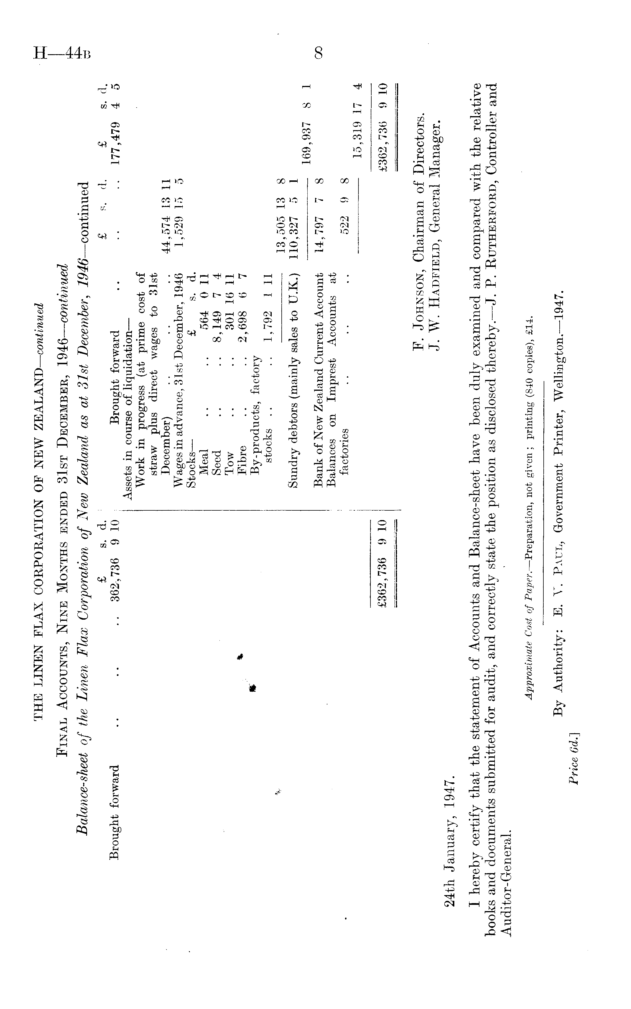 F. Johnson, Chairman of Directors. J. W. Hadfield, General Manager. 24th January, 1947. I hereby certify that the statement of Accounts and Balance-sheet have been duly examined and compared with the relative books and documents submitted for audit, and correctly state the position as disclosed thereby.— J. P. Rutherford, Controller and Auditor-General. Approximate Cost of Paper. — Preparation, not given ; printing (840 copies), £l4.