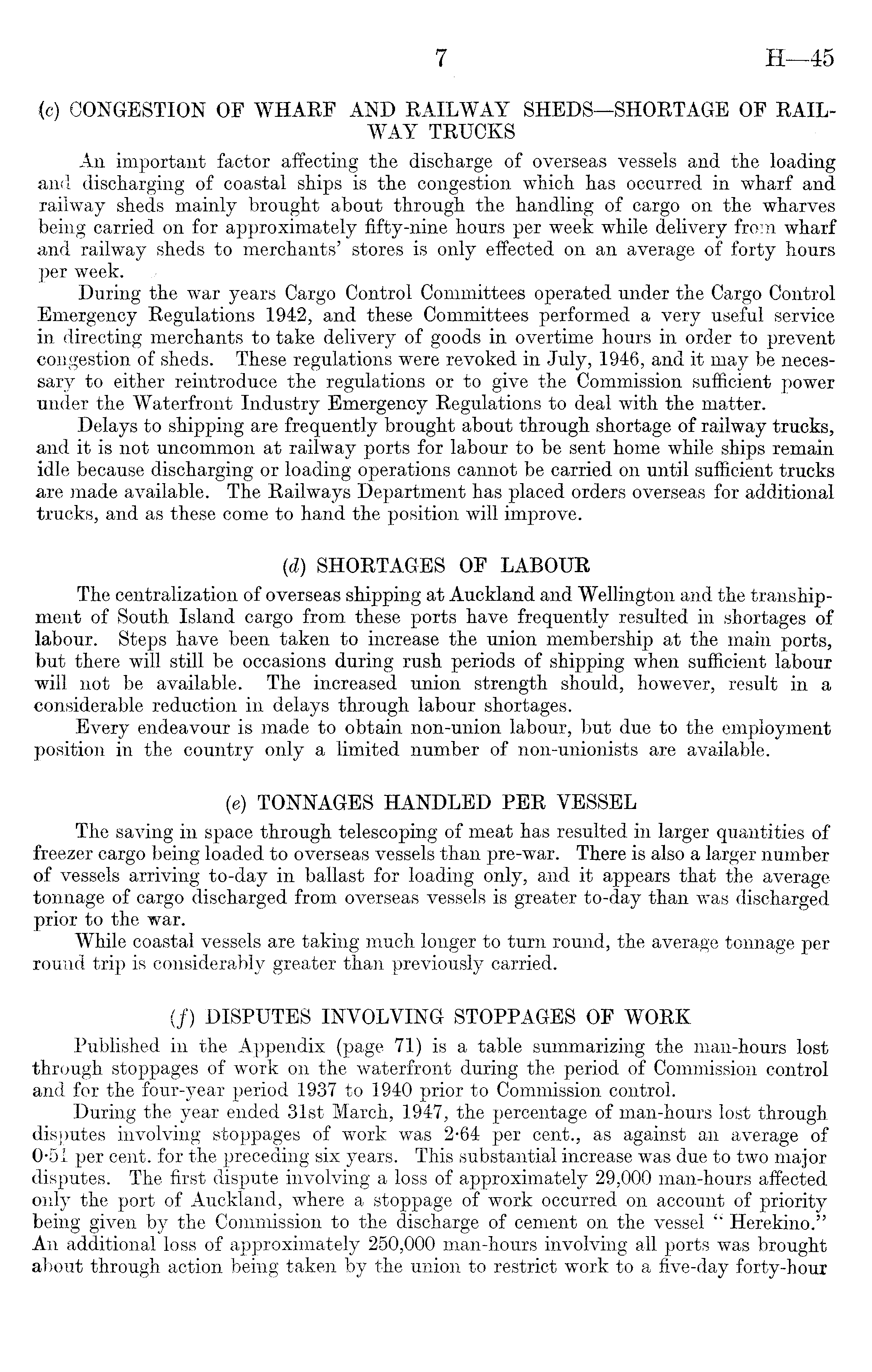 (c) CONGESTION OF WHARF AND RAILWAY SHEDS—SHORTAGE OF RAILWAY TRUCKS An important factor affecting the discharge of overseas vessels and the loading and discharging of coastal ships is the congestion which has occurred in wharf and railway sheds mainly brought about through the handling of cargo on the wharves being carried on for approximately fifty-nine hours per week while delivery from wharf and railway sheds to merchants' stores is only effected on an average of forty hours per week. During the war years Cargo Control Committees operated under the Cargo Control Emergency Regulations 1942, and these Committees performed a very useful service in directing merchants to take delivery of goods in overtime hours in order to prevent congestion of sheds. These regulations were revoked in July, 1946, and it may be necessary to either reintroduce the regulations or to give the Commission sufficient power under the Waterfront Industry Emergency Regulations to deal with the matter. Delays to shipping are frequently brought about through shortage of railway trucks, and it is not uncommon at railway ports for labour to be sent home while ships remain idle because discharging or loading operations cannot be carried on until sufficient trucks are made available. The Railways Department has placed orders overseas for additional trucks, and as these come to hand the position will improve. (d) SHORTAGES OF LABOUR The centralization of overseas shipping at Auckland and Wellington and the transhipment of South Island cargo from these ports have frequently resulted in shortages of labour. Steps have been taken to increase the union membership at the main ports, but there will still be occasions during rush periods of shipping when sufficient labour will not be available. The increased union strength should, however, result in a considerable reduction in delays through labour shortages. Every endeavour is made to obtain non-union labour, but due to the employment position in the country only a limited number of non-unionists are available. (e) TONNAGES HANDLED PER VESSEL The saving in space through telescoping of meat has resulted in larger quantities of freezer cargo being loaded to overseas vessels than pre-war. There is also a larger number of vessels arriving to-day in ballast for loading only, and it appears that the average tonnage of cargo discharged from overseas vessels is greater to-day than was discharged prior to the war. While coastal vessels are taking much longer to turn round, the average tonnage per round trip is considerably greater than previously carried. (/) DISPUTES INVOLVING STOPPAGES OF WORK Published in the Appendix (page 71) is a table summarizing the man-hours lost through stoppages of work on the waterfront during the period of Commission control and for the four-year period 1937 to 1940 prior to Commission control. During the year ended 31st March, 1947, the percentage of man-hours lost through disputes involving stoppages of work was 2-64 per cent., as against an average of 0-51 per cent, for the preceding six years. This substantial increase was due to two major disputes. The first dispute involving a loss of approximately 29,000 man-hours affected only the port of Auckland, where a stoppage of work occurred on account of priority being given by the Commission to the discharge of cement on the vessel " Herekino." An additional loss of approximately 250,000 man-hours involving all ports was brought about through action being taken by the union to restrict work to a five-day forty-hour
